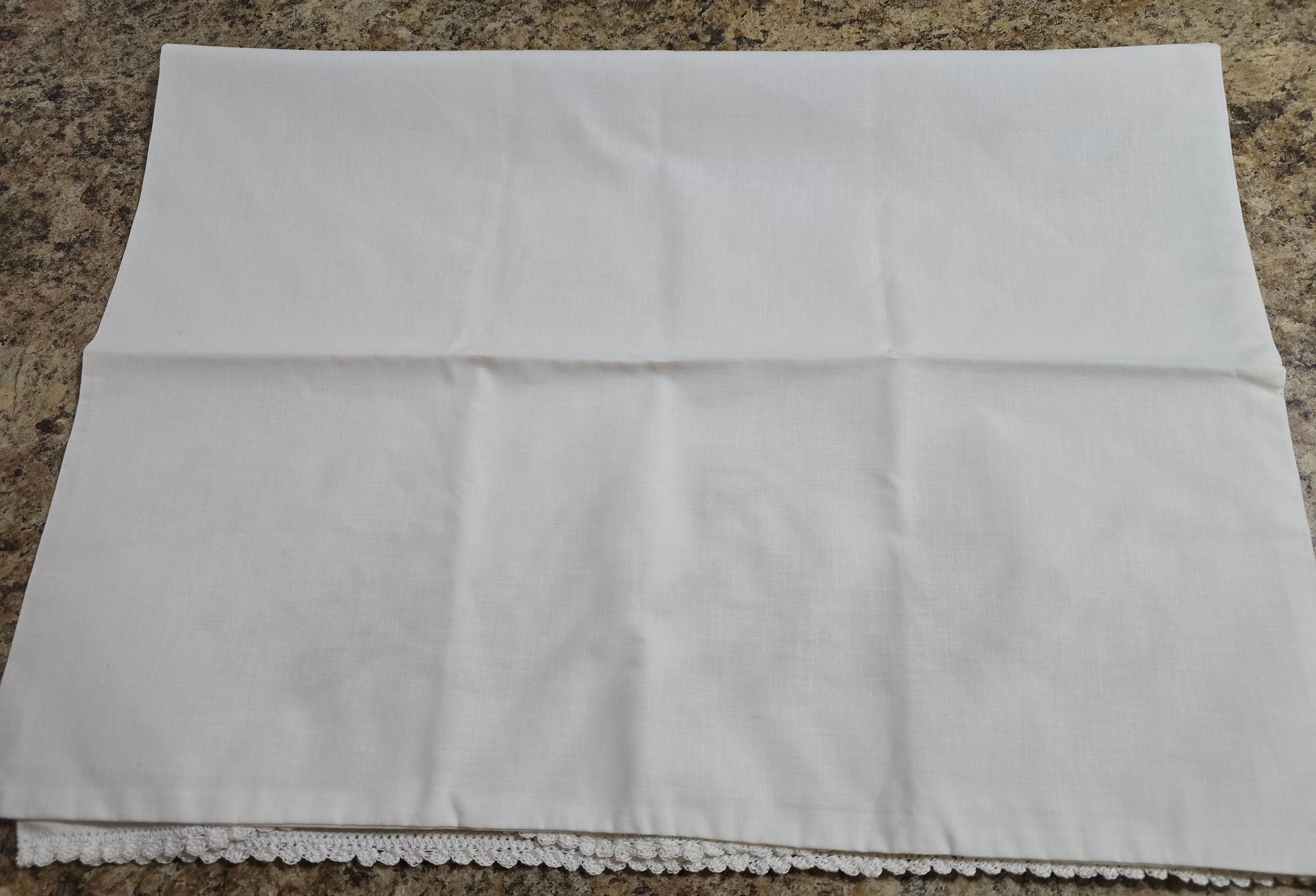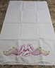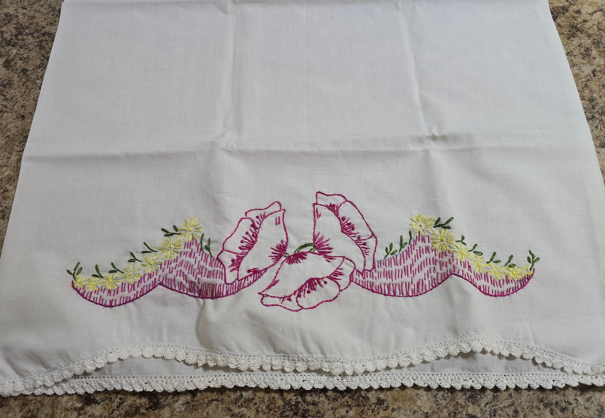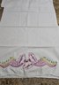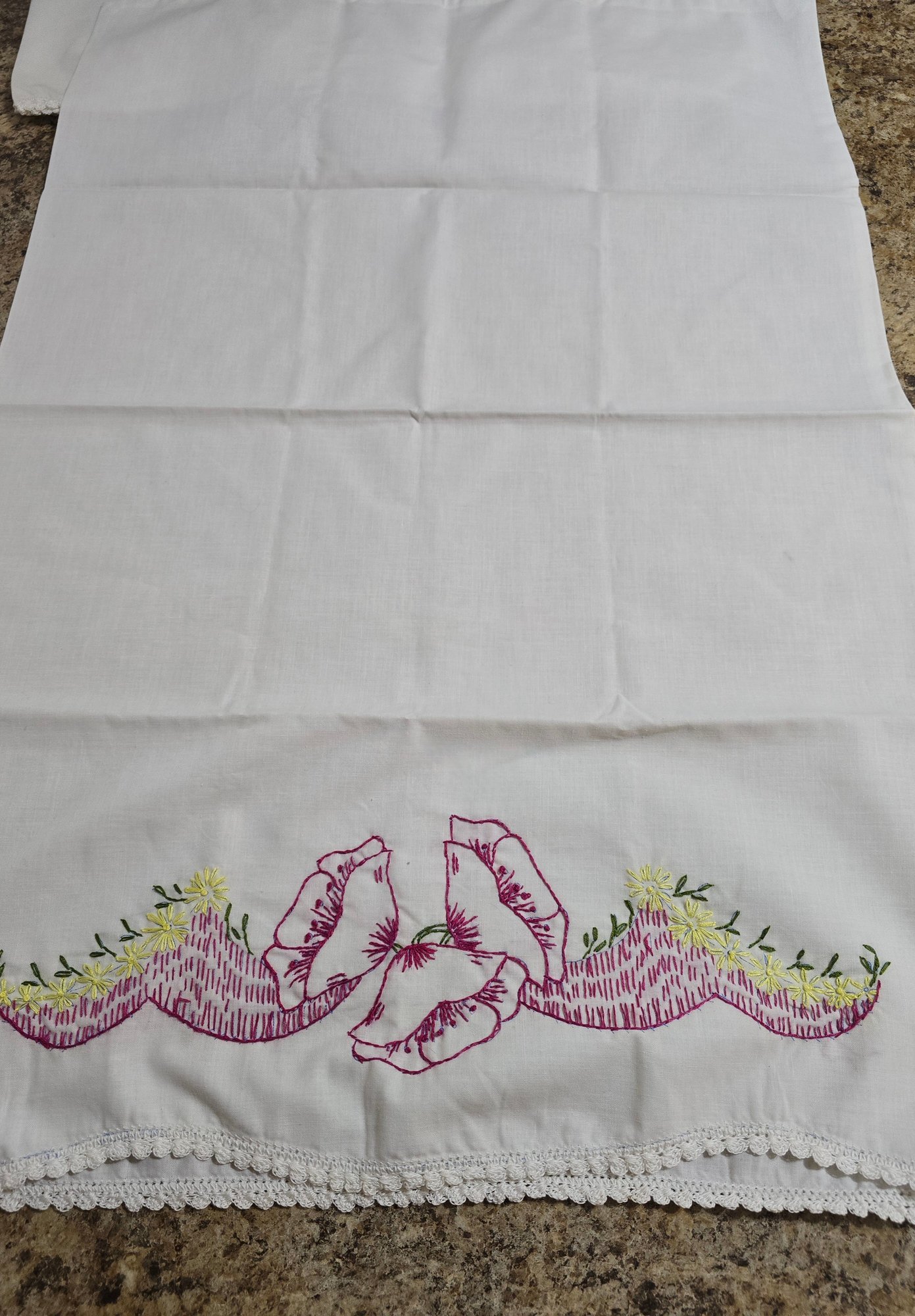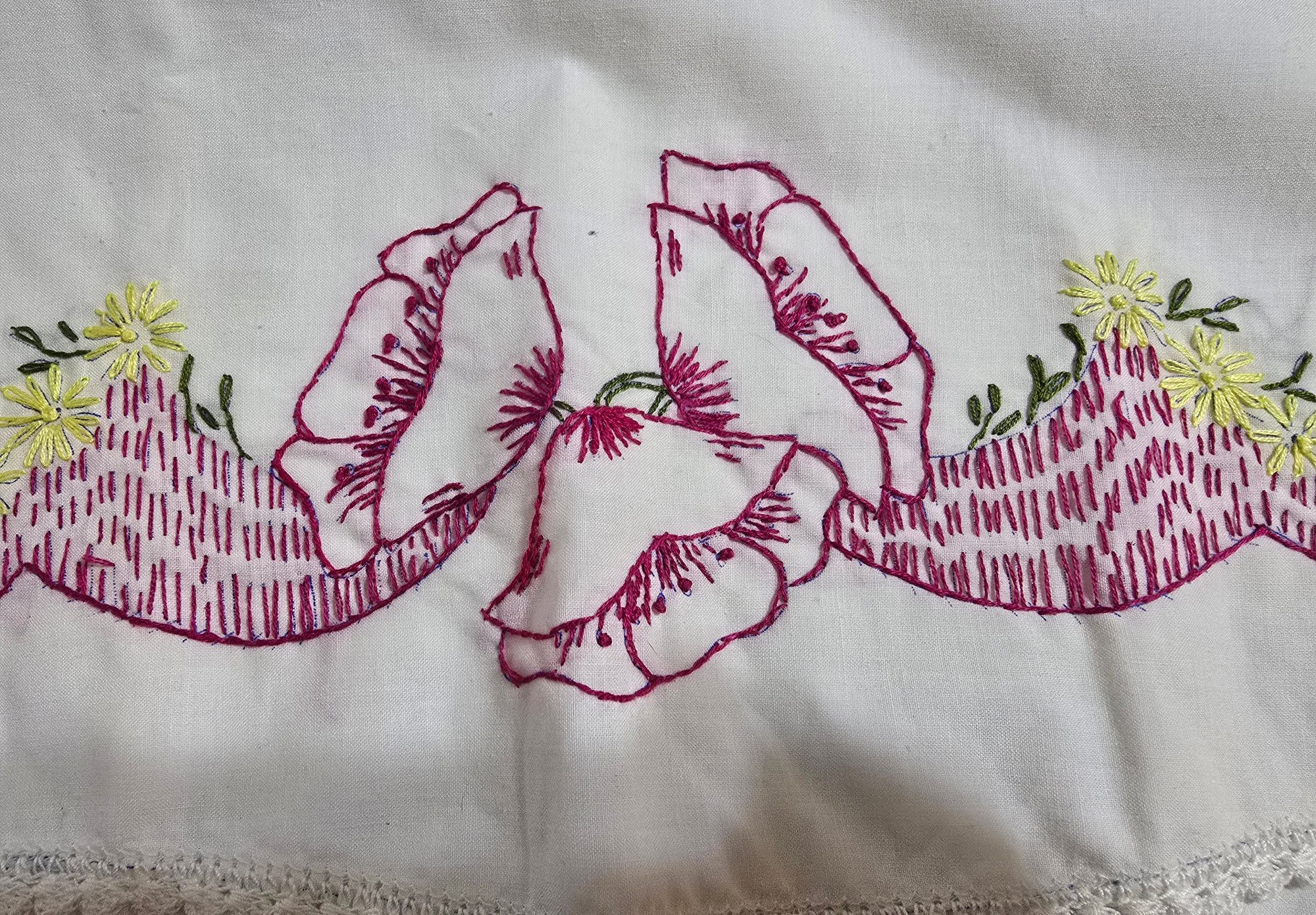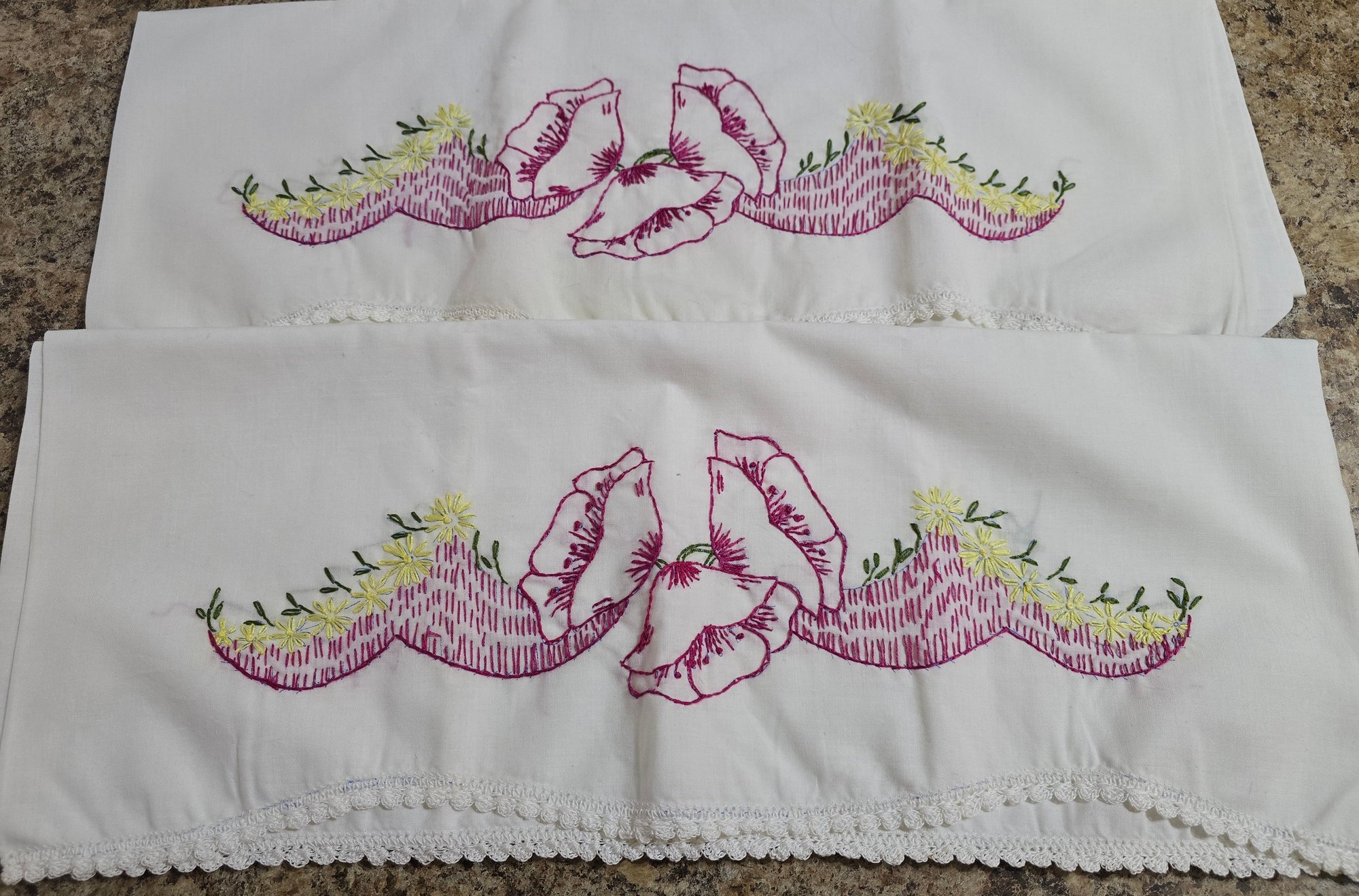 Vintage pillowcases featuring hand-embroidered floral designs in shades of pink, yellow, and green, complete with lace trim. Please see all pics for details.