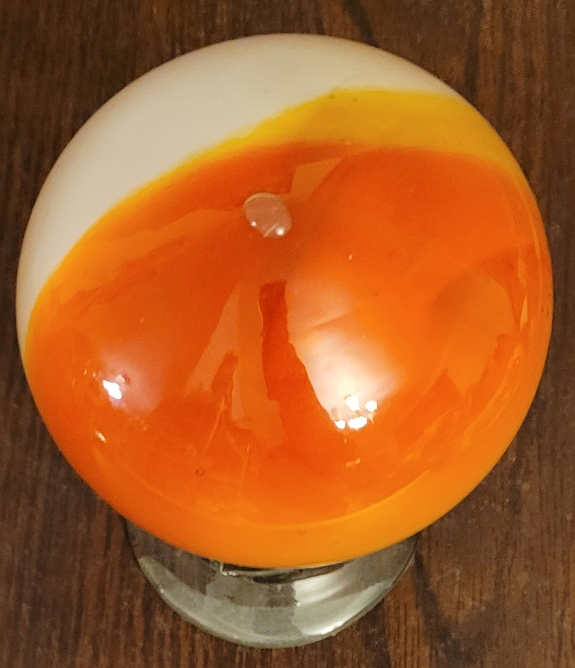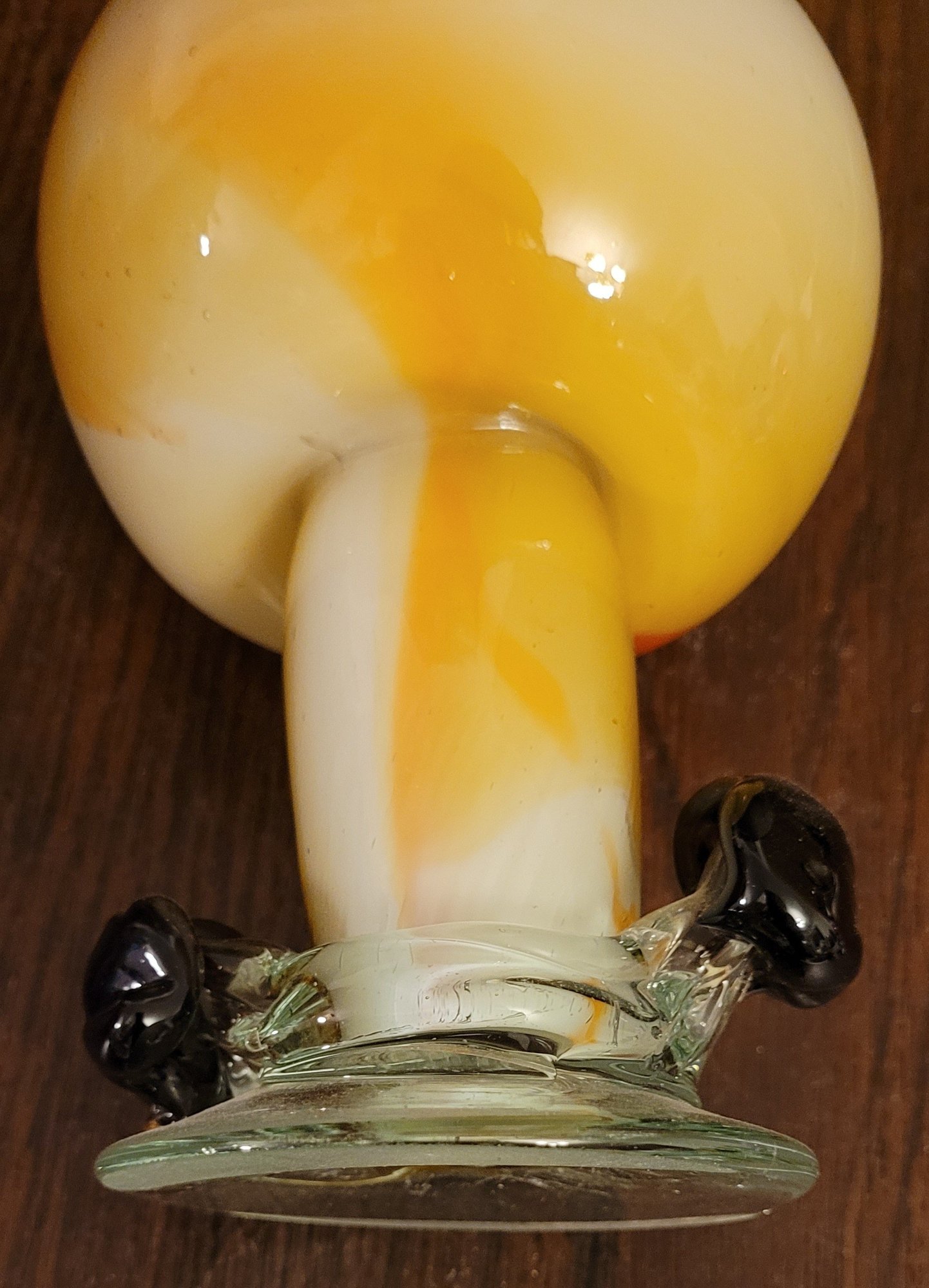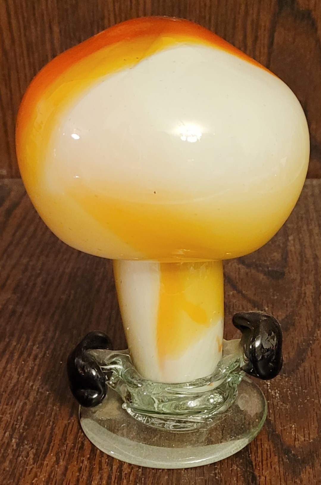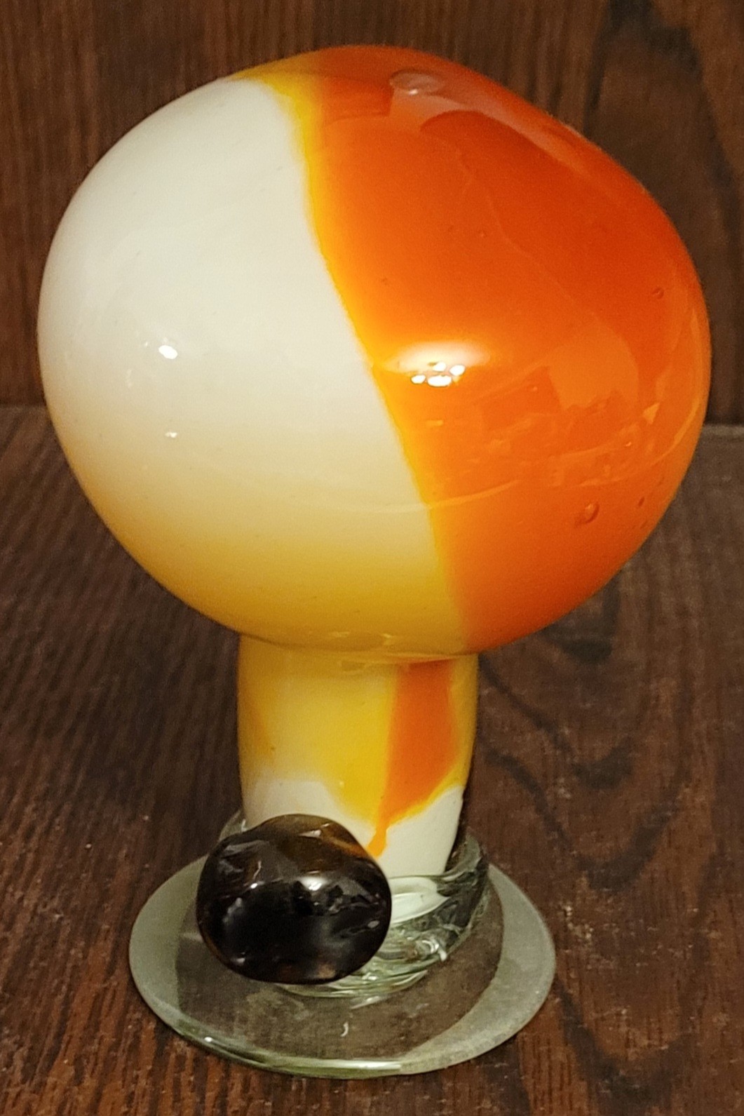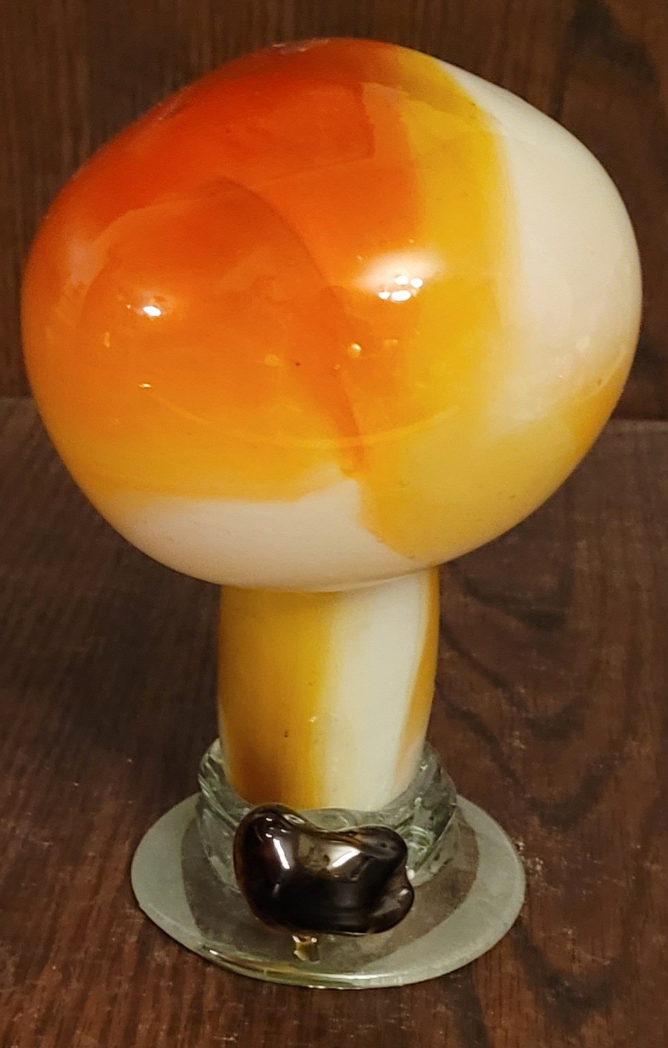 This vintage handblown art glass paperweight is a charming addition to any collection, boasting a vibrant orange and white swirl pattern that captures the eye. The unmarked piece features a delightful mushroom cluster theme, which adds a touch of whimsy to its decorative appeal. Crafted from quality glass materials, this item showcases the skill of traditional art glass production techniques. Ideal for desk or display, this paperweight's multicolored design and intricate details make it a versatile piece that complements various decor styles. Its origins are unspecified, adding an air of mystery to its already appealing aesthetic. Whether it's for personal enjoyment or as a thoughtful gift, this mushroom cluster paperweight is sure to be a conversation starter.