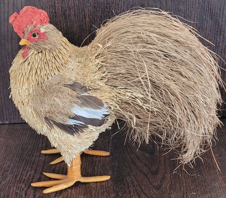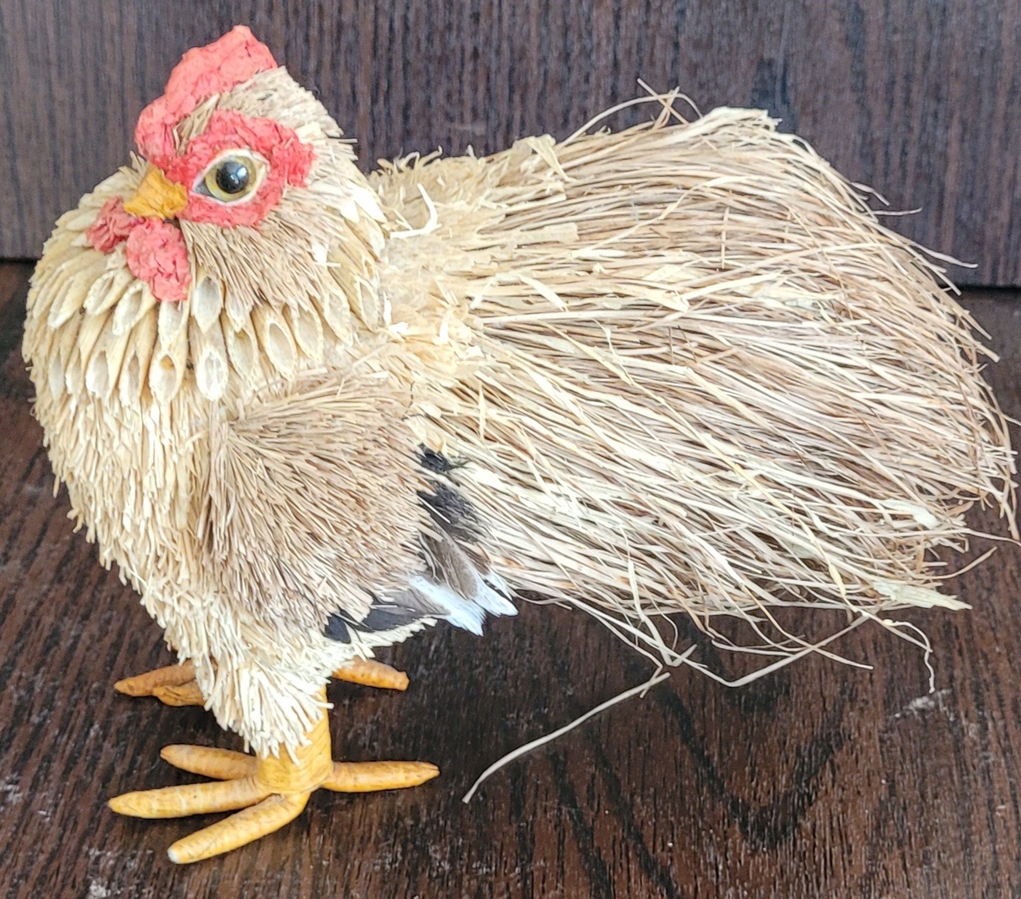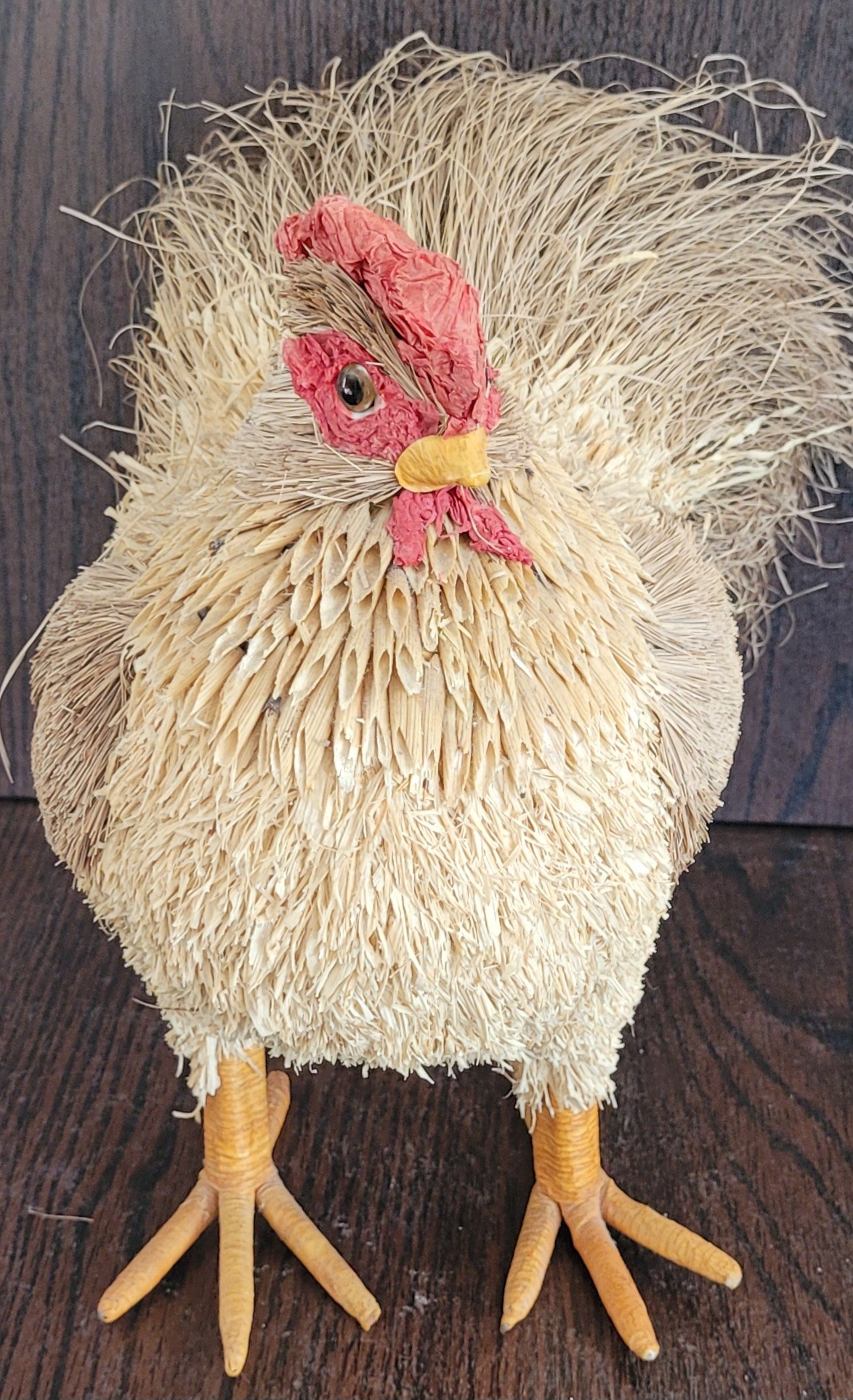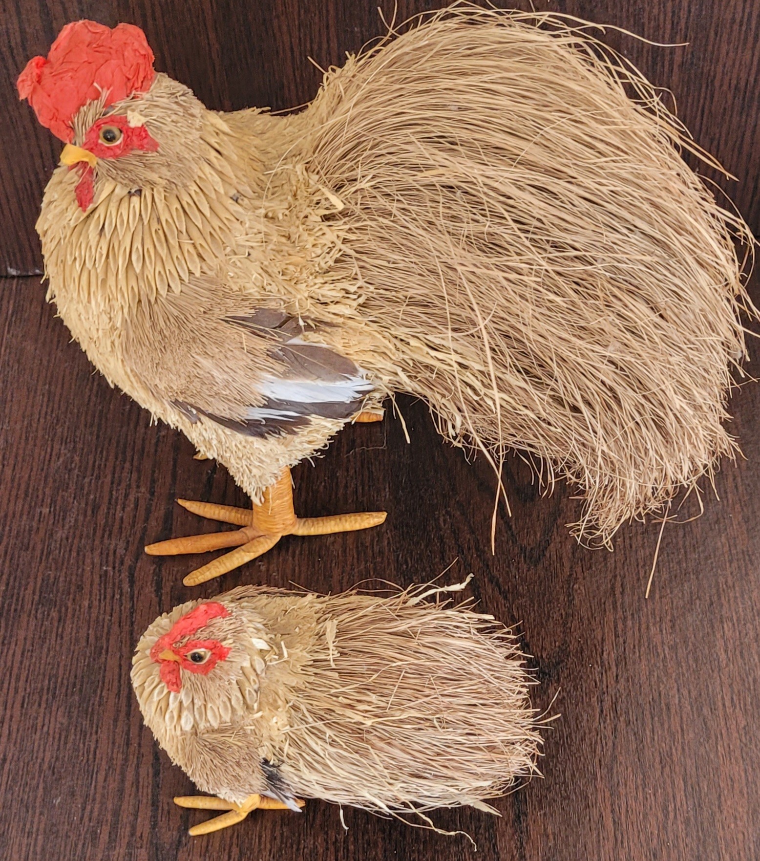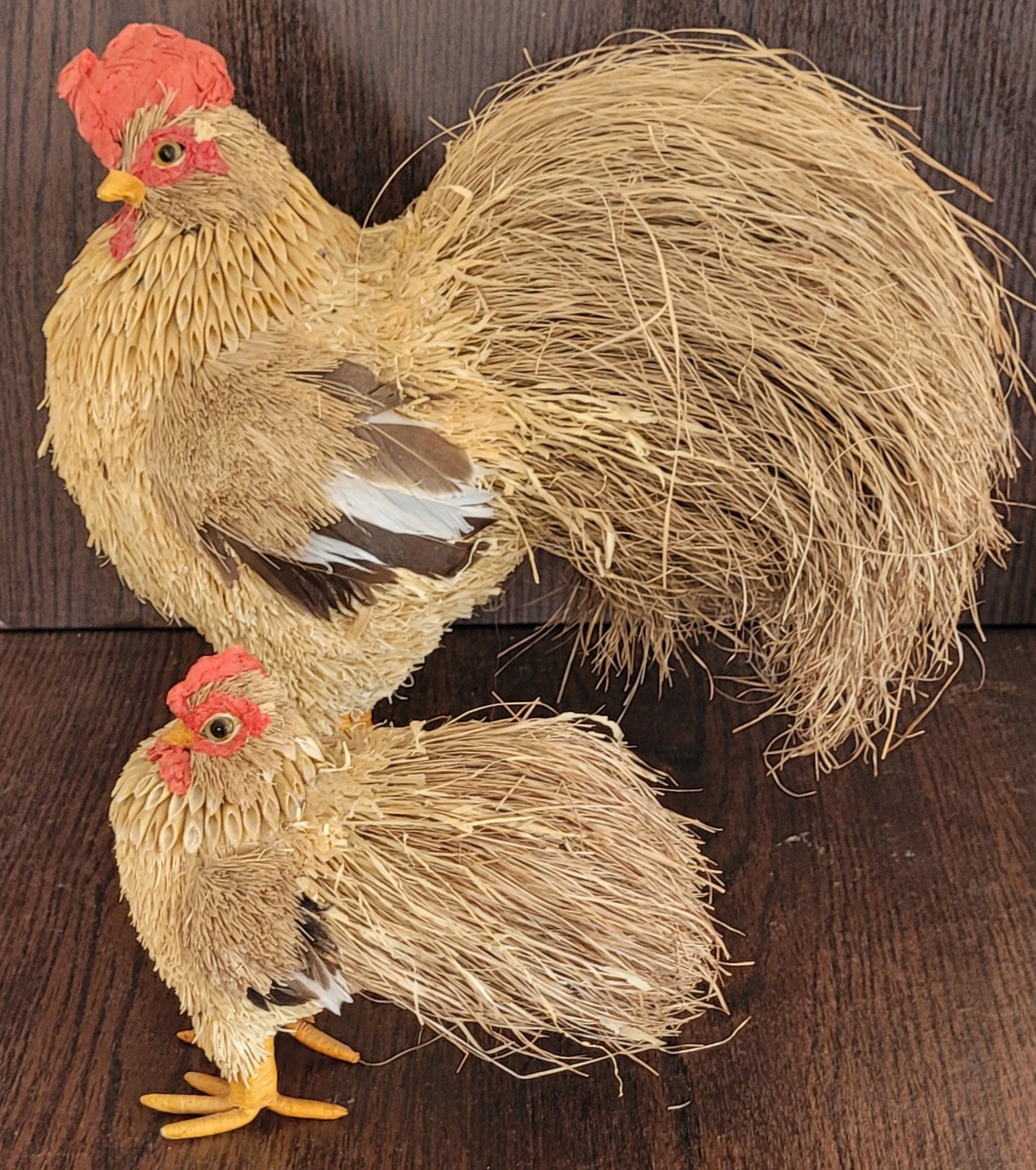 These are made out of straw and feathers. One measures 11" tall by 12.5" long and the other one measures 5.5" tall by 7" long. See pictures for details.