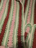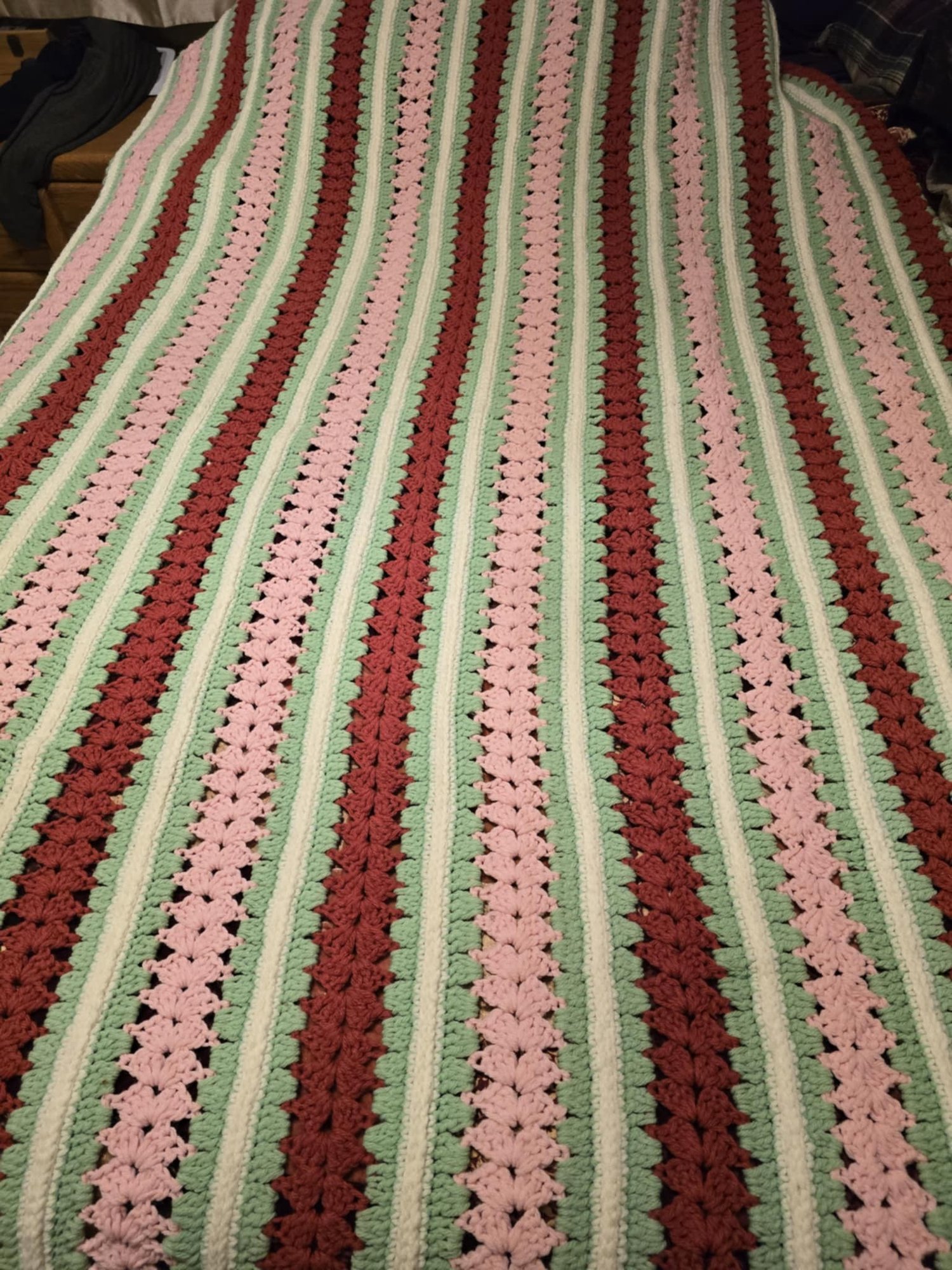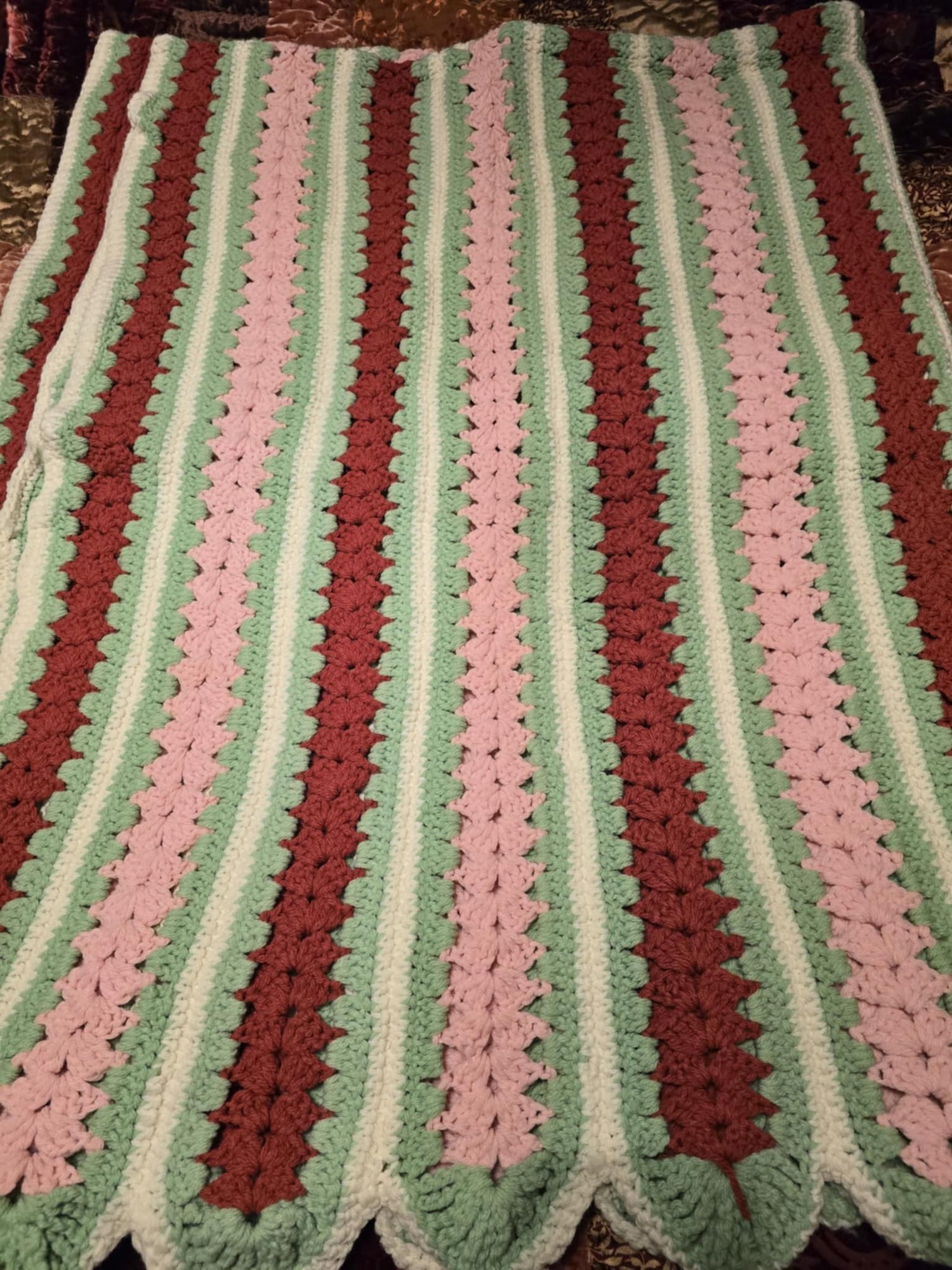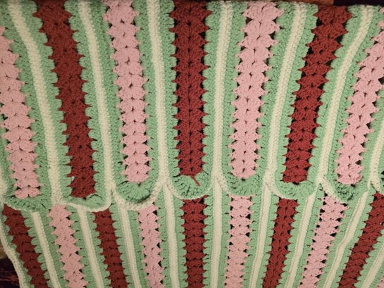 Vintage handmade crocheted afghan or throw blanket with a striped pattern and scalloped edges. measures approximately 60 x 76.