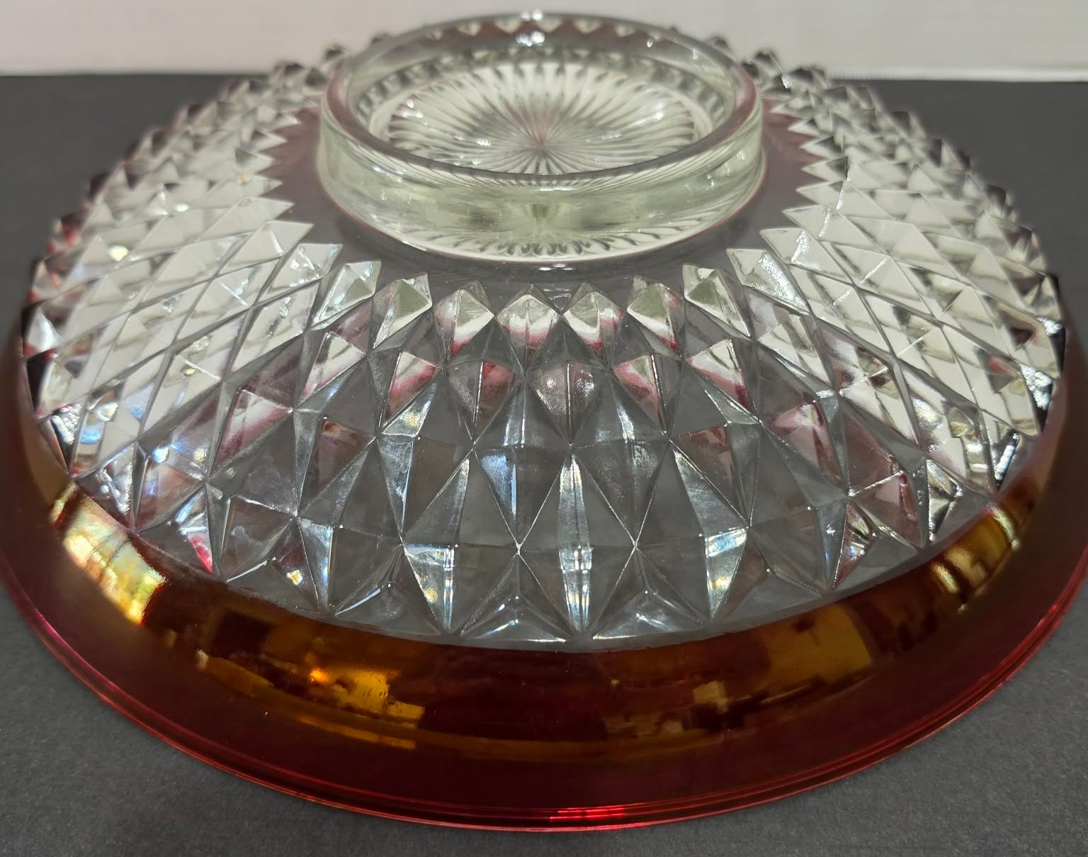 Vintage Indiana Glass large bowl featuring the "Diamond Point" pattern with a ruby red flash band around the rim. No cracks or chips noted.