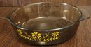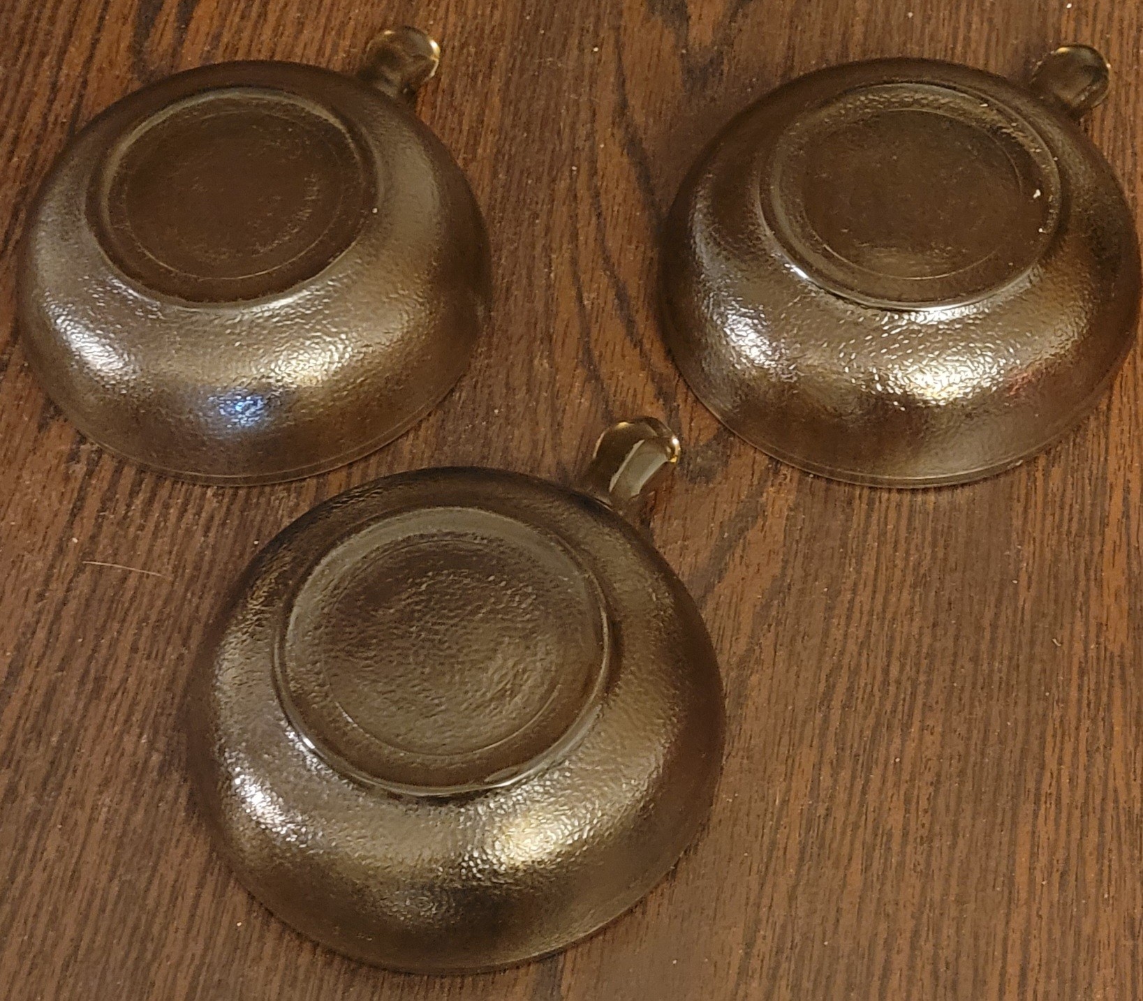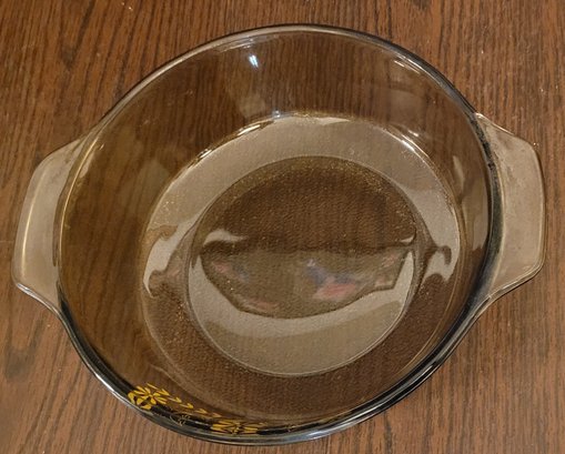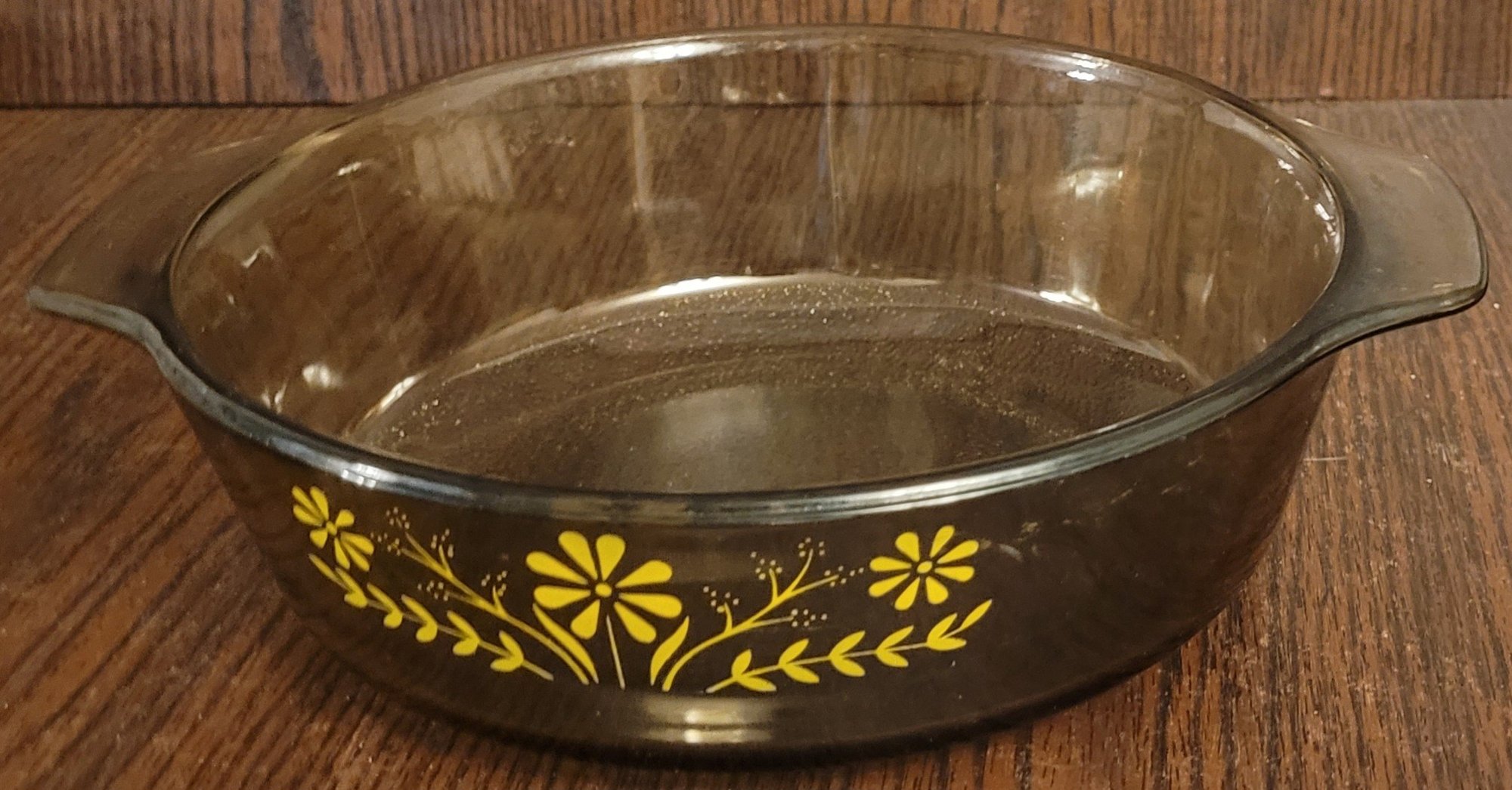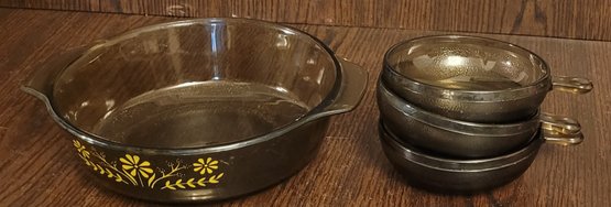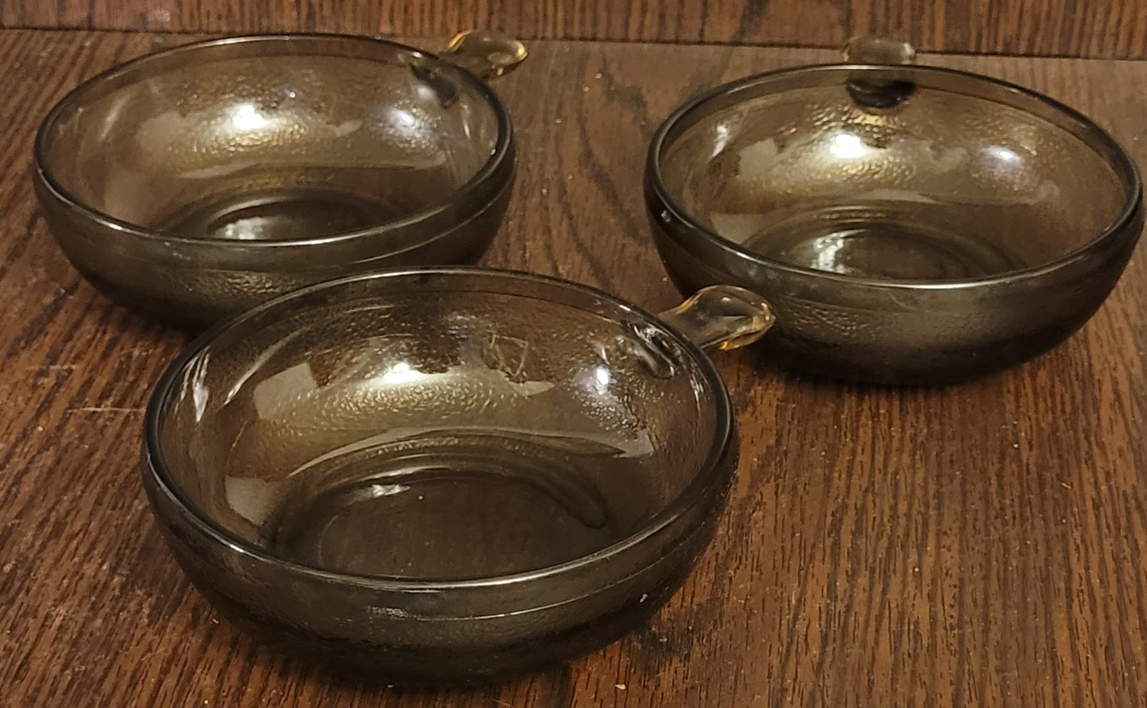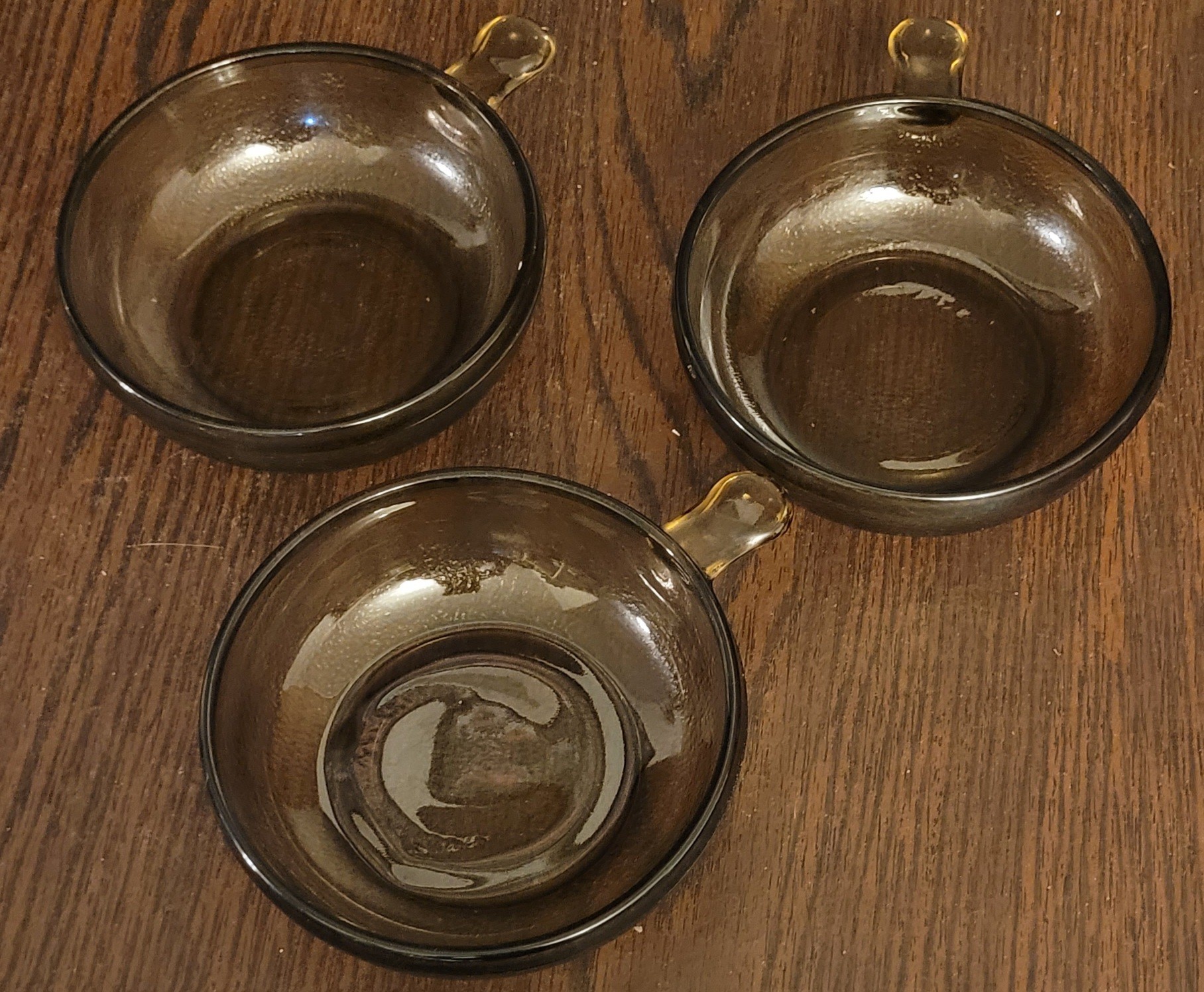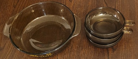 These are a smokey brown color. The bowls measure 1.75" tall by 5" in diameter and the casserole measures 2.5" tall by 8.5" in diameter. See pictures for details.