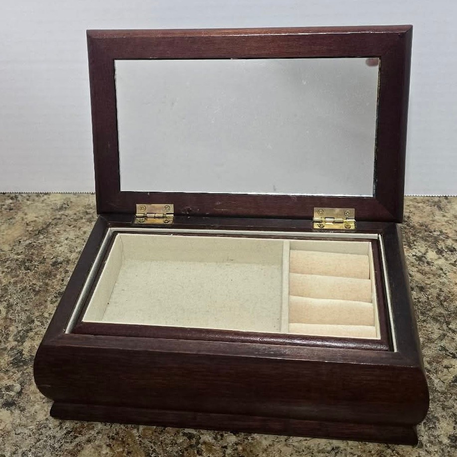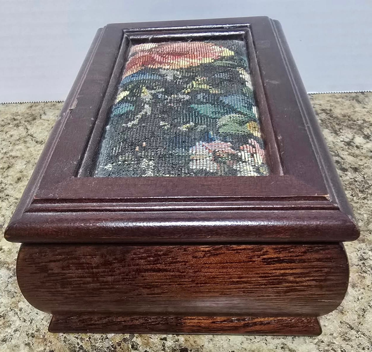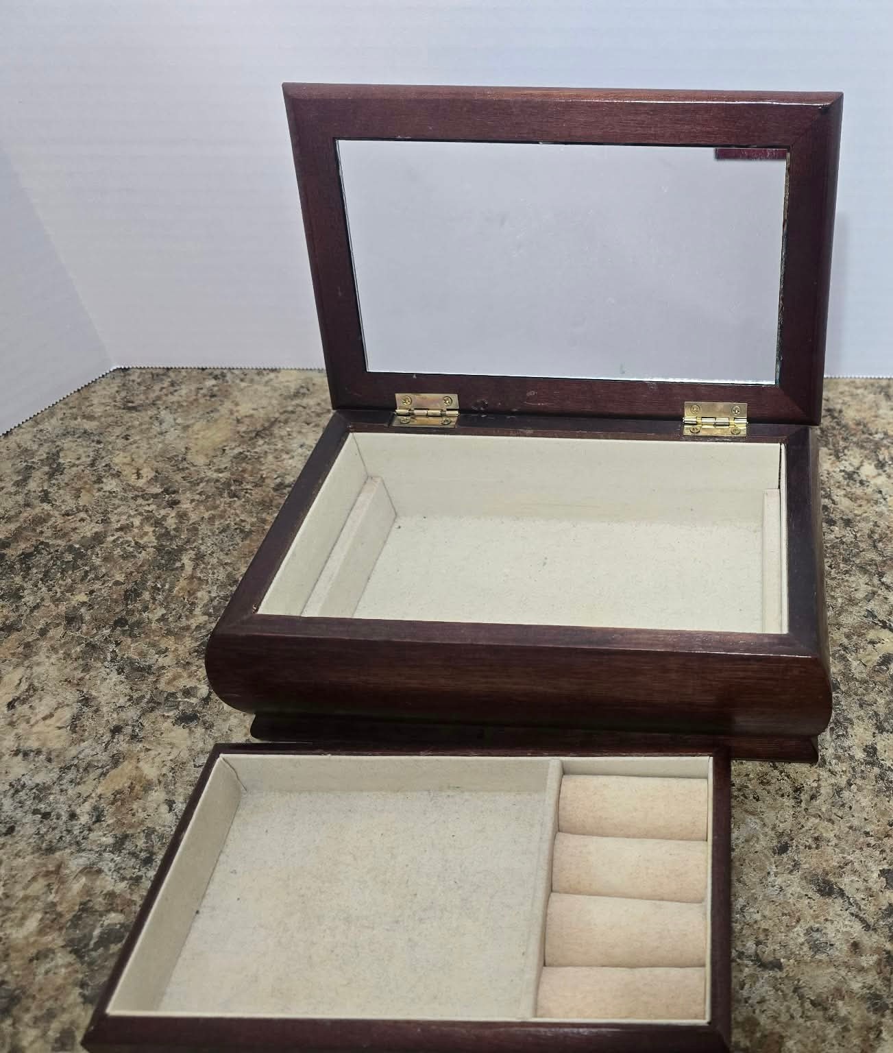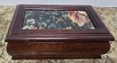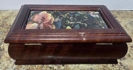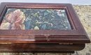 Vintage Jewelry Box Wooden Lift Out Tray Ring Holder Needlepoint Fabric Mirror. Measures 8.25 x 5 x 2.5.