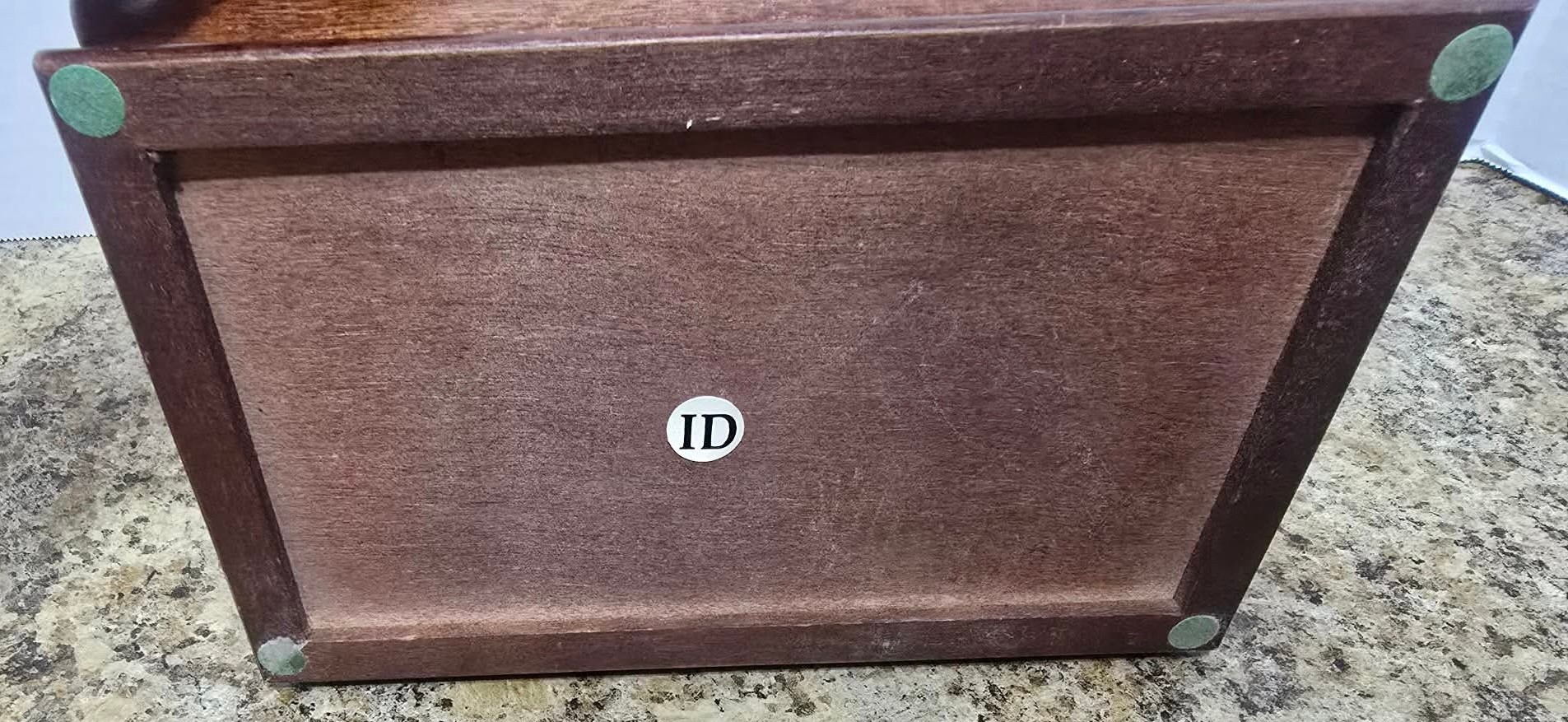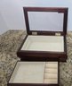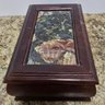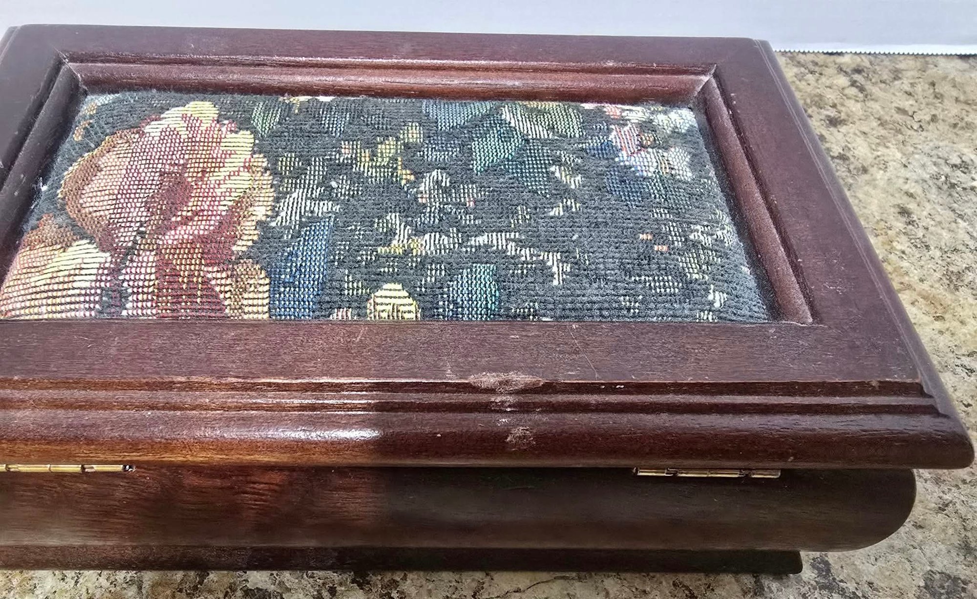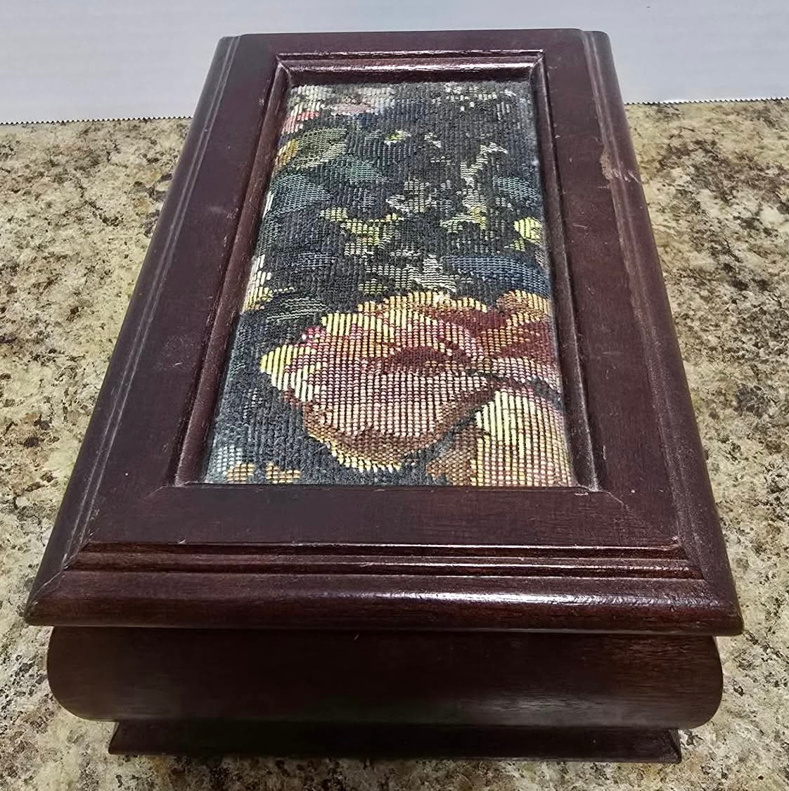 Vintage Jewelry Box Wooden Lift Out Tray Ring Holder Needlepoint Fabric Mirror. Measures 8.25 x 5 x 2.5.