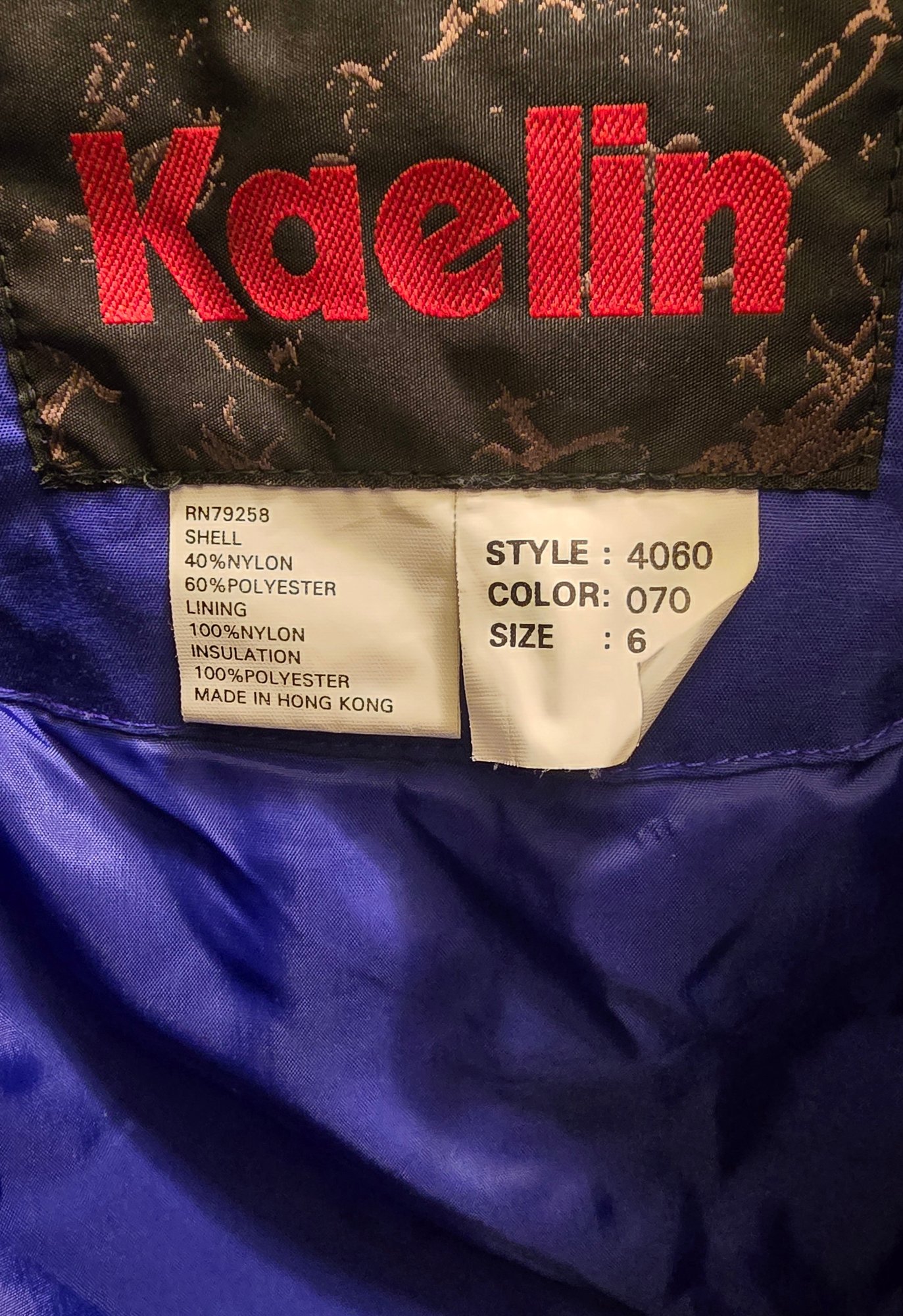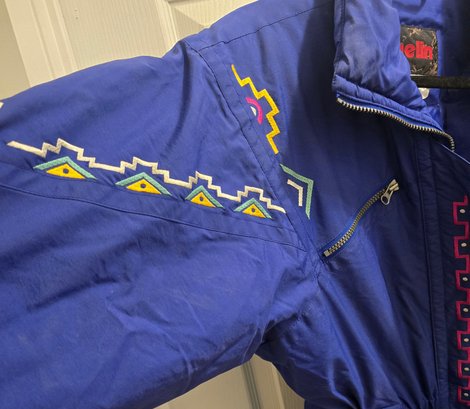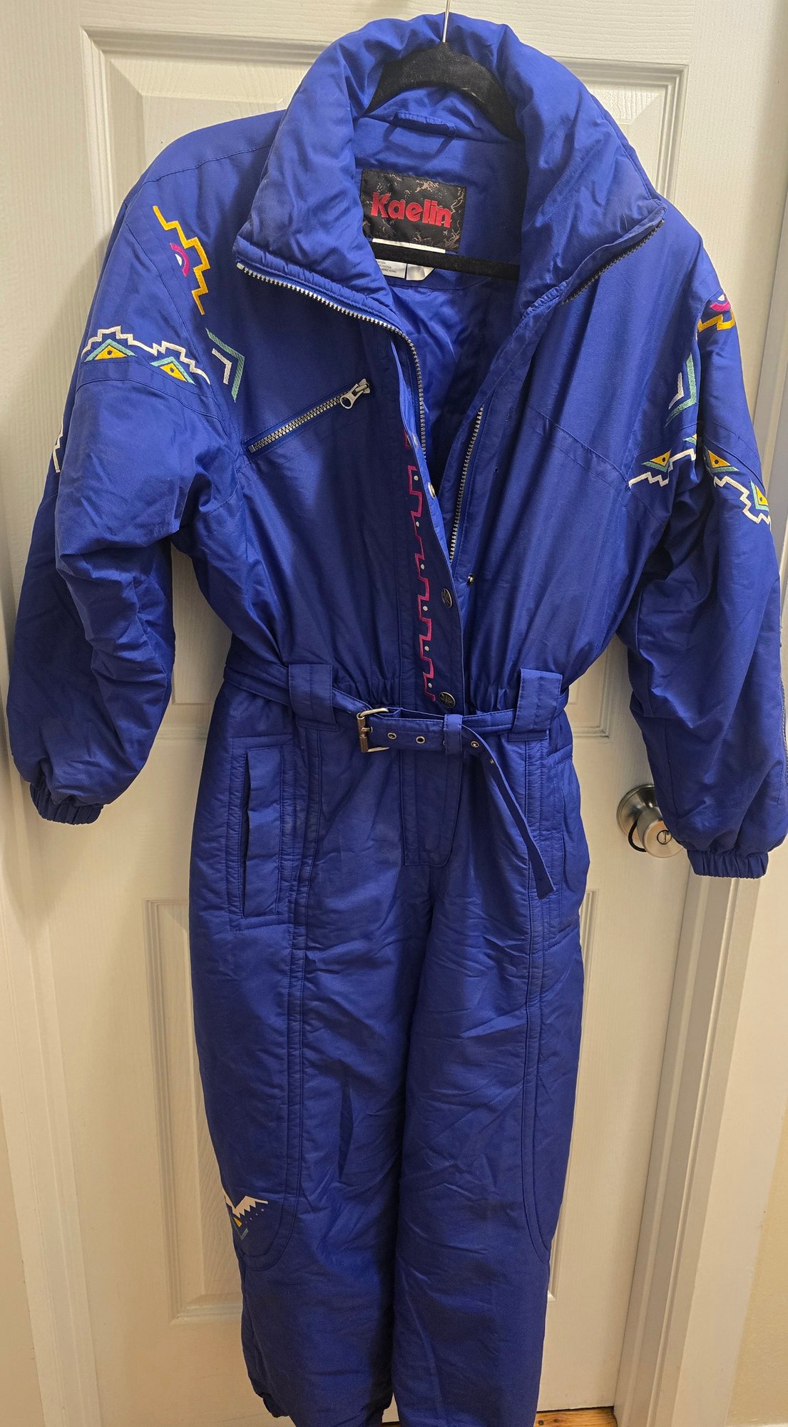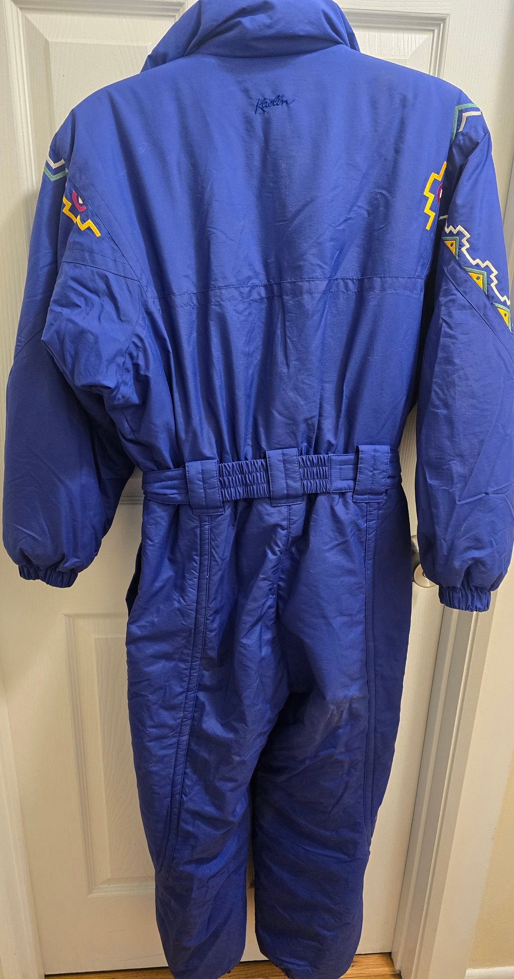 Vintage Kaelin royal blue one-piece ski jumpsuit from the 1980s or 1990s, featuring geometric embroidery and an adjustable waist belt. Size 6. Good used condition. Please see all pics for details.