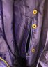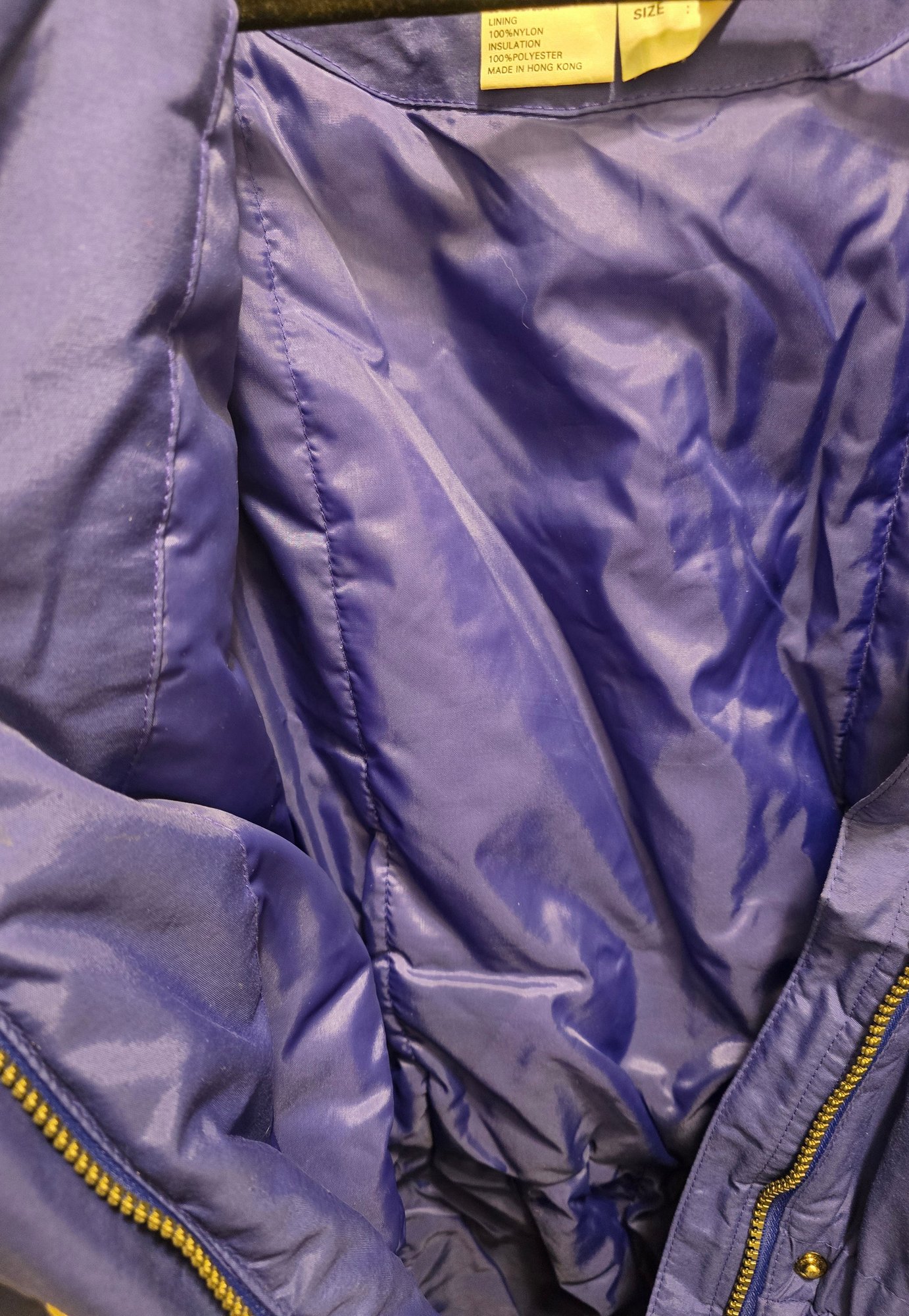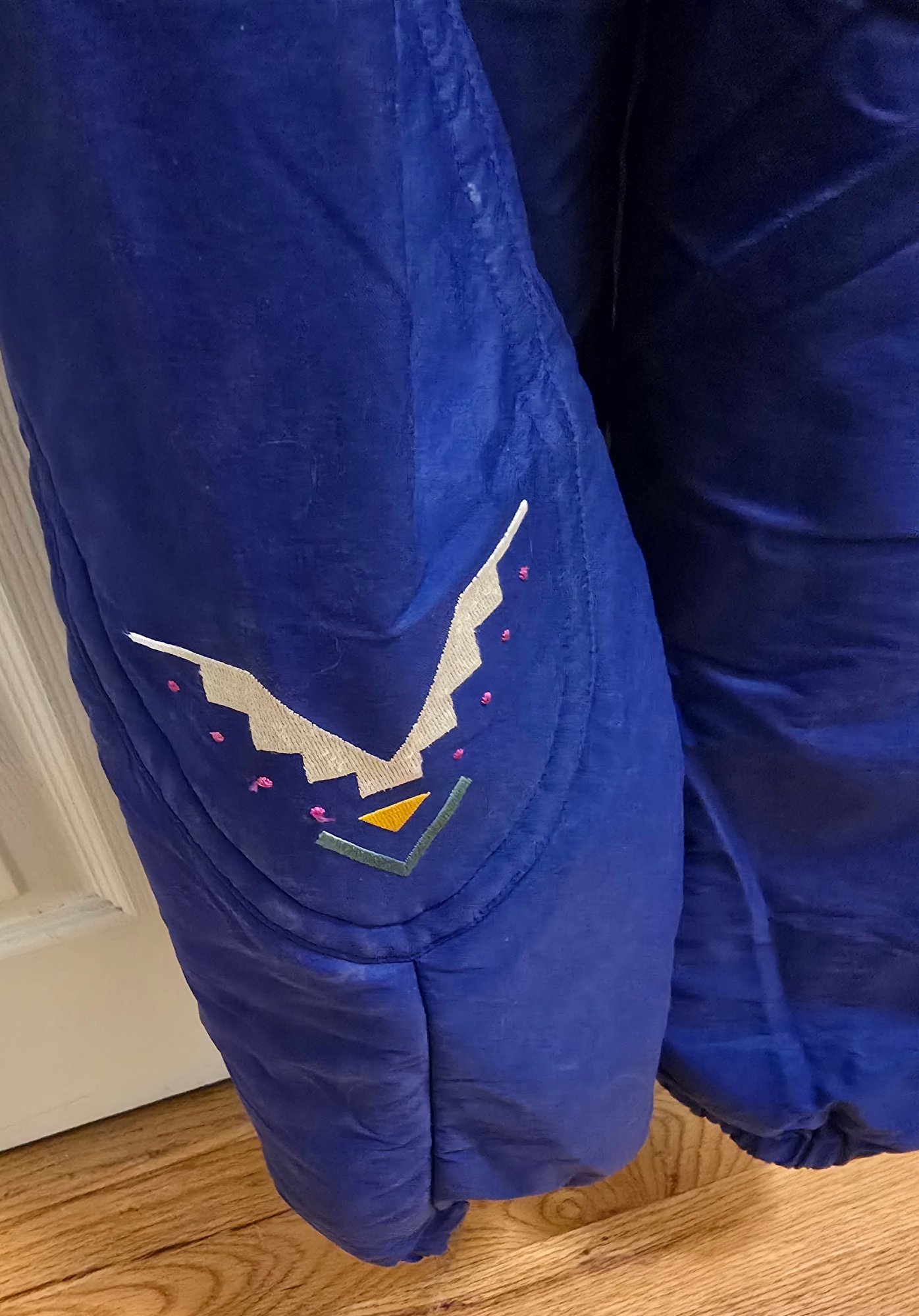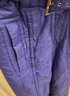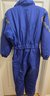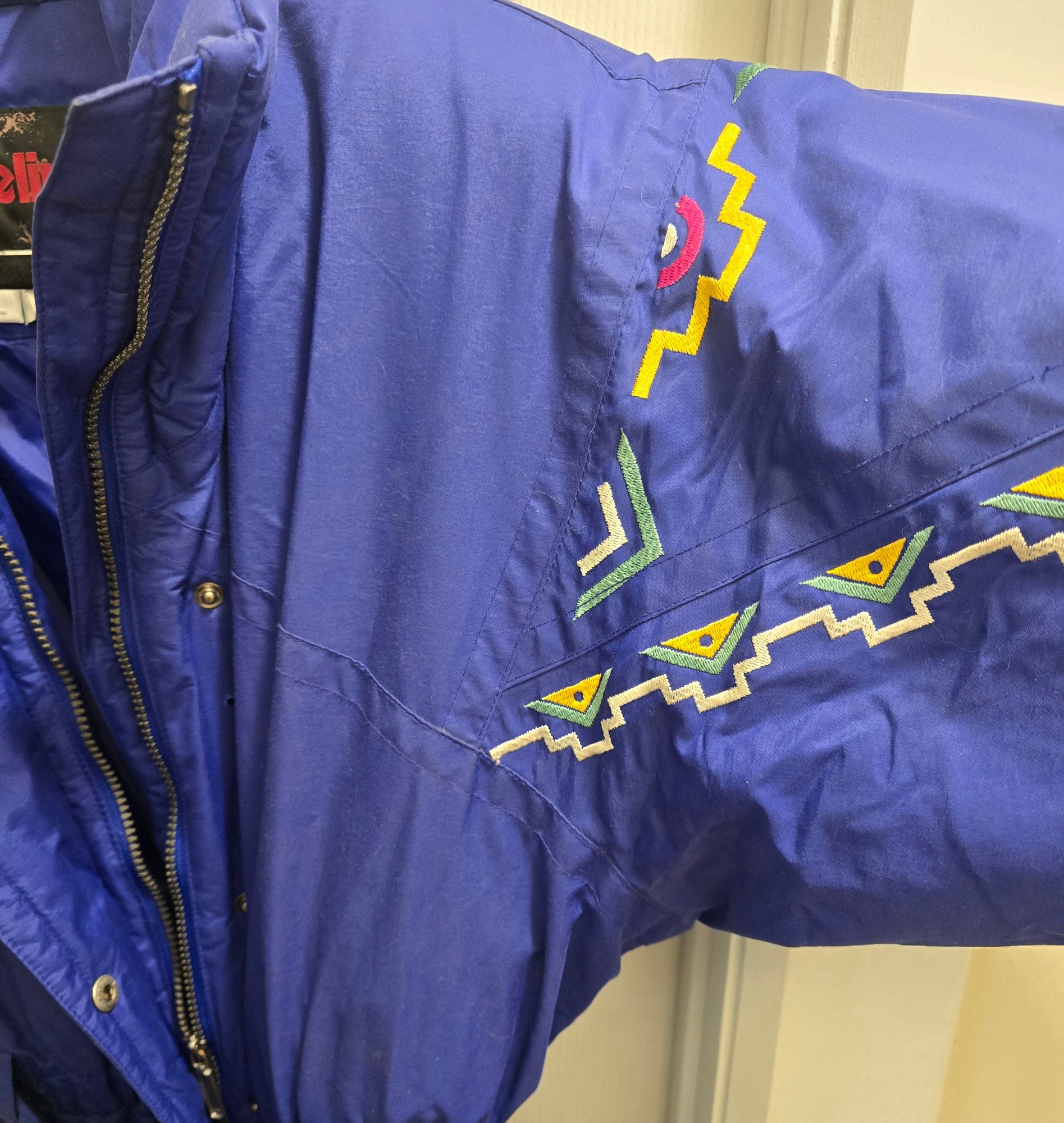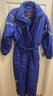 Vintage Kaelin royal blue one-piece ski jumpsuit from the 1980s or 1990s, featuring geometric embroidery and an adjustable waist belt. Size 6. Good used condition. Please see all pics for details.