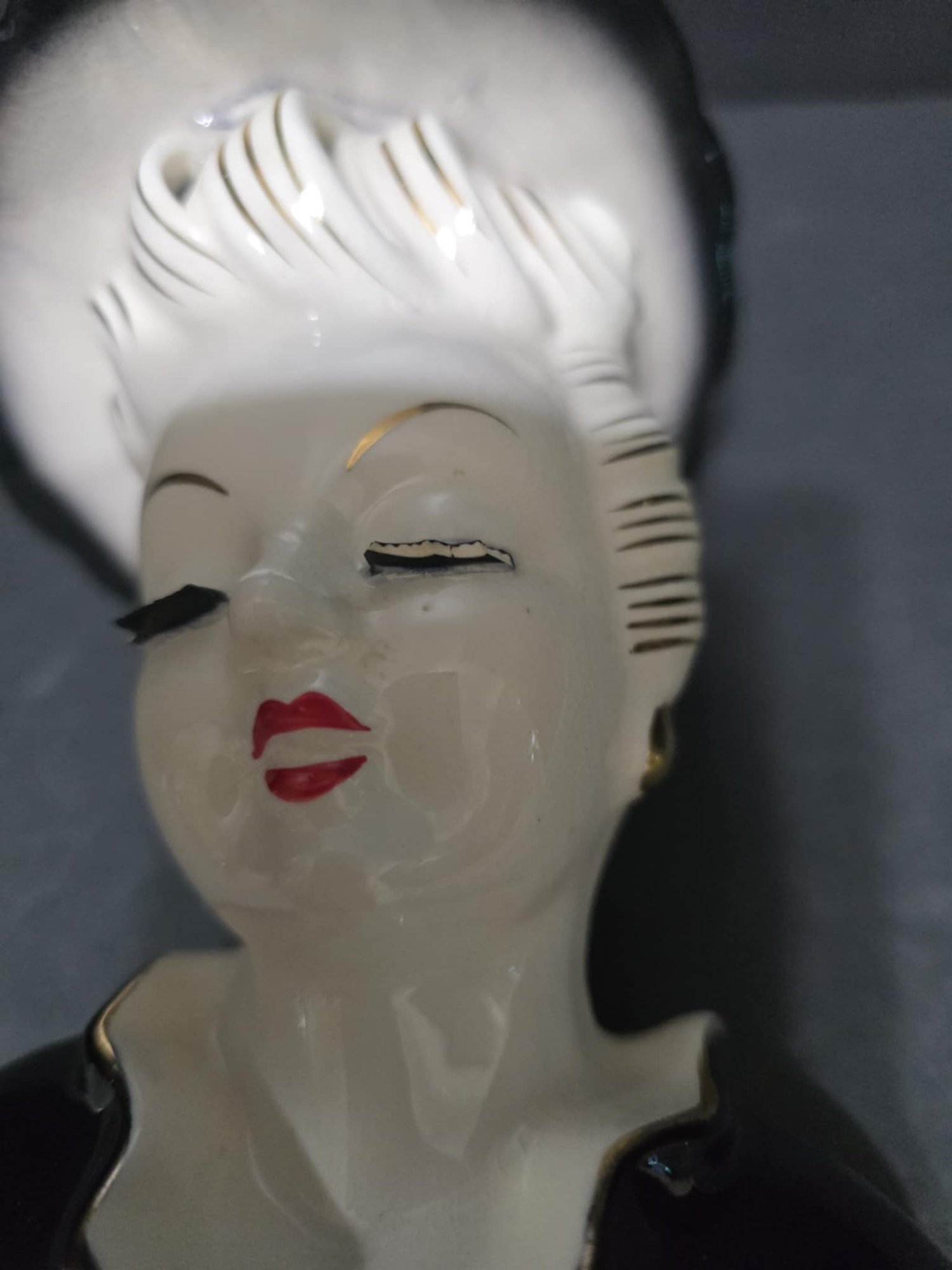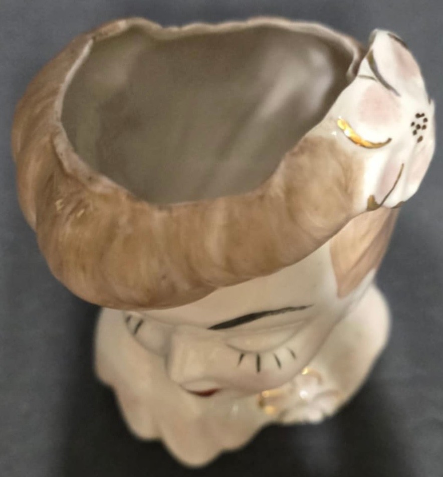 Vintage Lady Head Ceramic Vases. The Black and White is missing the eye lashes on one side and half on the opposite eye. Measures 5 & 6h.