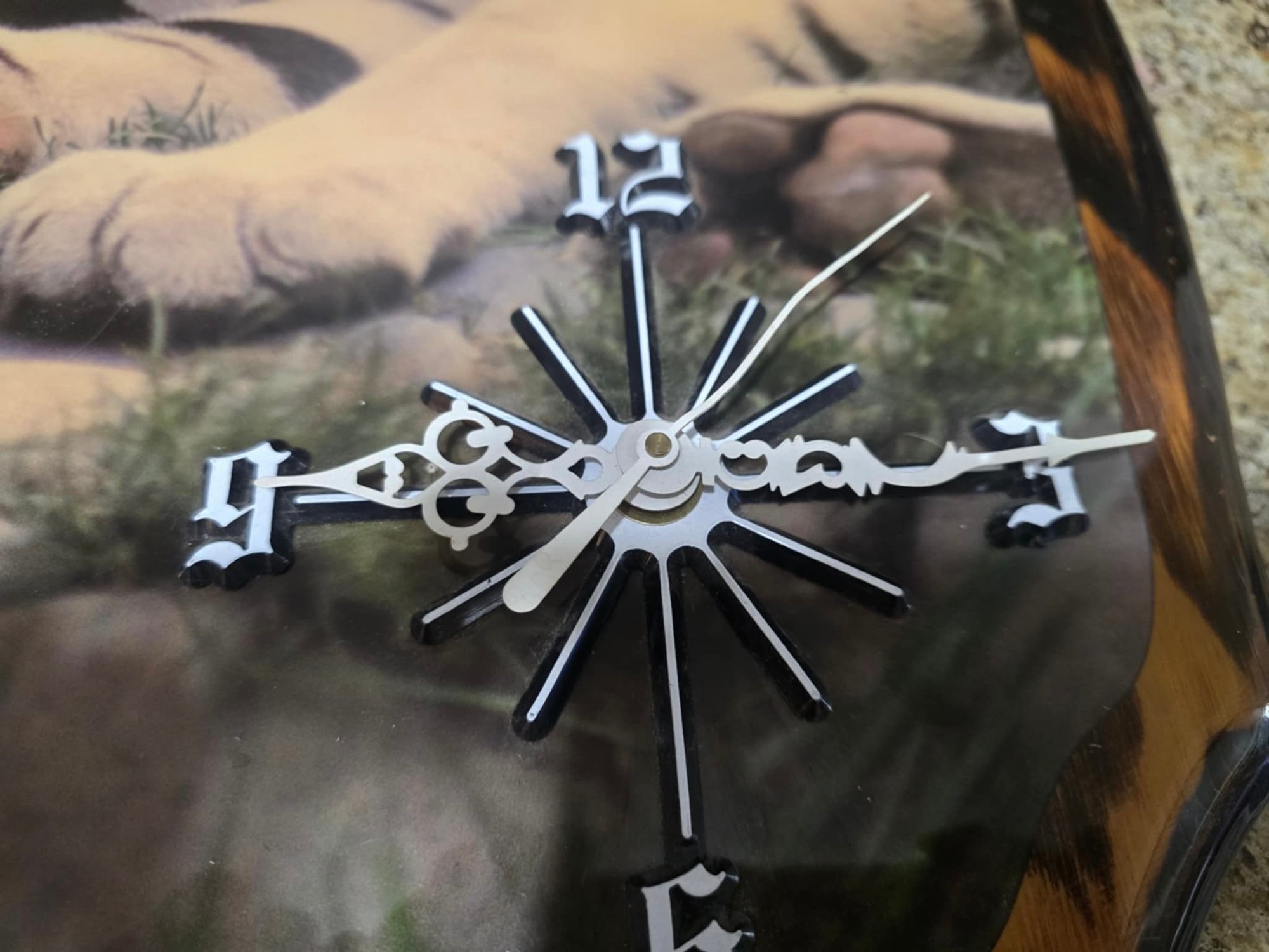 vintage Loren Rothchild decoupage wall clock featuring tigers. Measures 15.5 x 22. Hand on clock are bent. Works.