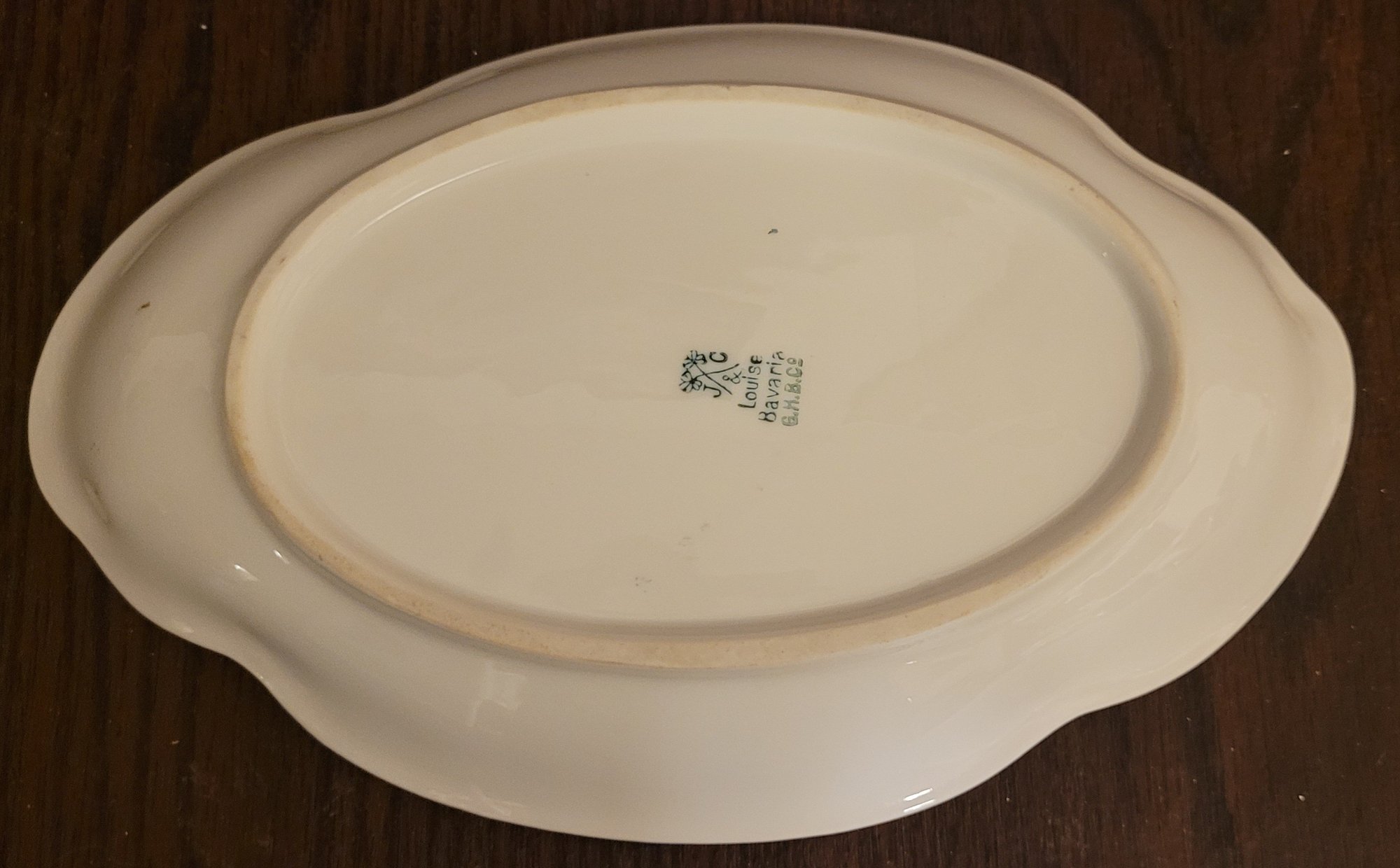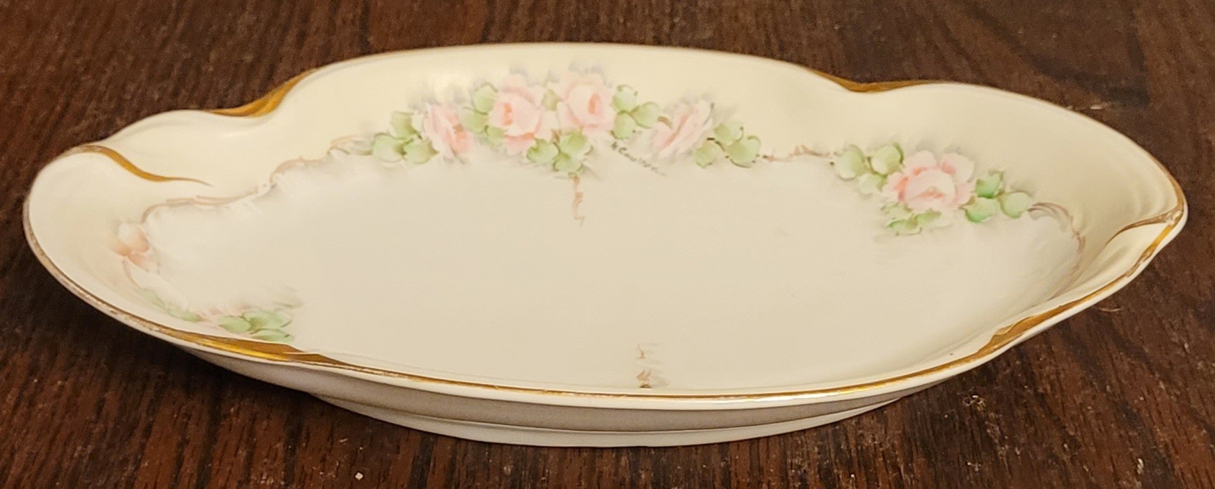This measures 9.125" long by 5.75" wide. I didn't see any chips or cracks. See pictures for details.