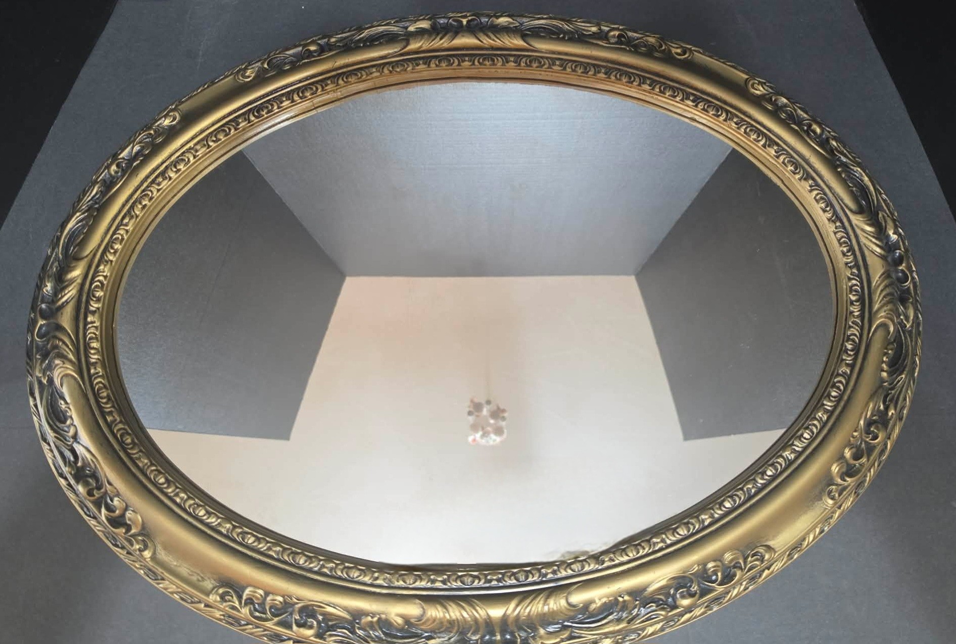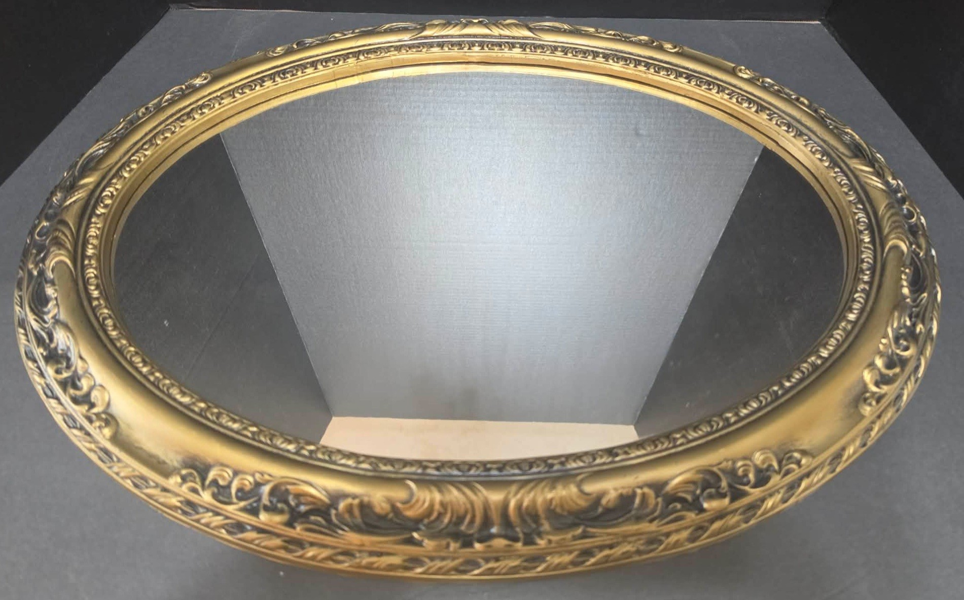 Vintage Mid Century Gold Framed Oblong Oval Mirror. Measures 23.5 x 18.