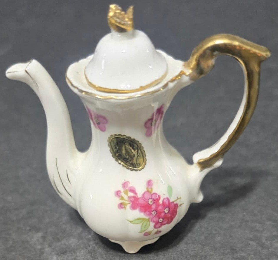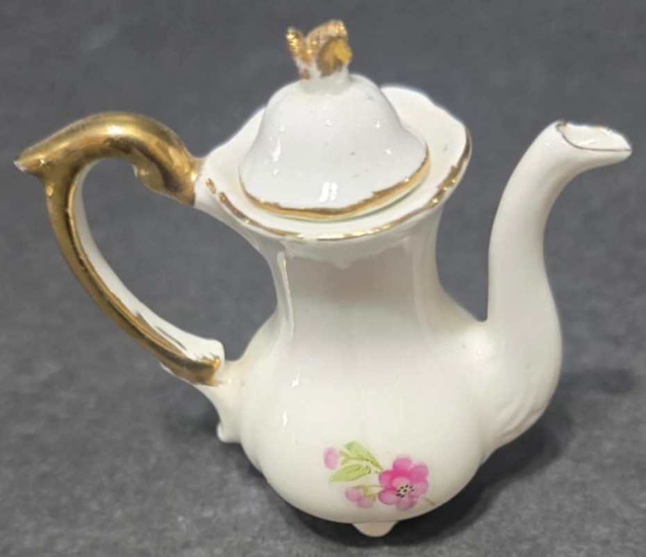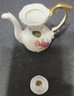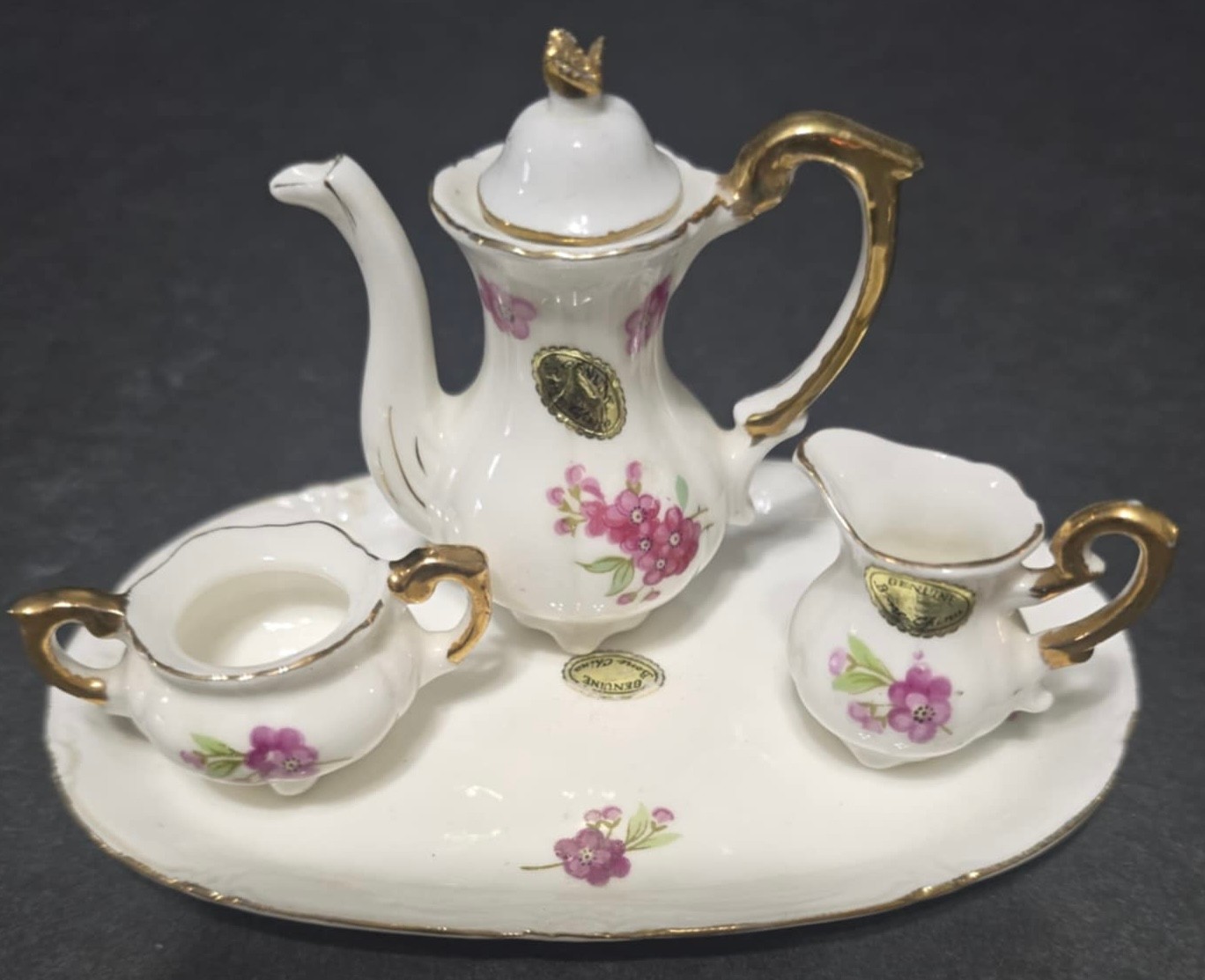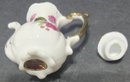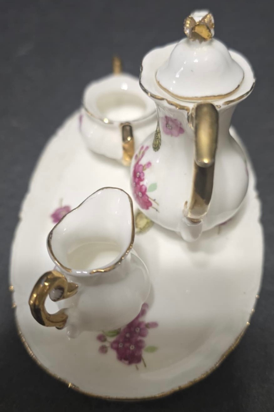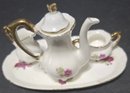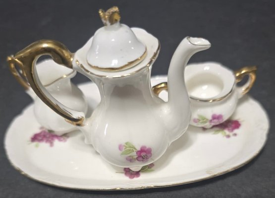 Vintage Miniature Fine Bone China Porcelain Tea Set- Tea Pot, Pitcher, Plate. Plate 5" creamer 1", sugar 1", pitcher 3"h.