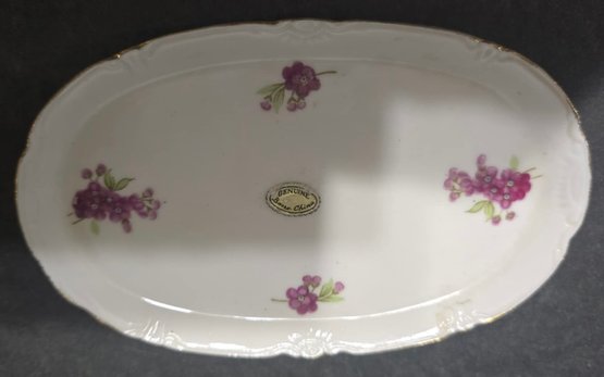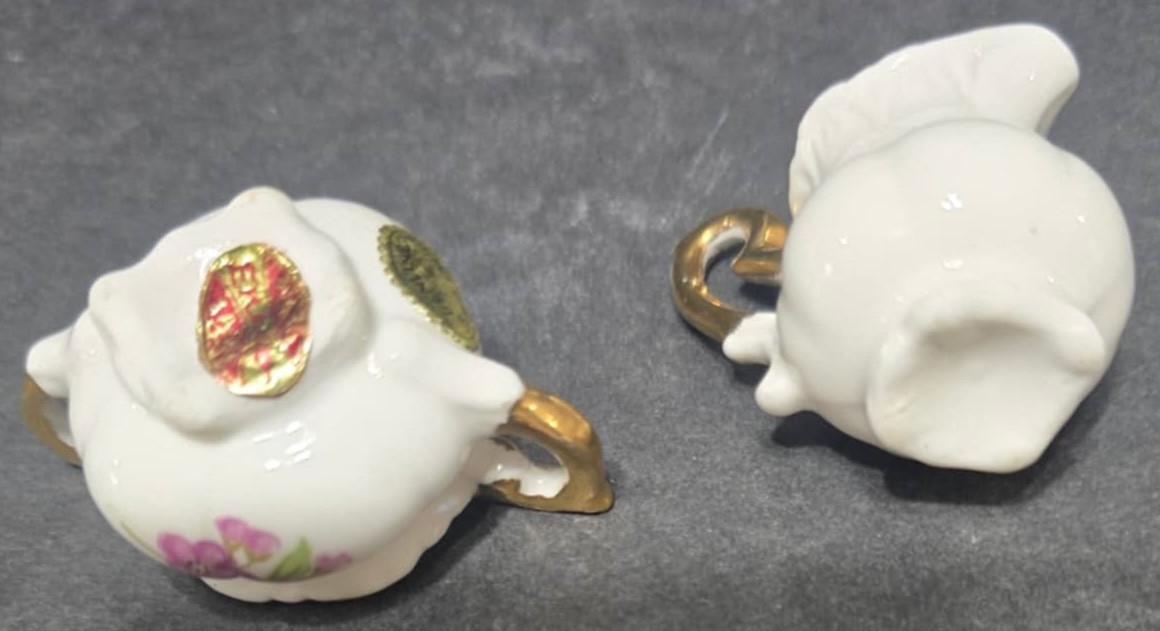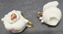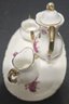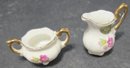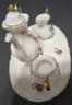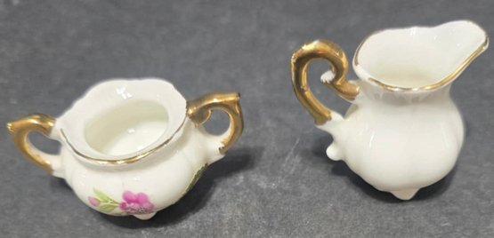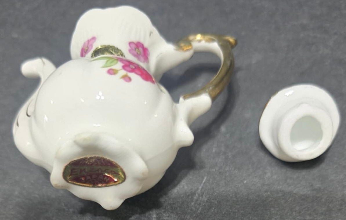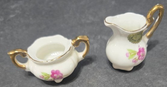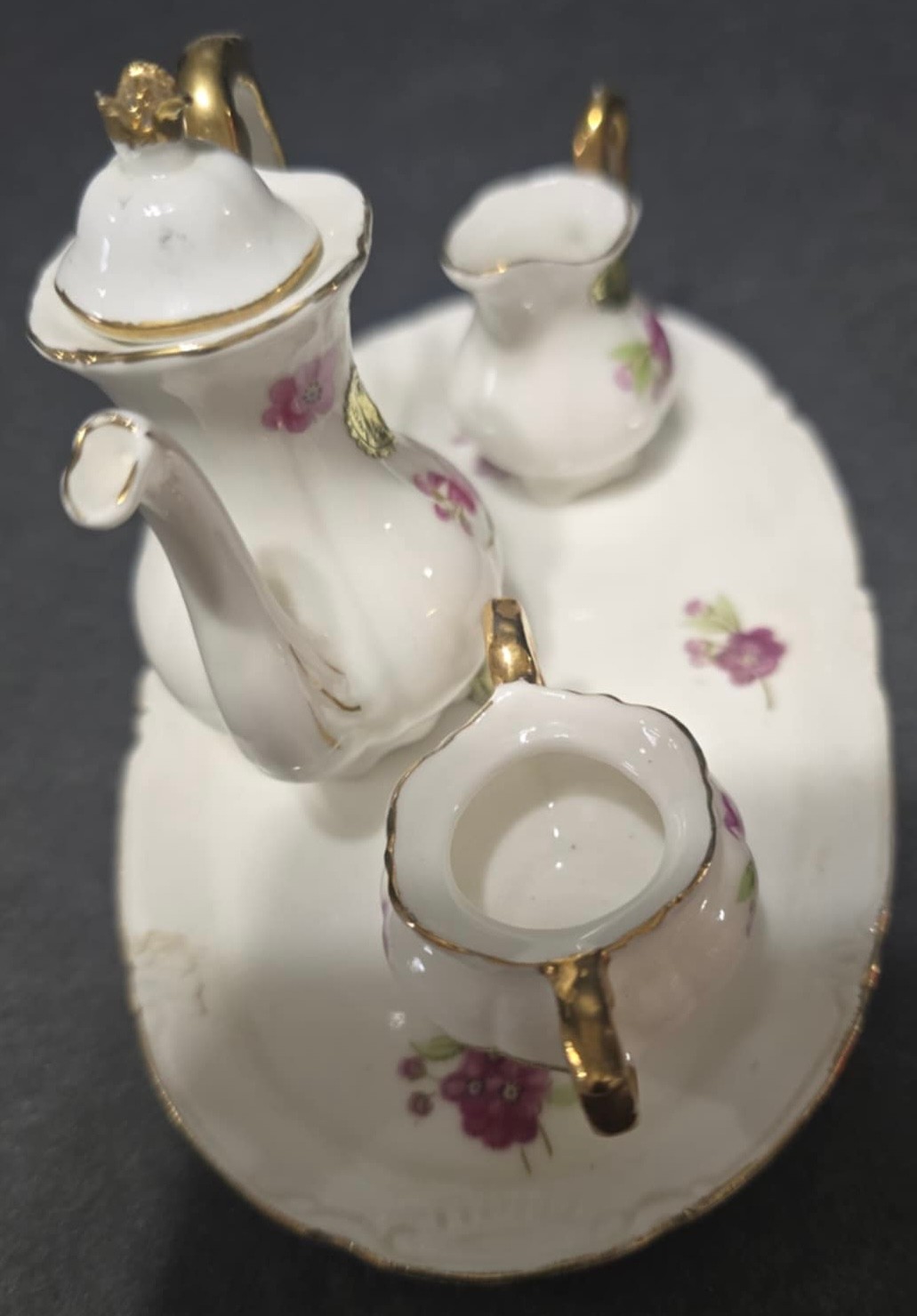 Vintage Miniature Fine Bone China Porcelain Tea Set- Tea Pot, Pitcher, Plate. Plate 5" creamer 1", sugar 1", pitcher 3"h.