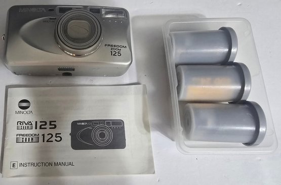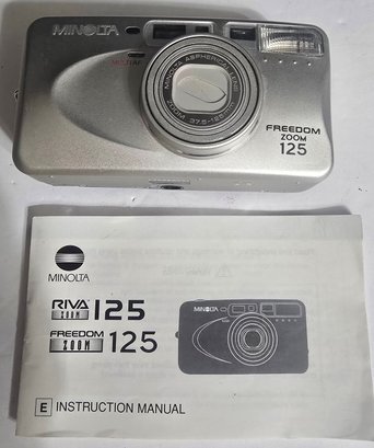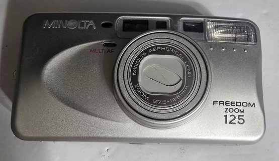 Vintage Minolta Freedom Zoom 125 compact 35mm point-and-shoot camera. Untested. Turns on. Not sure the condition of the film. Please see all pics for details