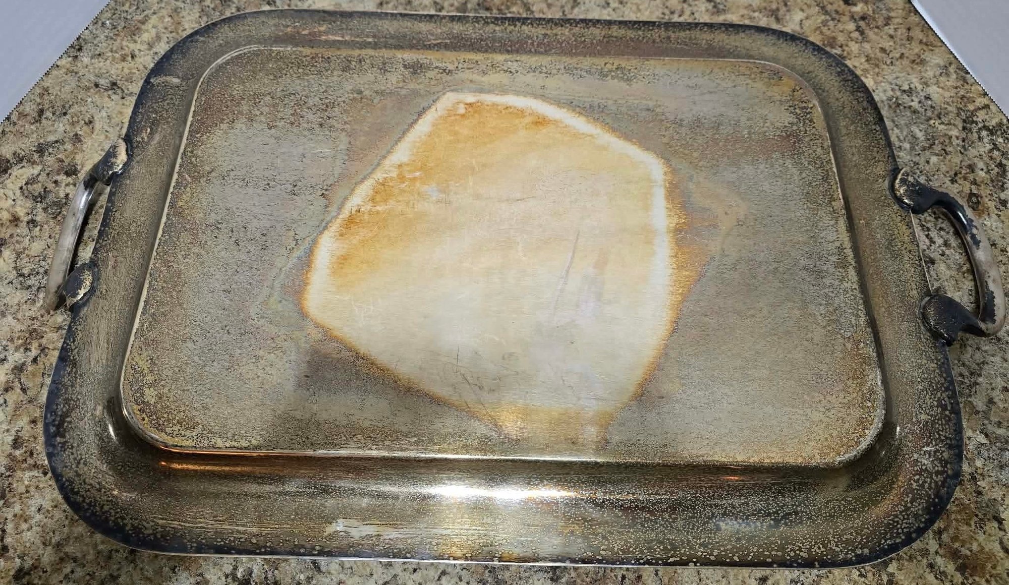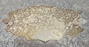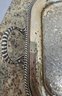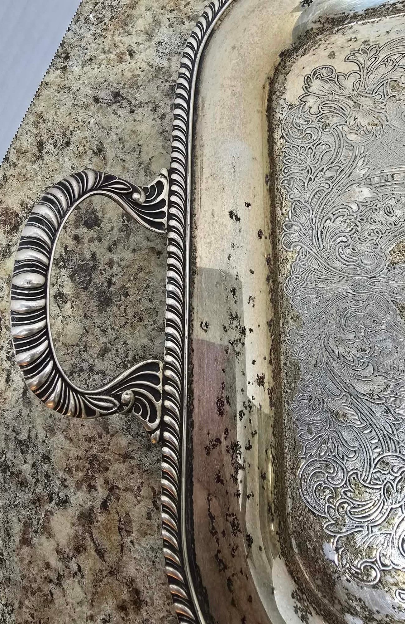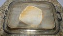 Vintage or antique rectangular silver-plated serving tray featuring ornate engraved floral patterns, a decorative border, and scrolling handles. No maker noted. Needs cleaned. Measures 22 x 13 x 2.