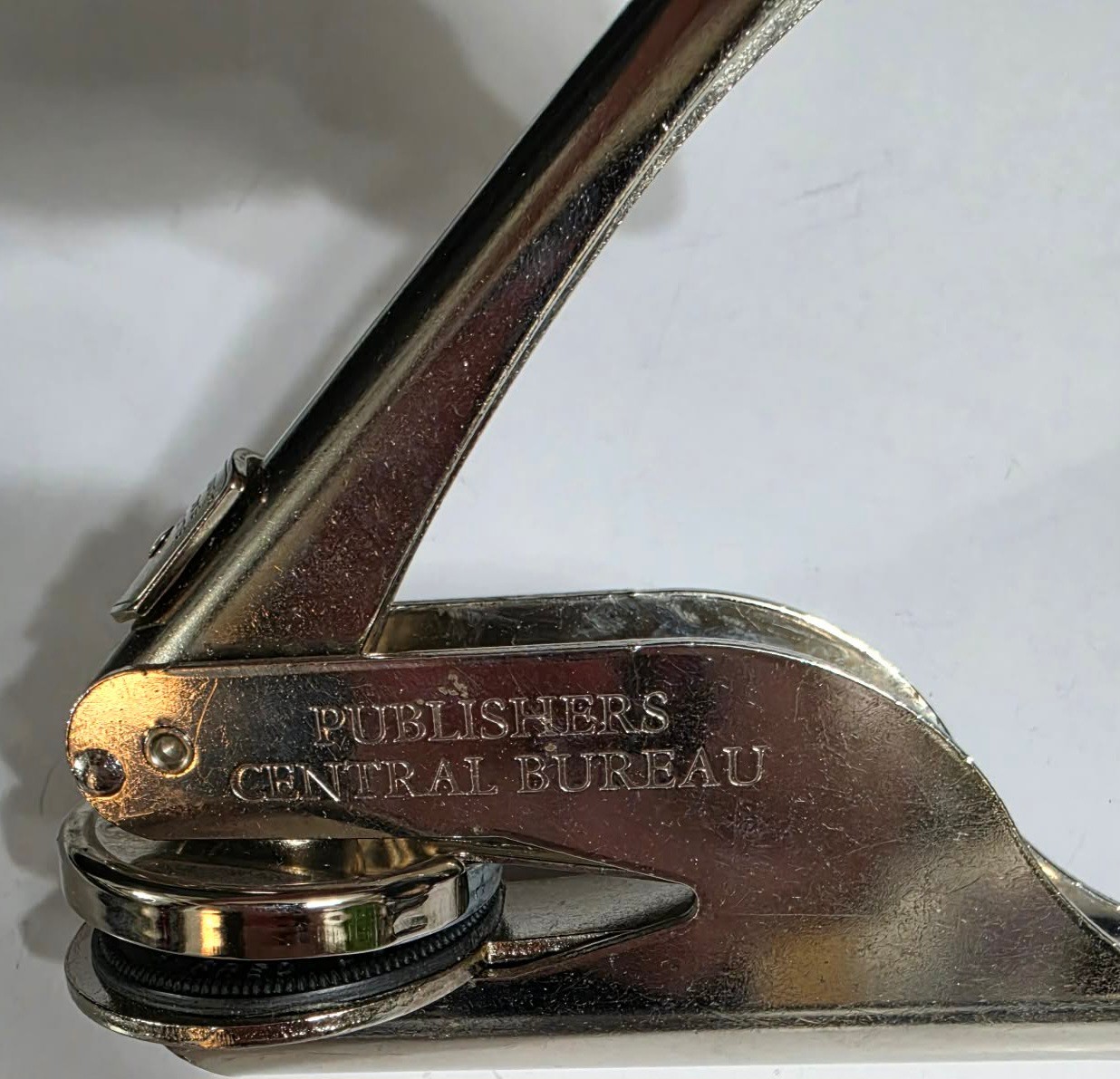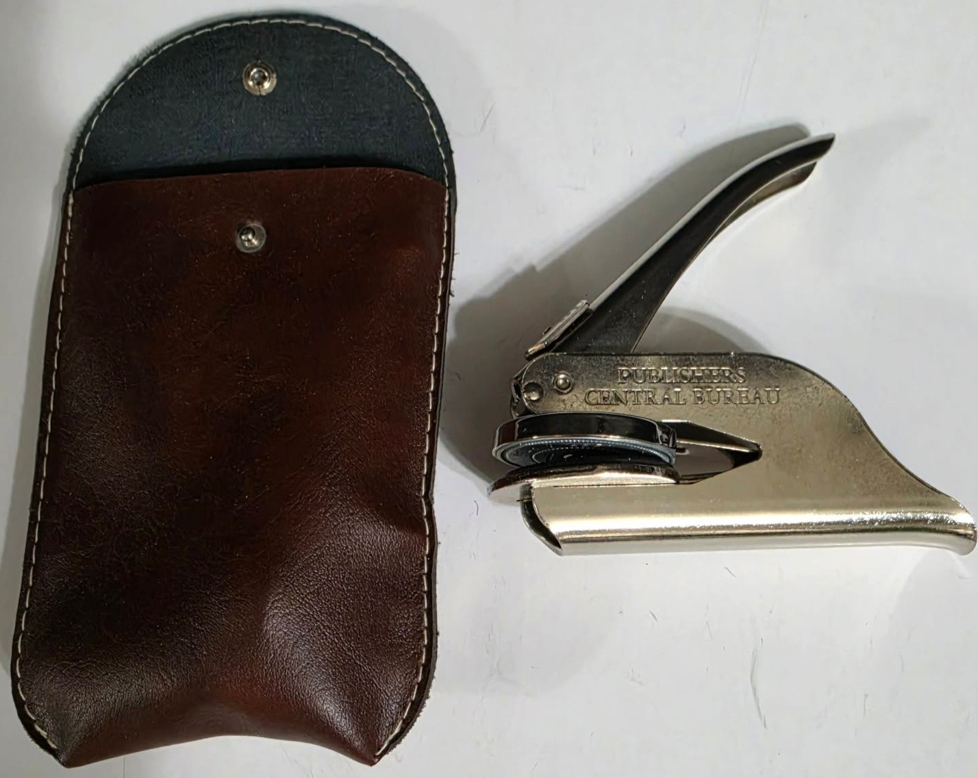 Vintage pocket seal stamp press featuring the text "PUBLISHERS CENTRAL BUREAU".