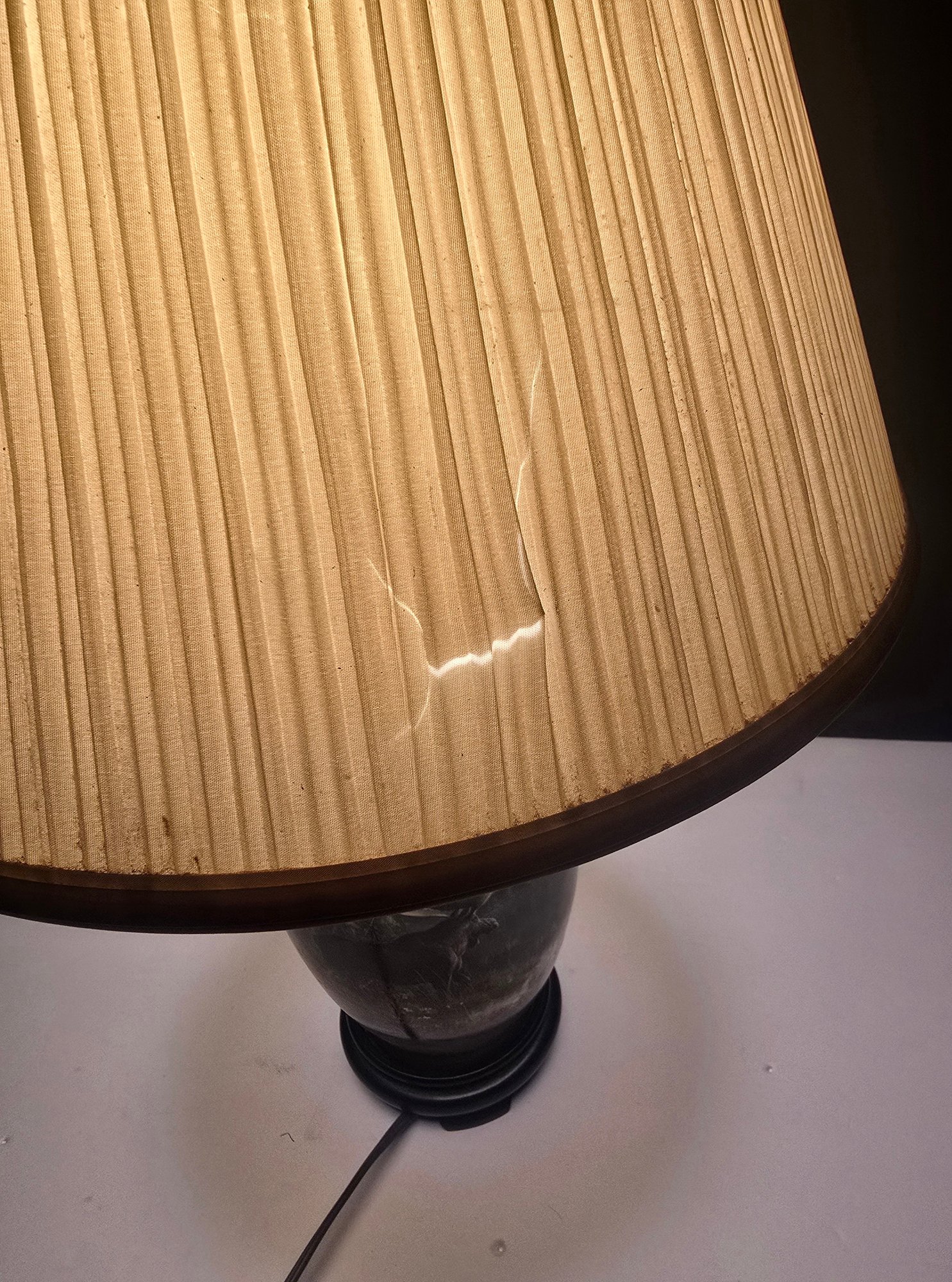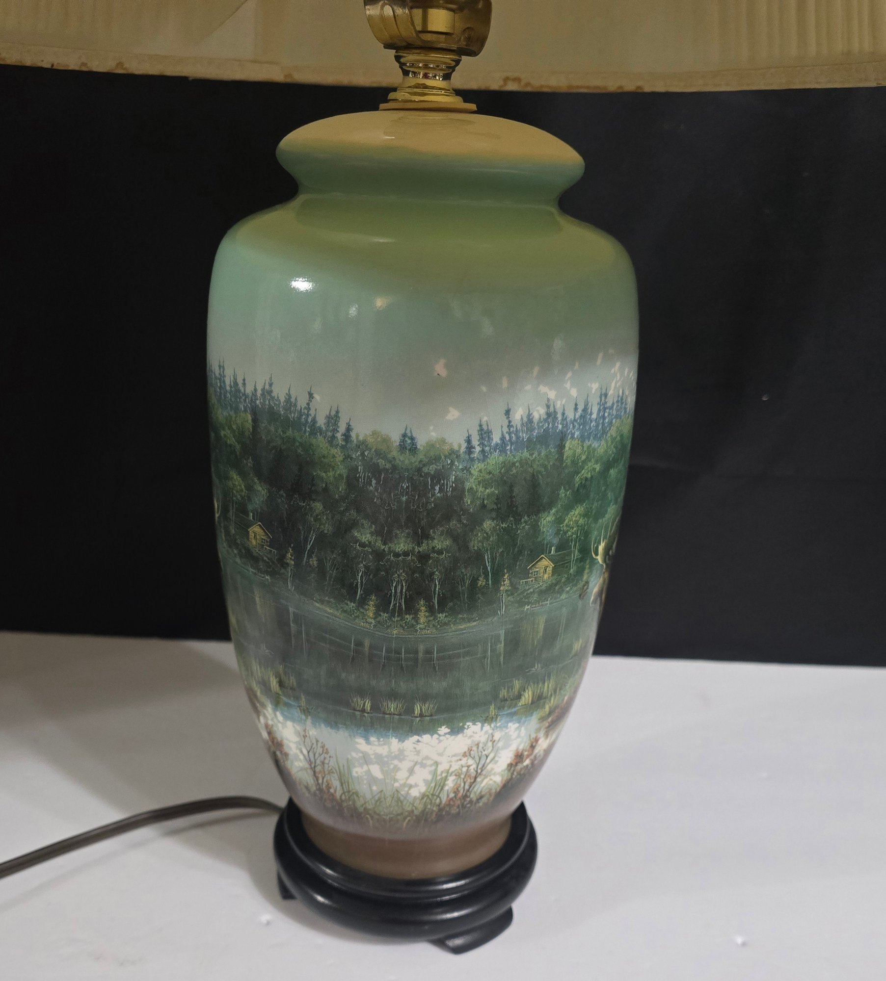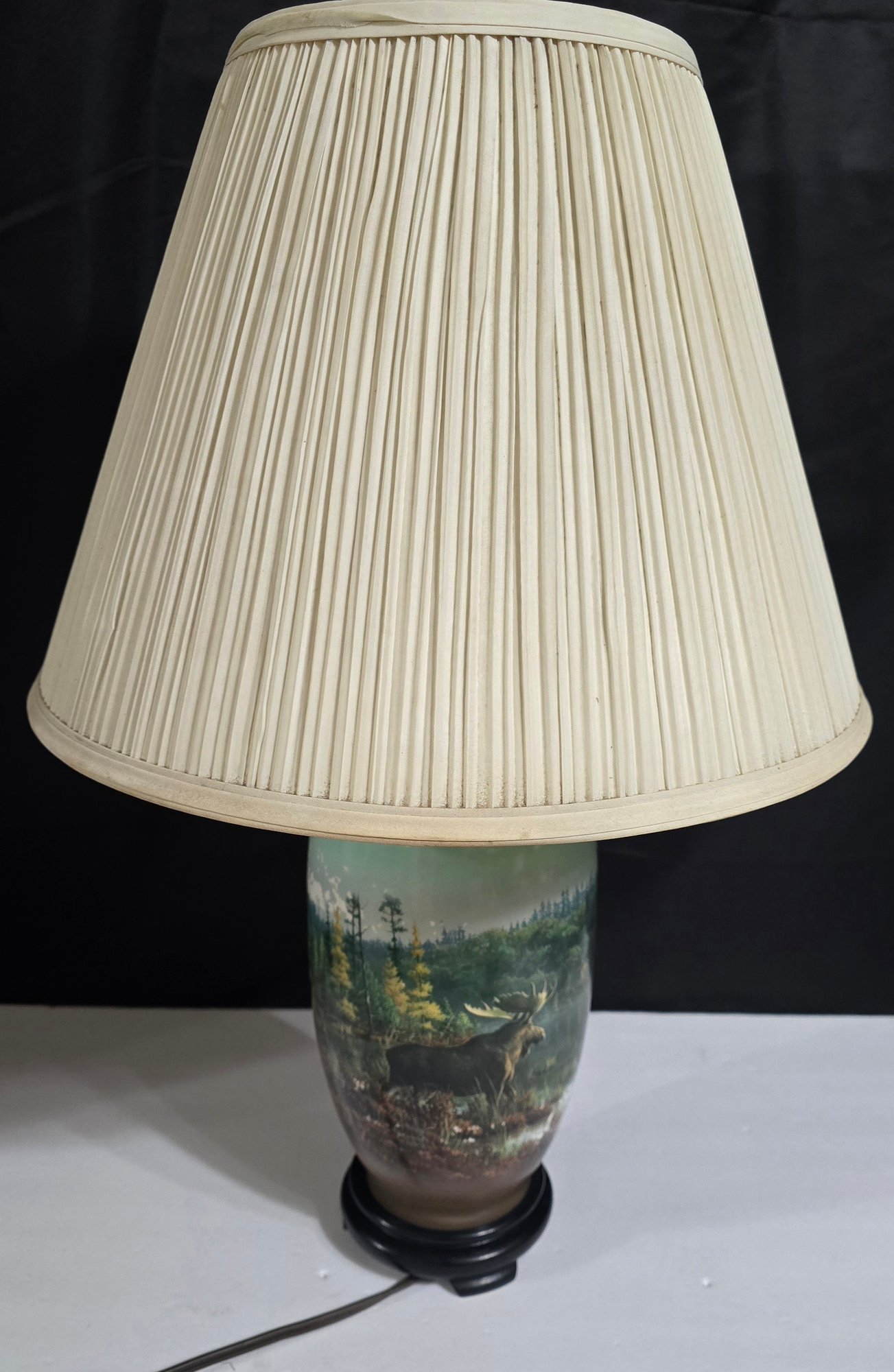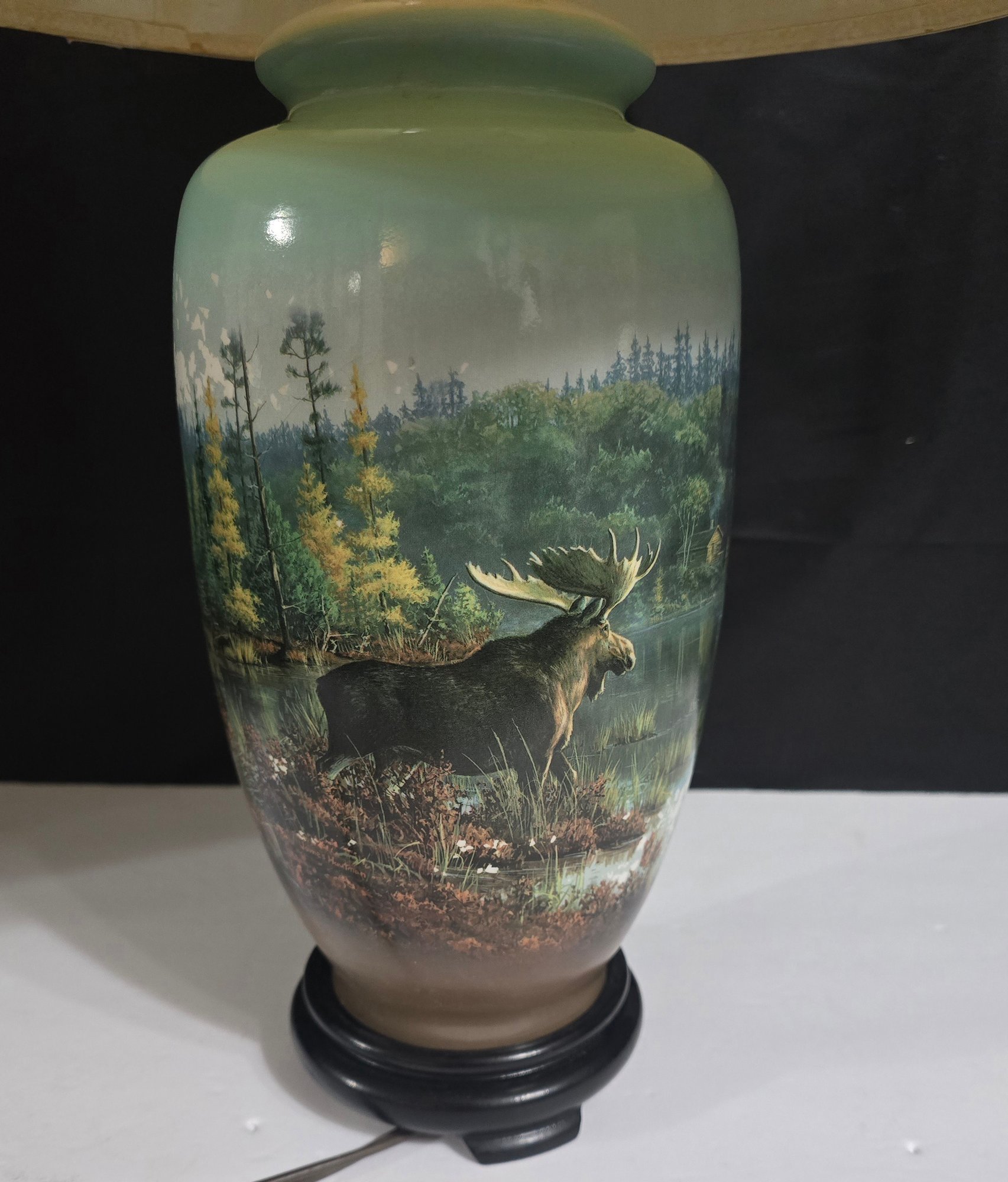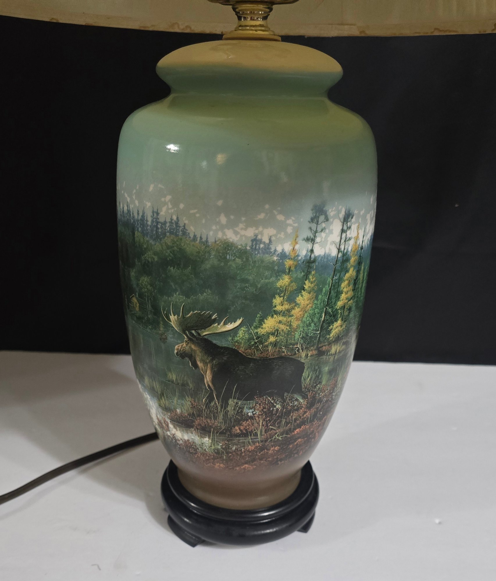 Vintage porcelain table lamp featuring a hand-painted wildlife scene of a moose in a wooded landscape. Measures 23h. Please see all pics for details