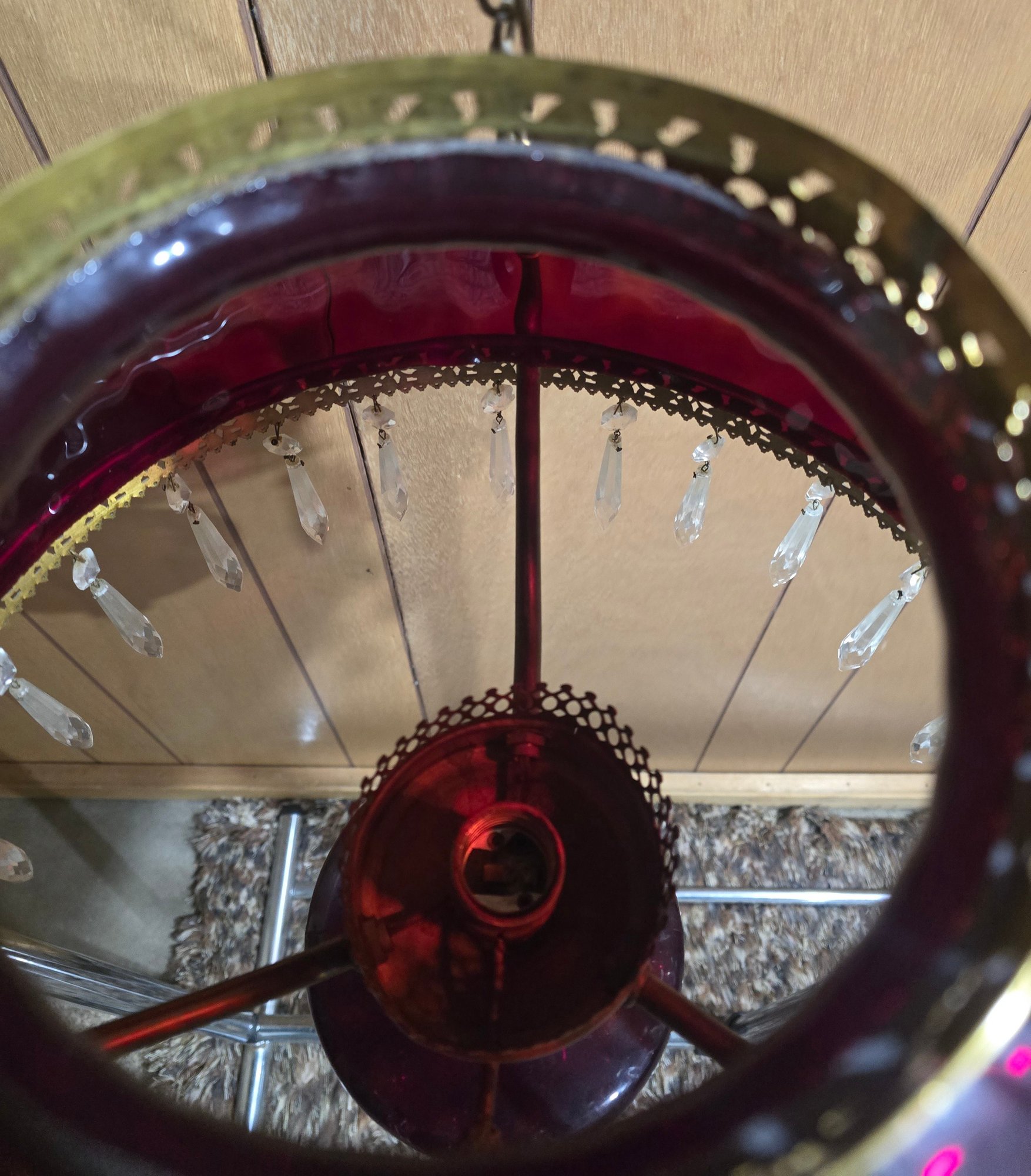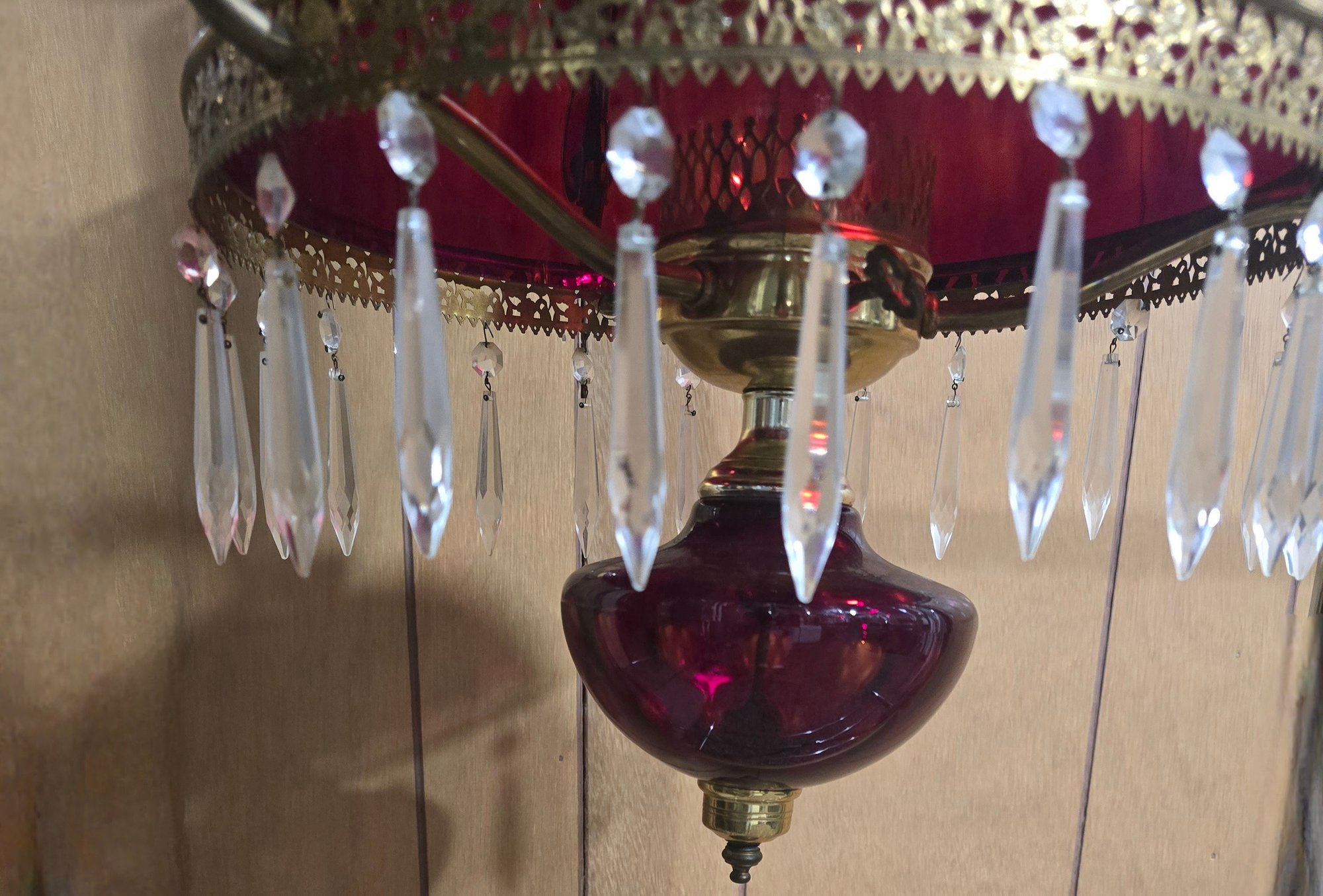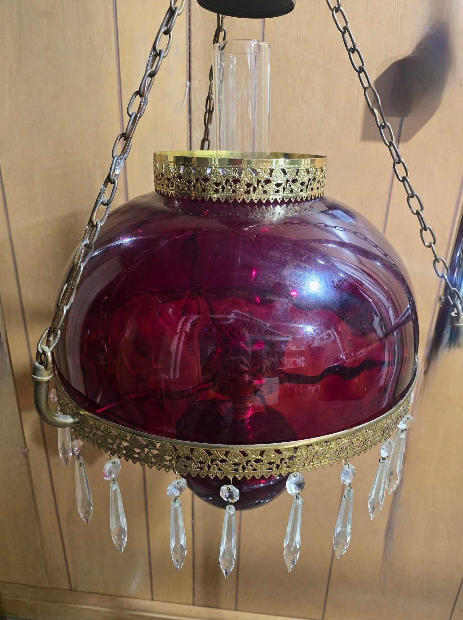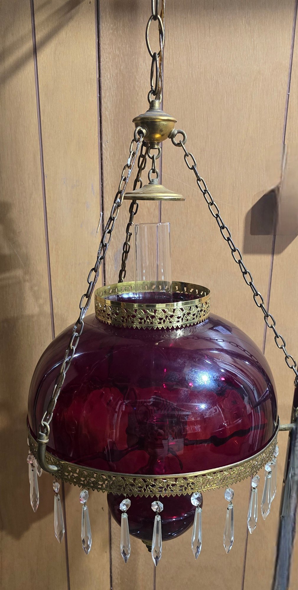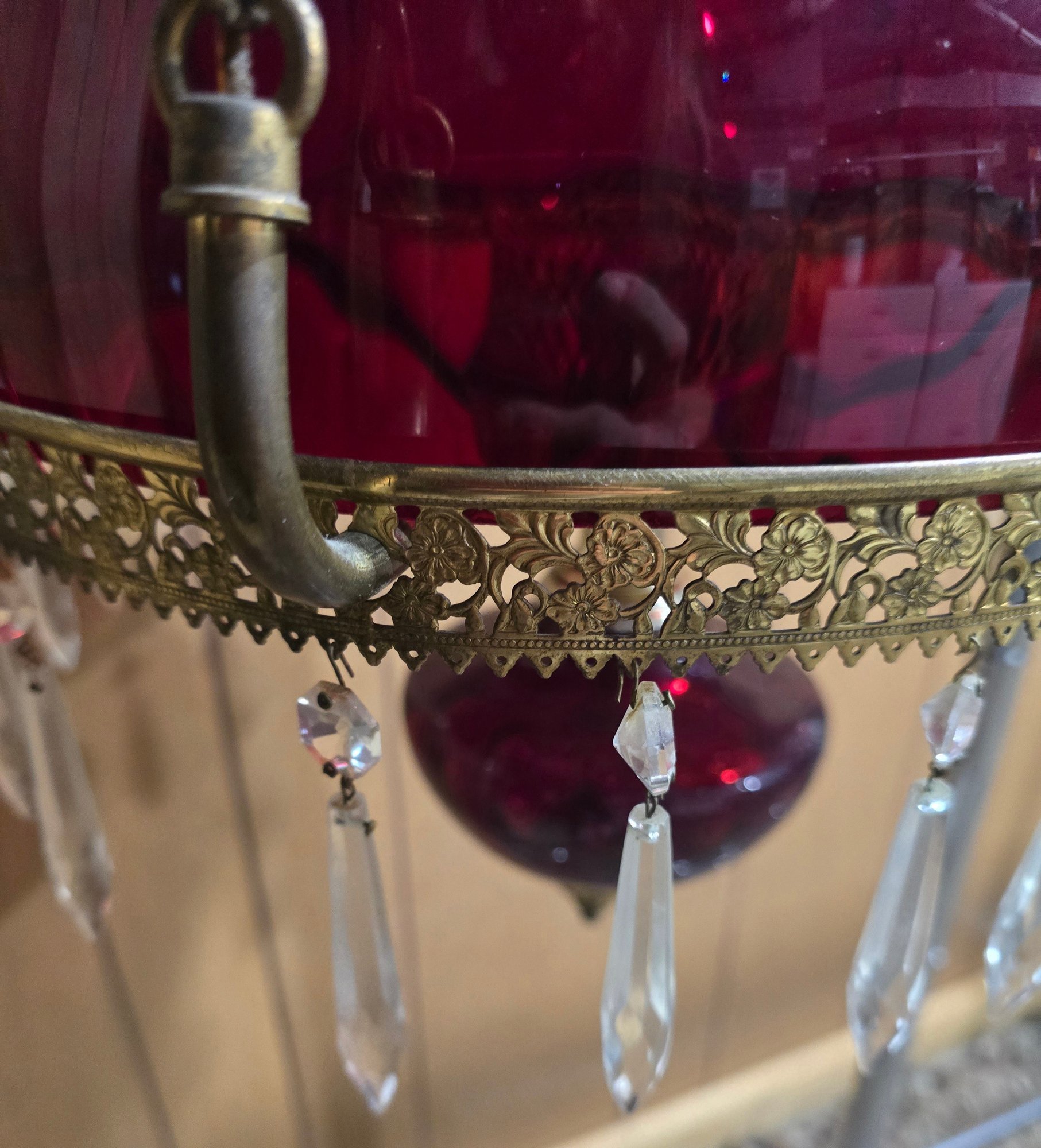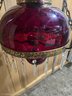 Appears to be Vintage Ruby red parlor/ library chandelier in good pre owned condition. Needs to be wired in. One crystal is missing on the lamp but is with the lamp. The clear chimney is not the right piece so is loose.