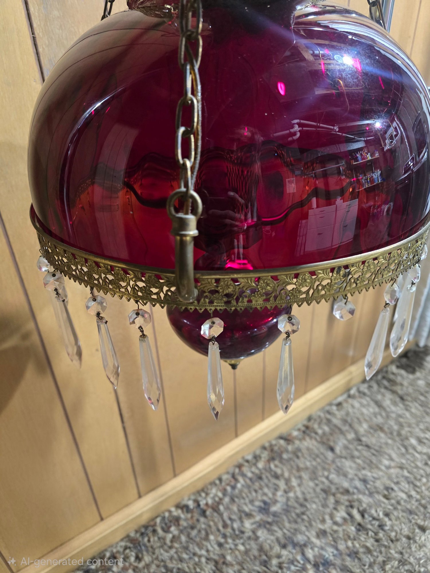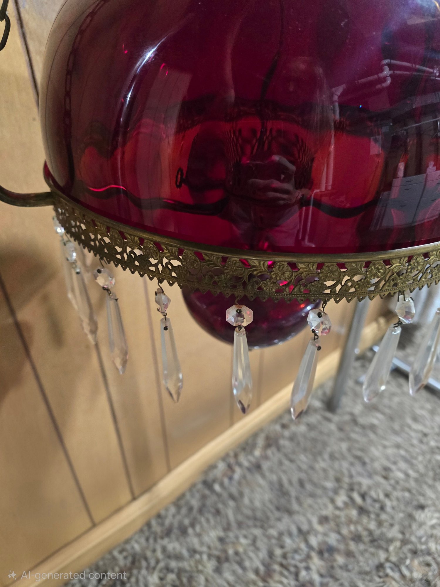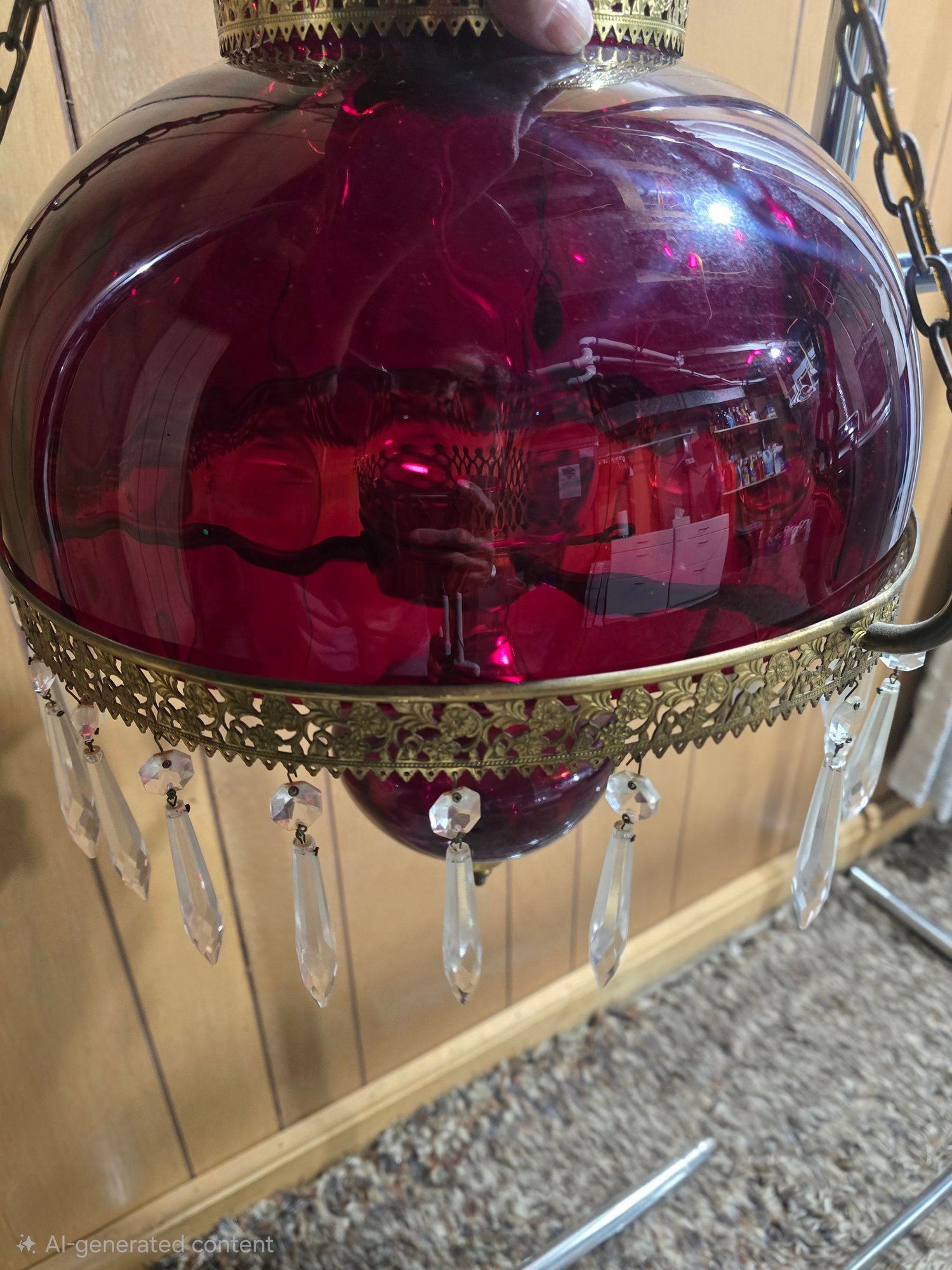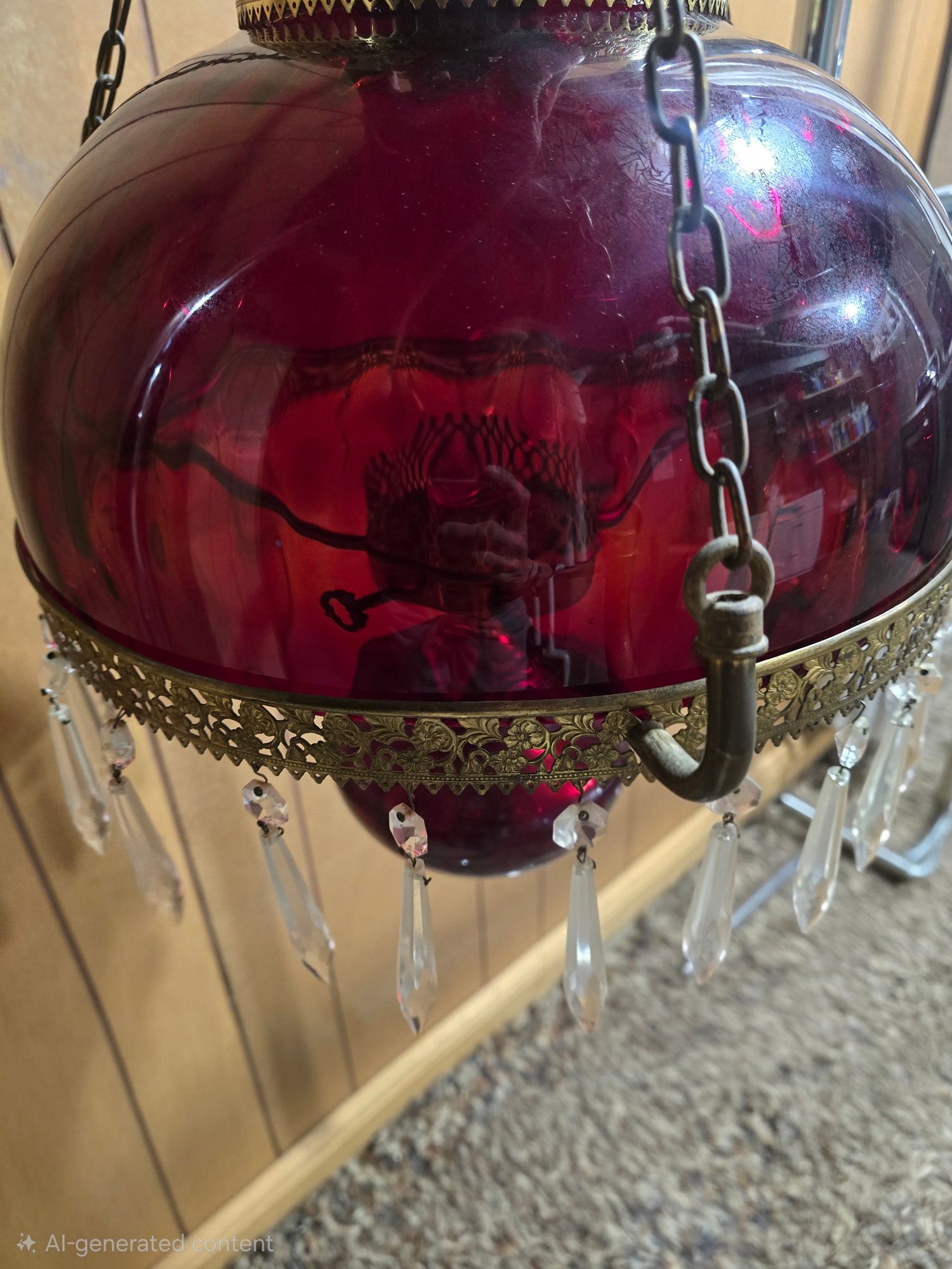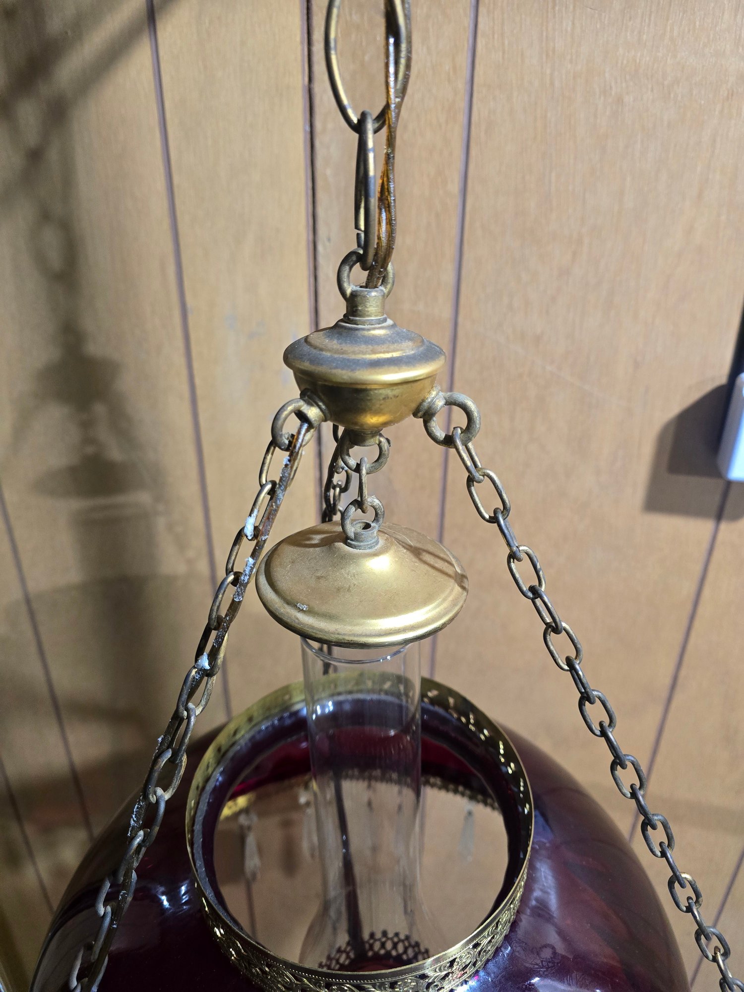Appears to be Vintage Ruby red parlor/ library chandelier in good pre owned condition. Needs to be wired in. One crystal is missing on the lamp but is with the lamp. The clear chimney is not the right piece so is loose.