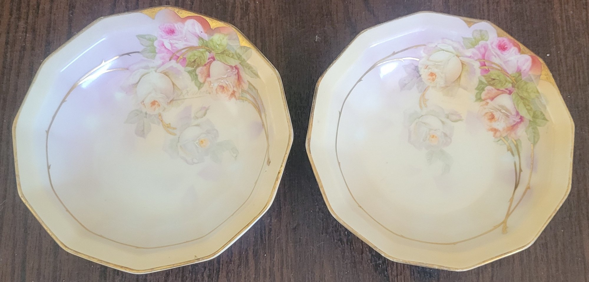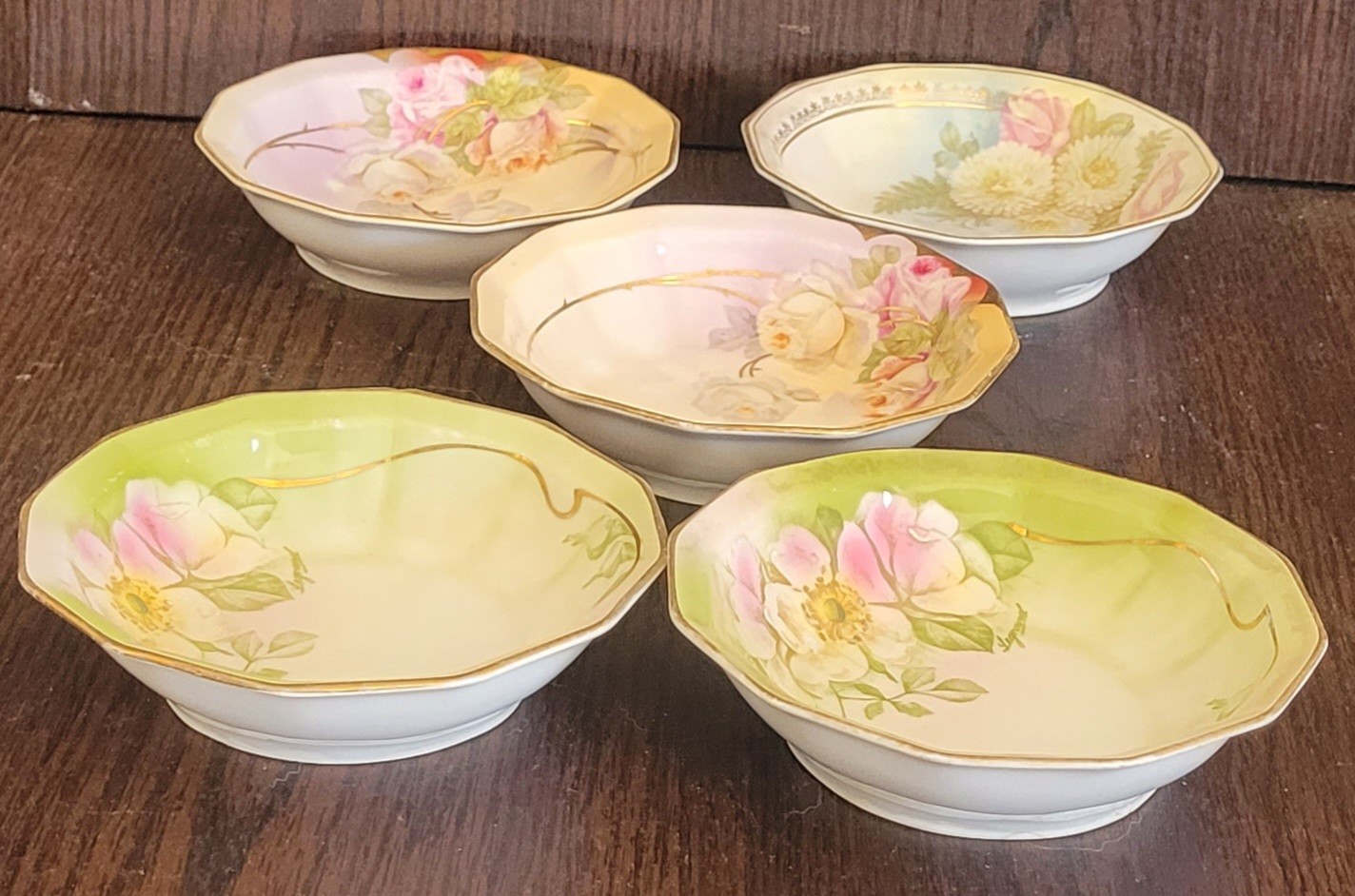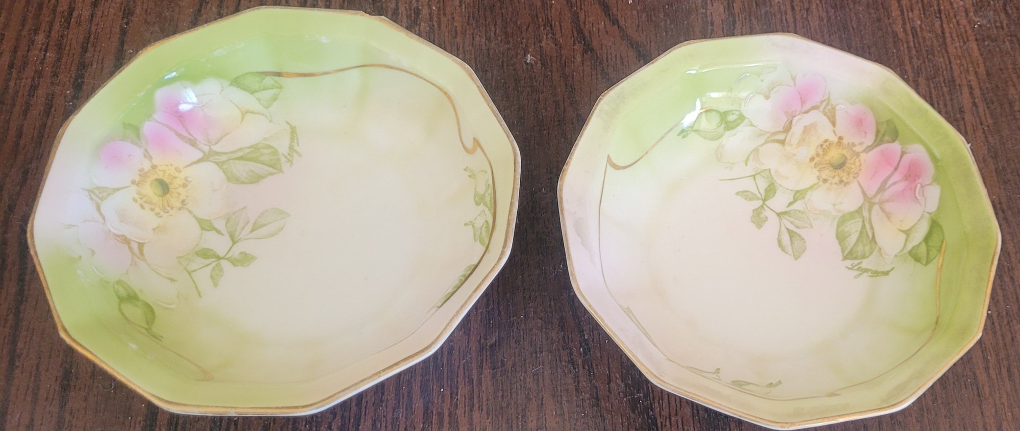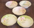 This lot comes with 3 different hand painted bowls. Each one measures 5.5" in diameter by 1.5" tall. One does have a chip and crack. See pictures for details.
