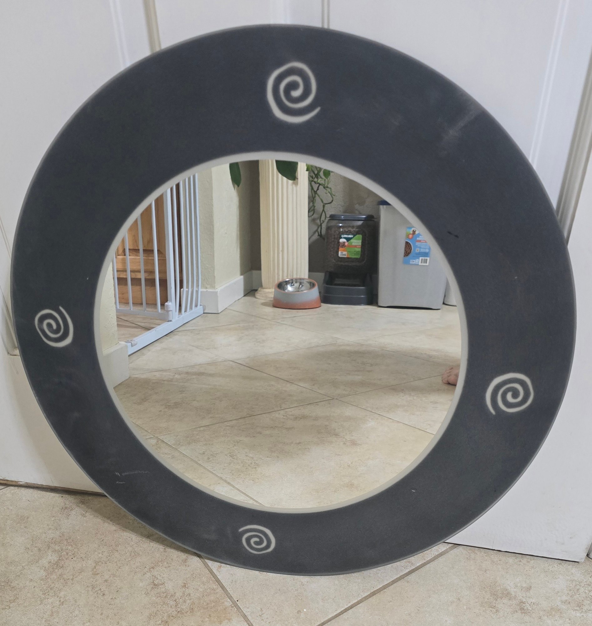 Vintage Round Mirror by BDI. Measures 22". Material appears to be Etched Glass with Corked back. Please see all pics for details.