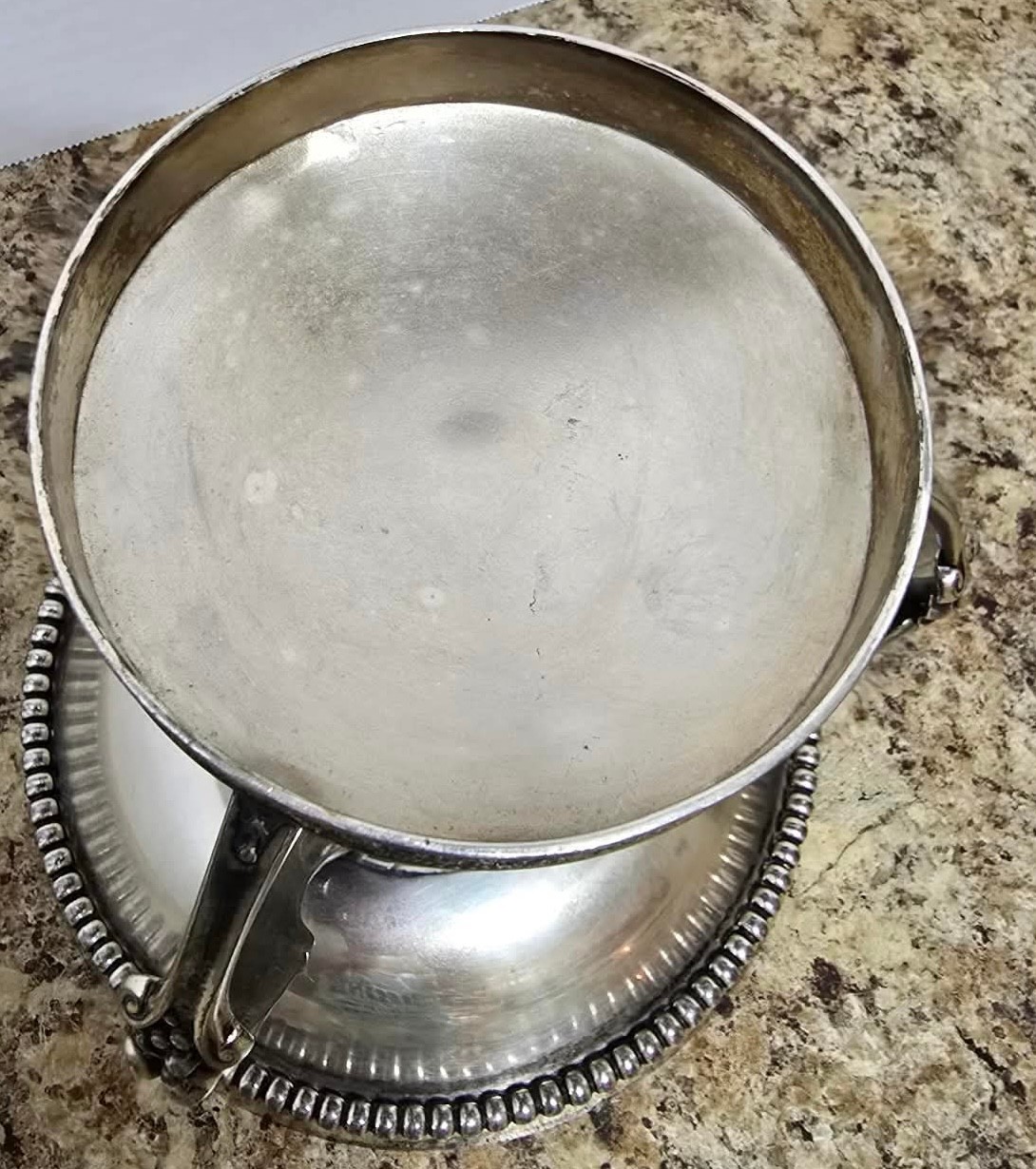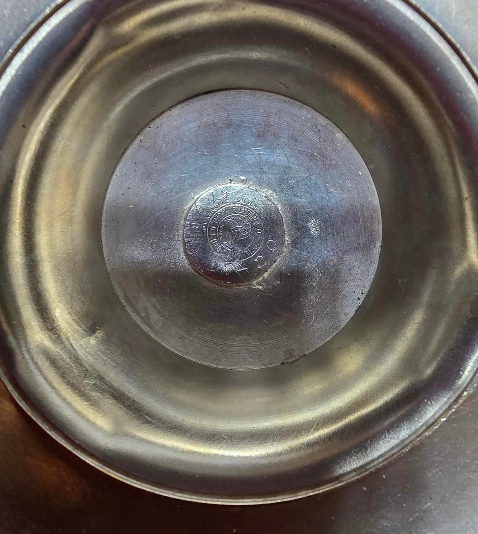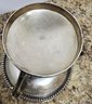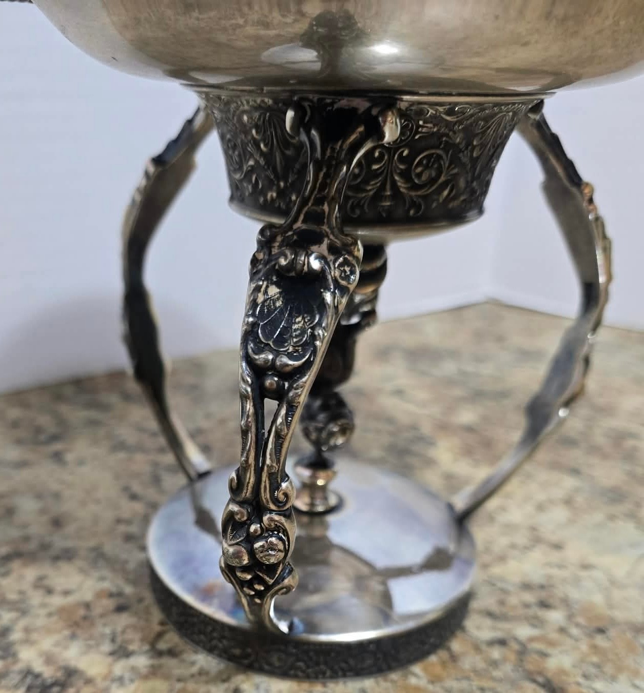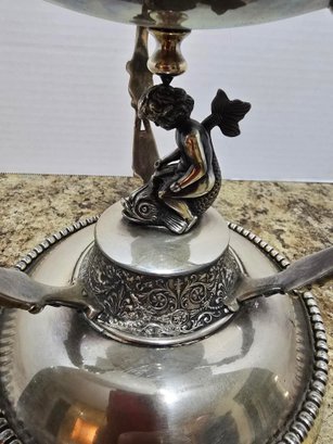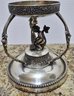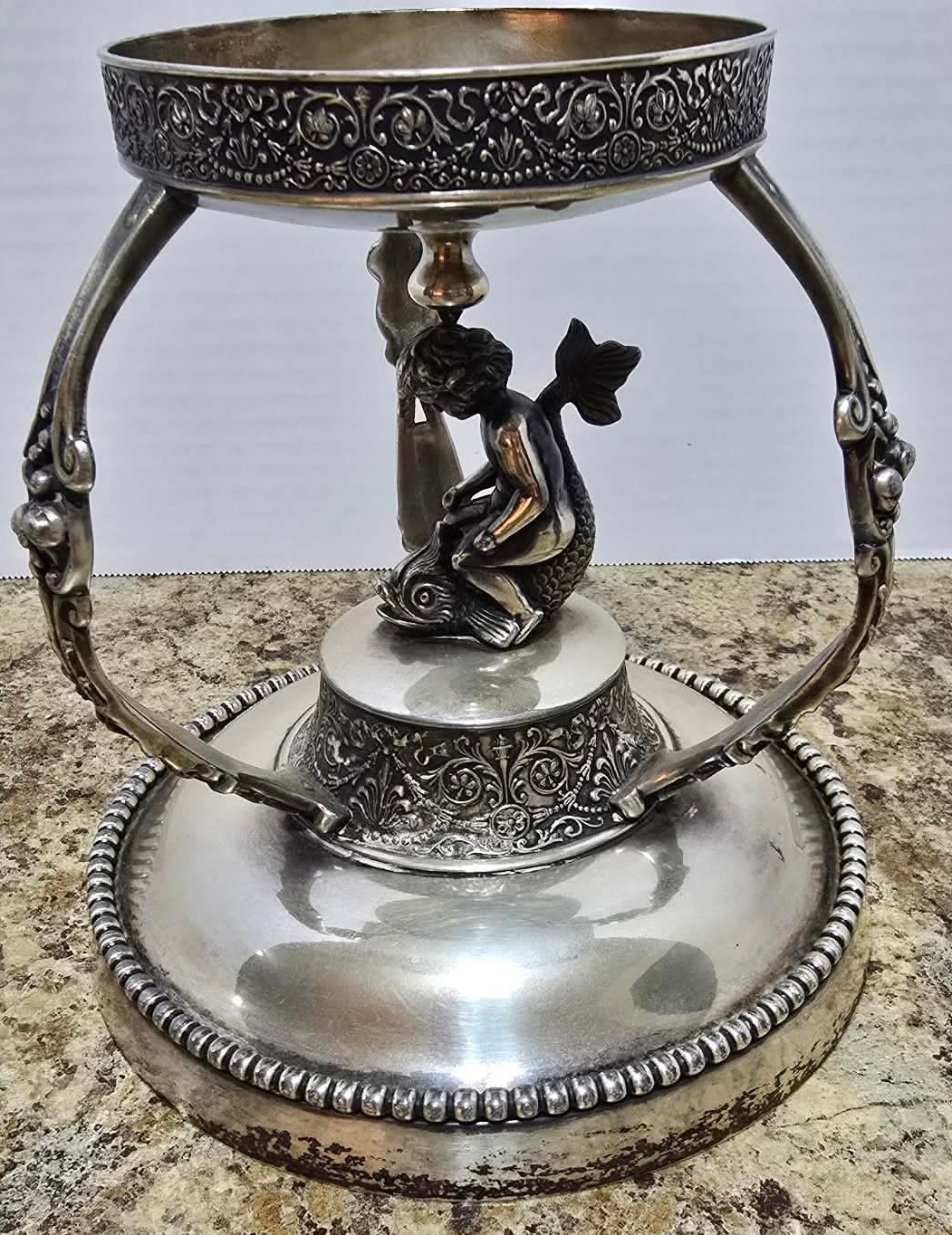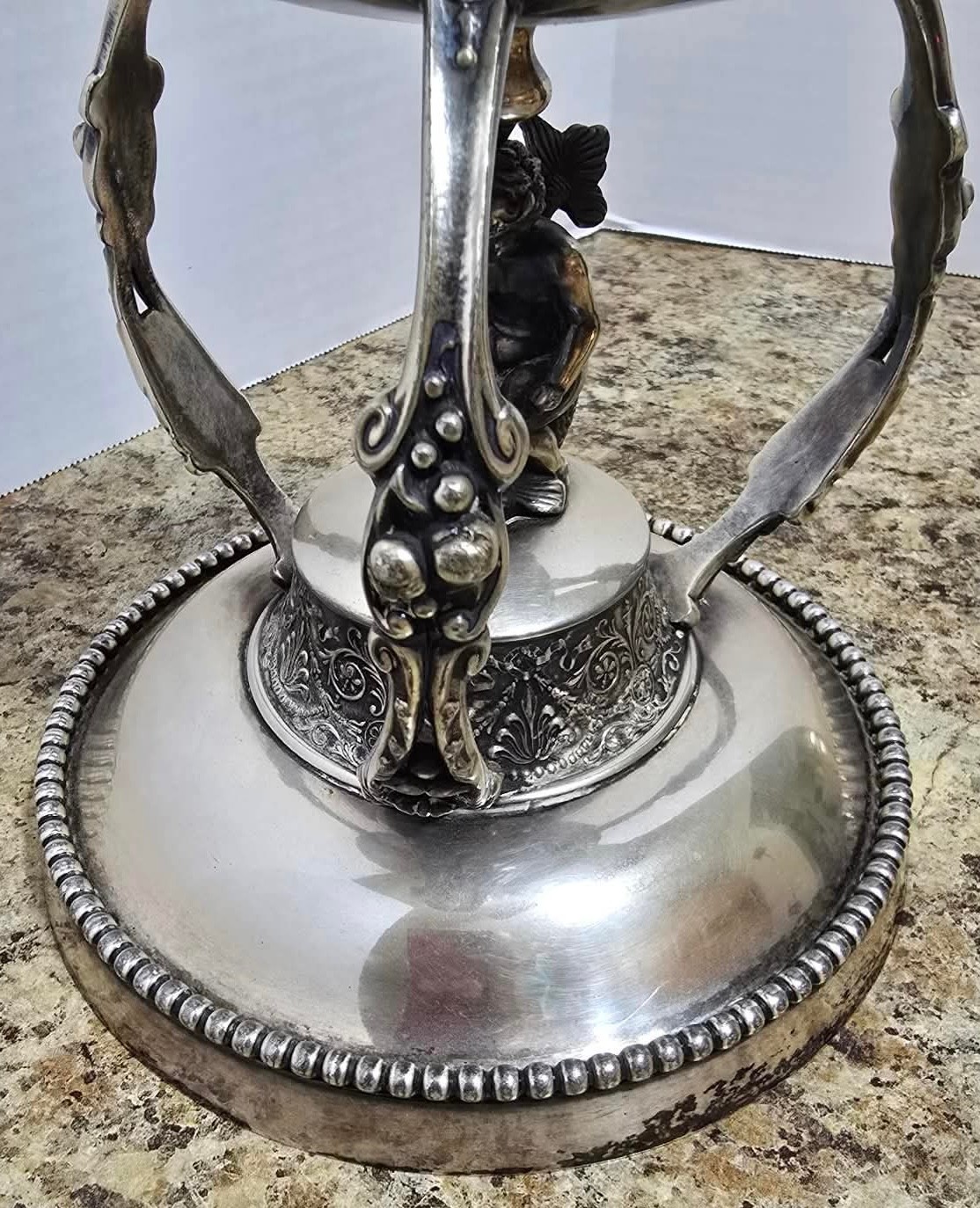 Vintage silver-plated pedestal stand, centerpiece base designed to hold a glass vase or bowl, featuring intricate figural cherub or nymph details. Measures 7 x 7 x 7. Needs cleaned.