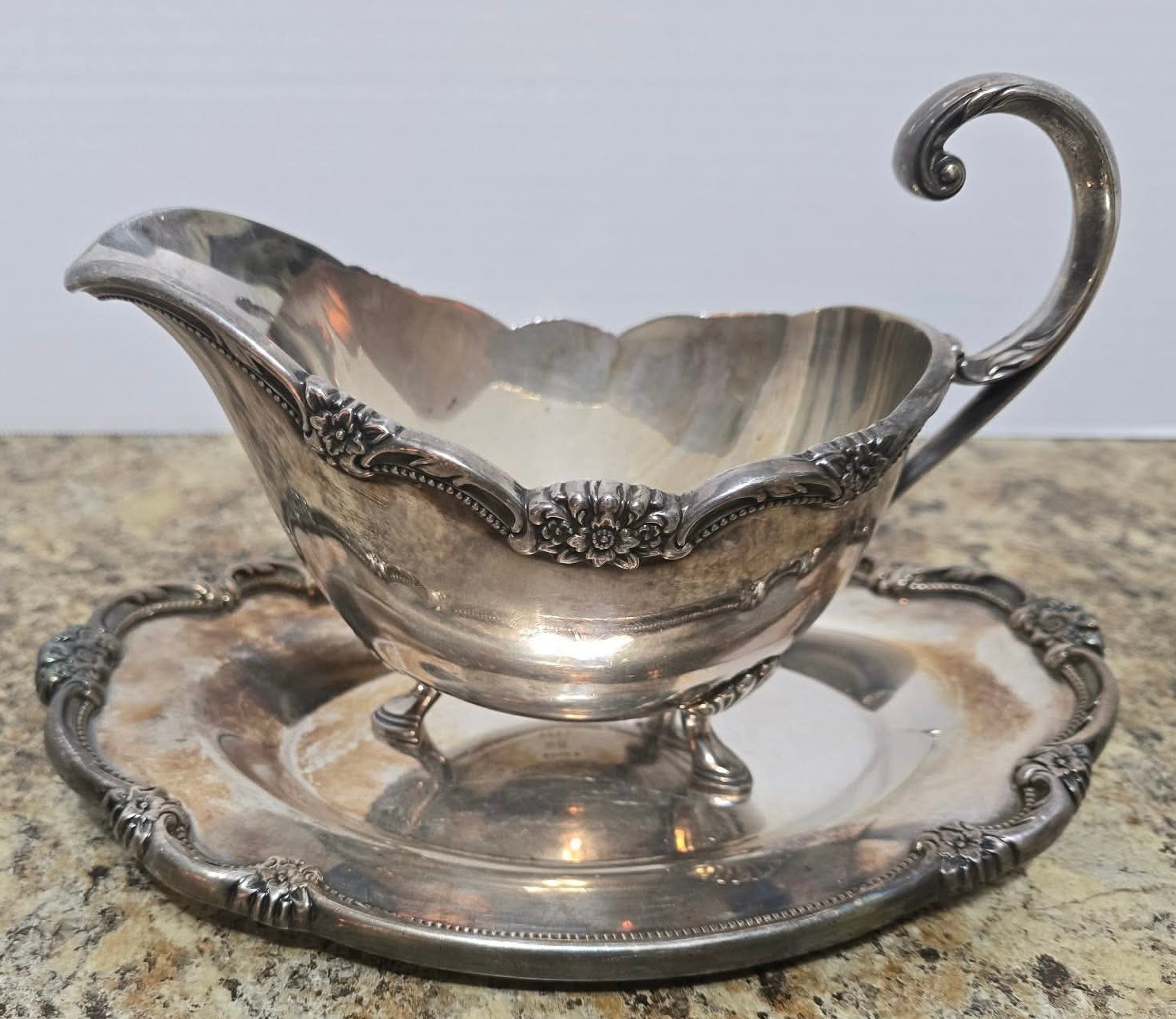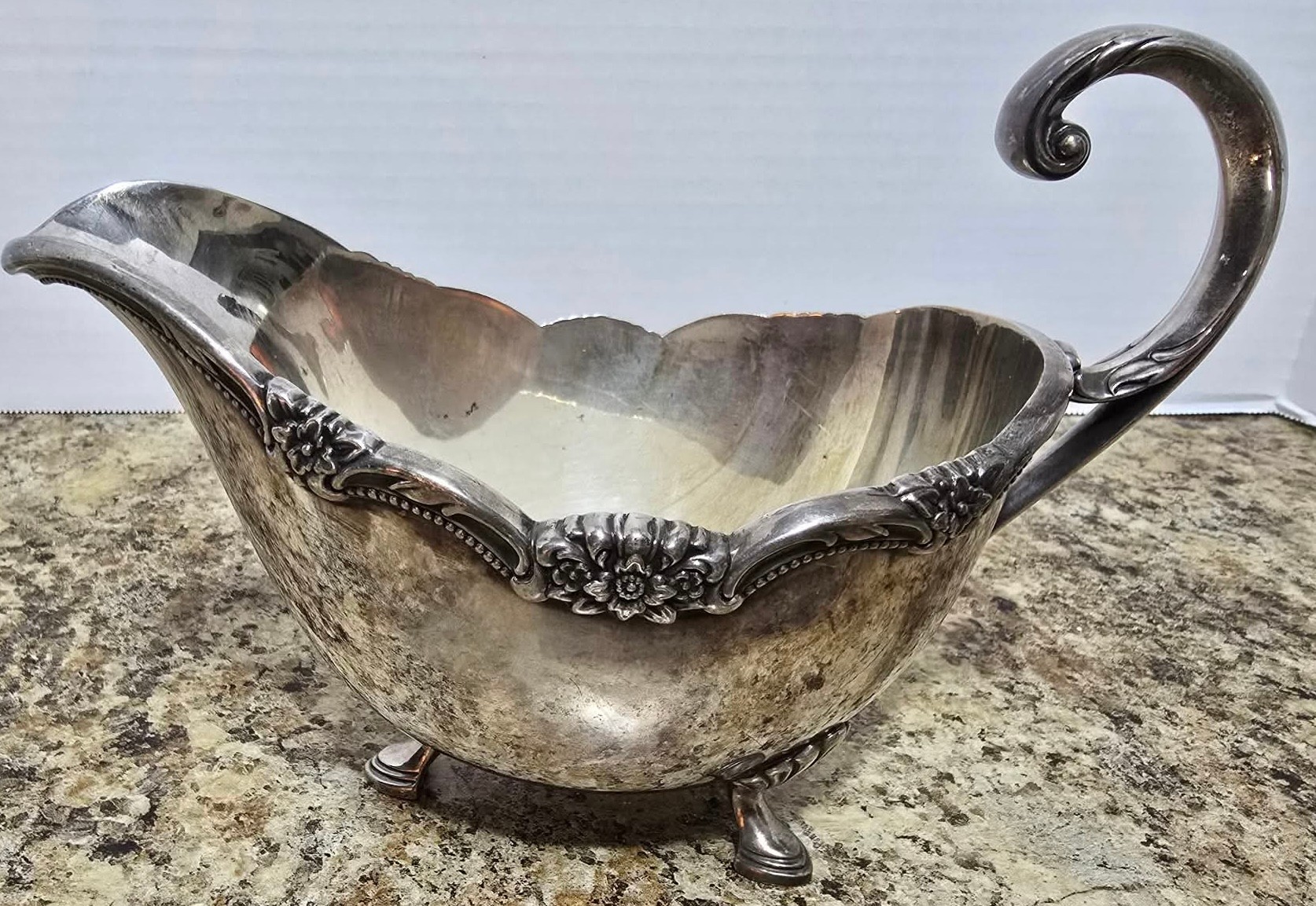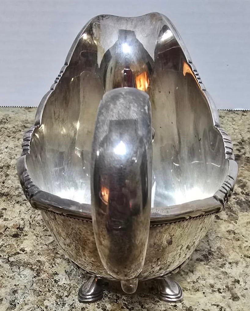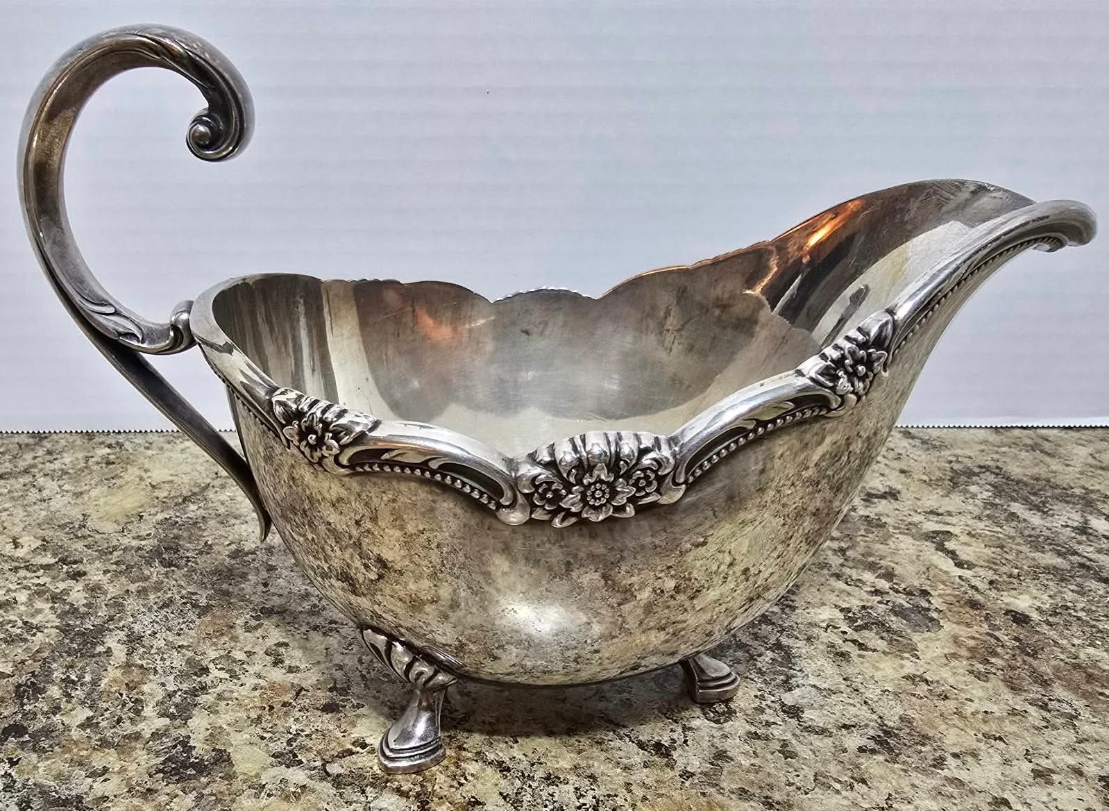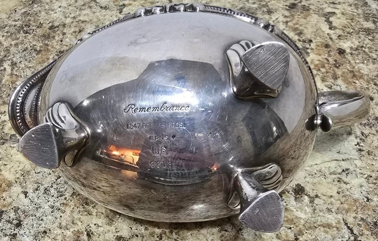 1847 Rogers Bros. company in the "Remembrance” and vintage silver-plated gravy boat is a collectible item. “Remembrance" pattern by 1847 Rogers Bros. Measures 8 x 4.25 x 6.