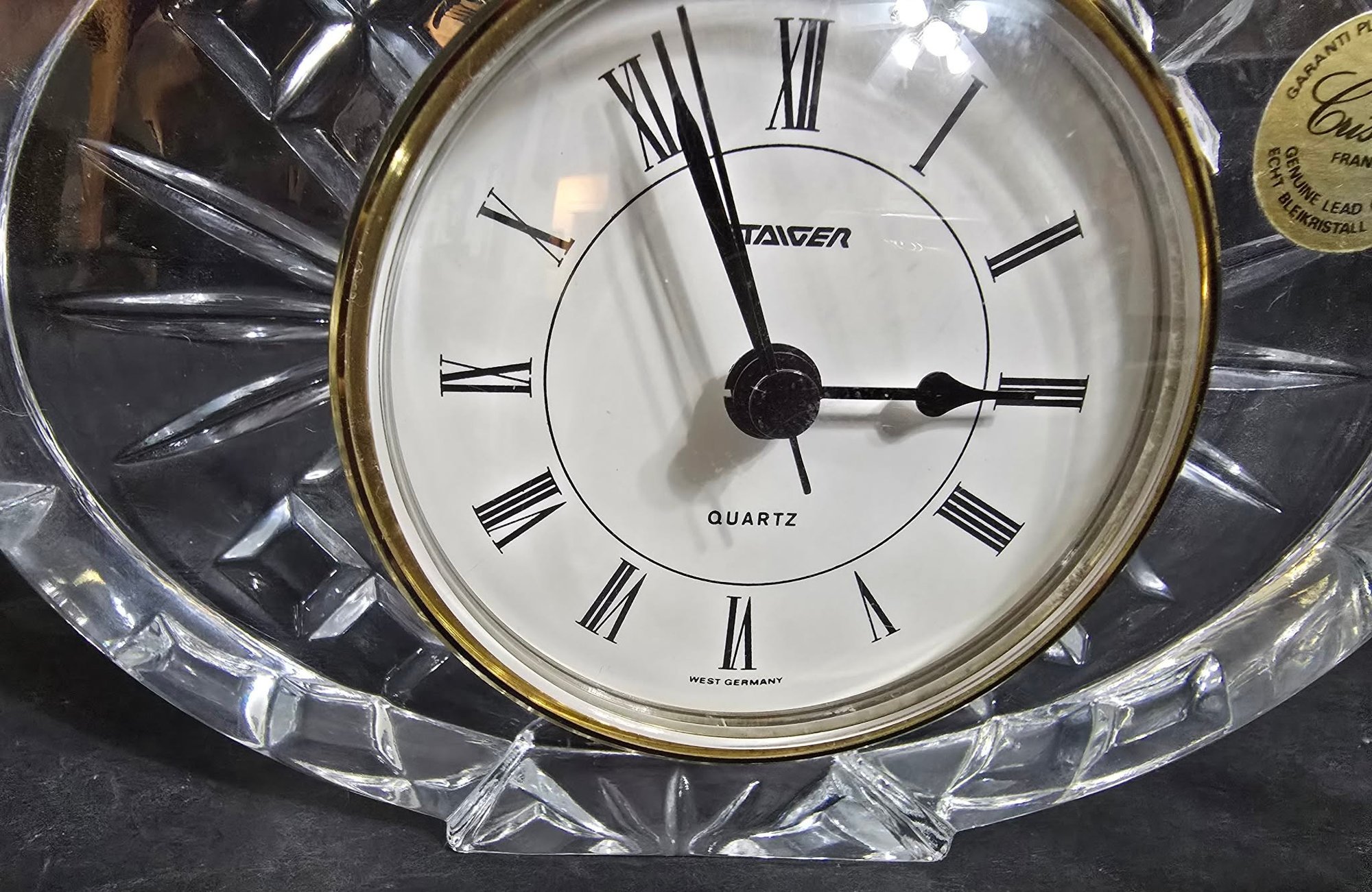 Vintage Staiger quartz mantel or desk clock housed in an oval cut lead crystal frame. Measures 6 x 4.5 x 1.5. Untested didn't have a battery to test. No cracks or chips noted.