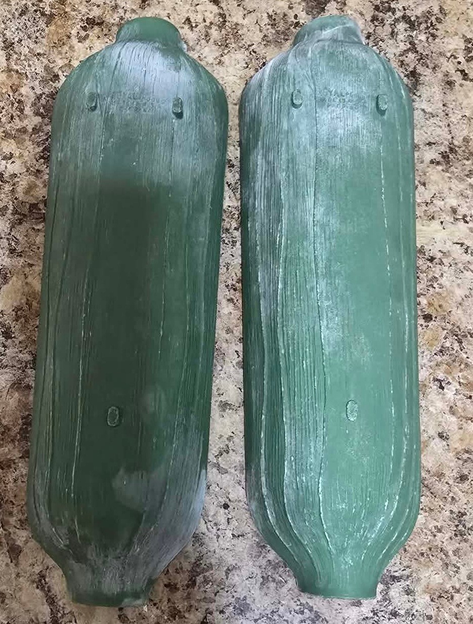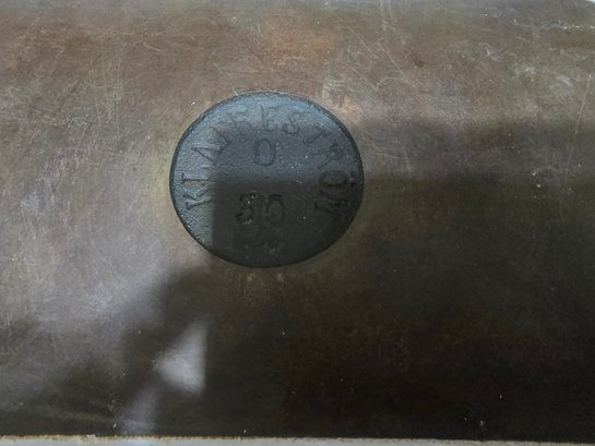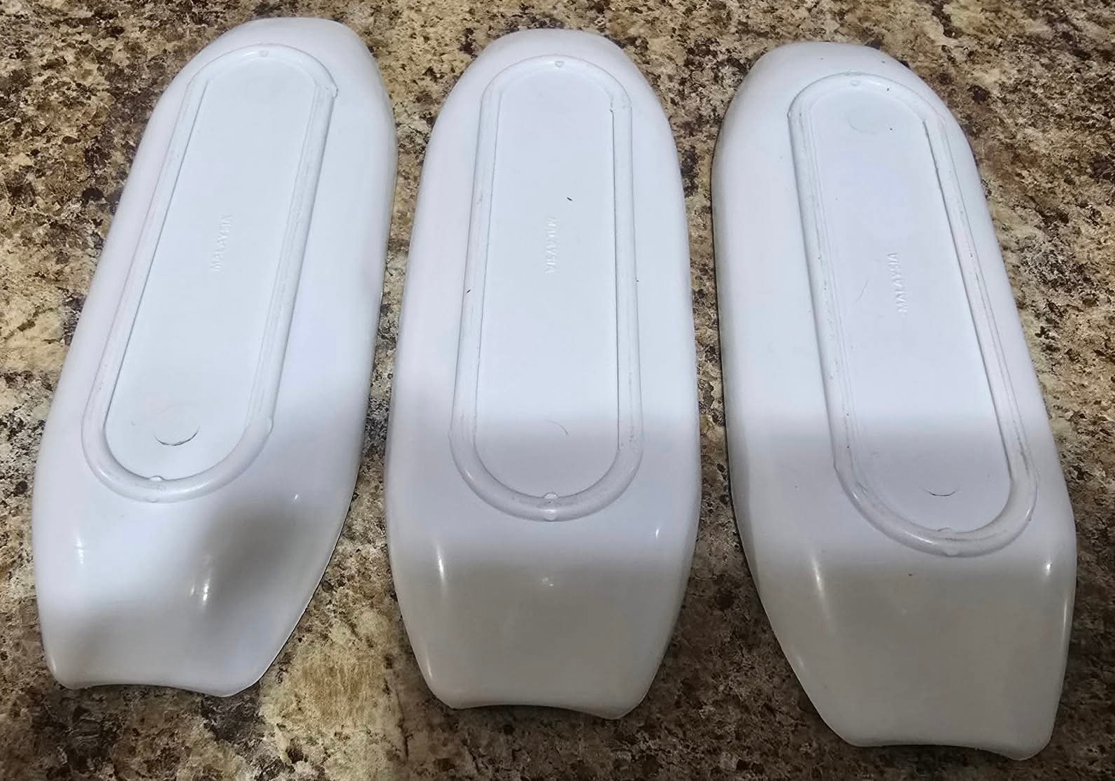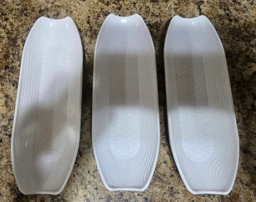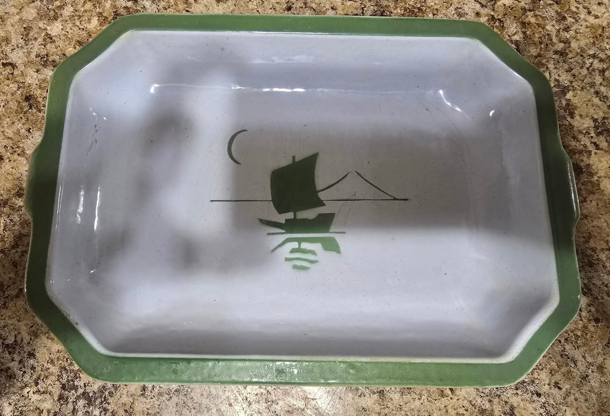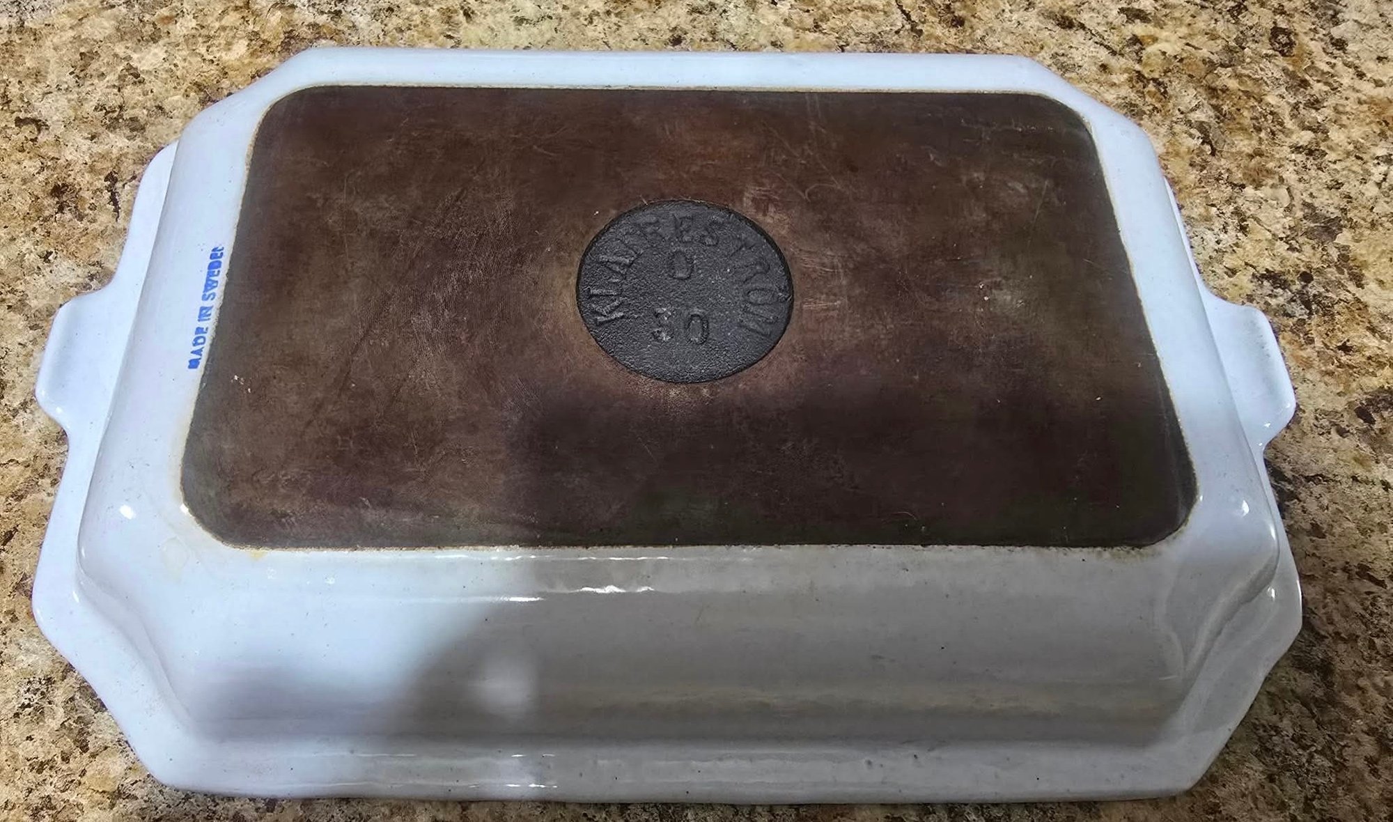 Vintage Swedish Klafrestrom enamel-over-cast-iron baking dishes feature a distinct mid-century modern Scandinavian design with a nautical sailboat pattern. With plastic corn holder dishes. Needs some cleaning. Dish measures 12 x 8 x 1.5.