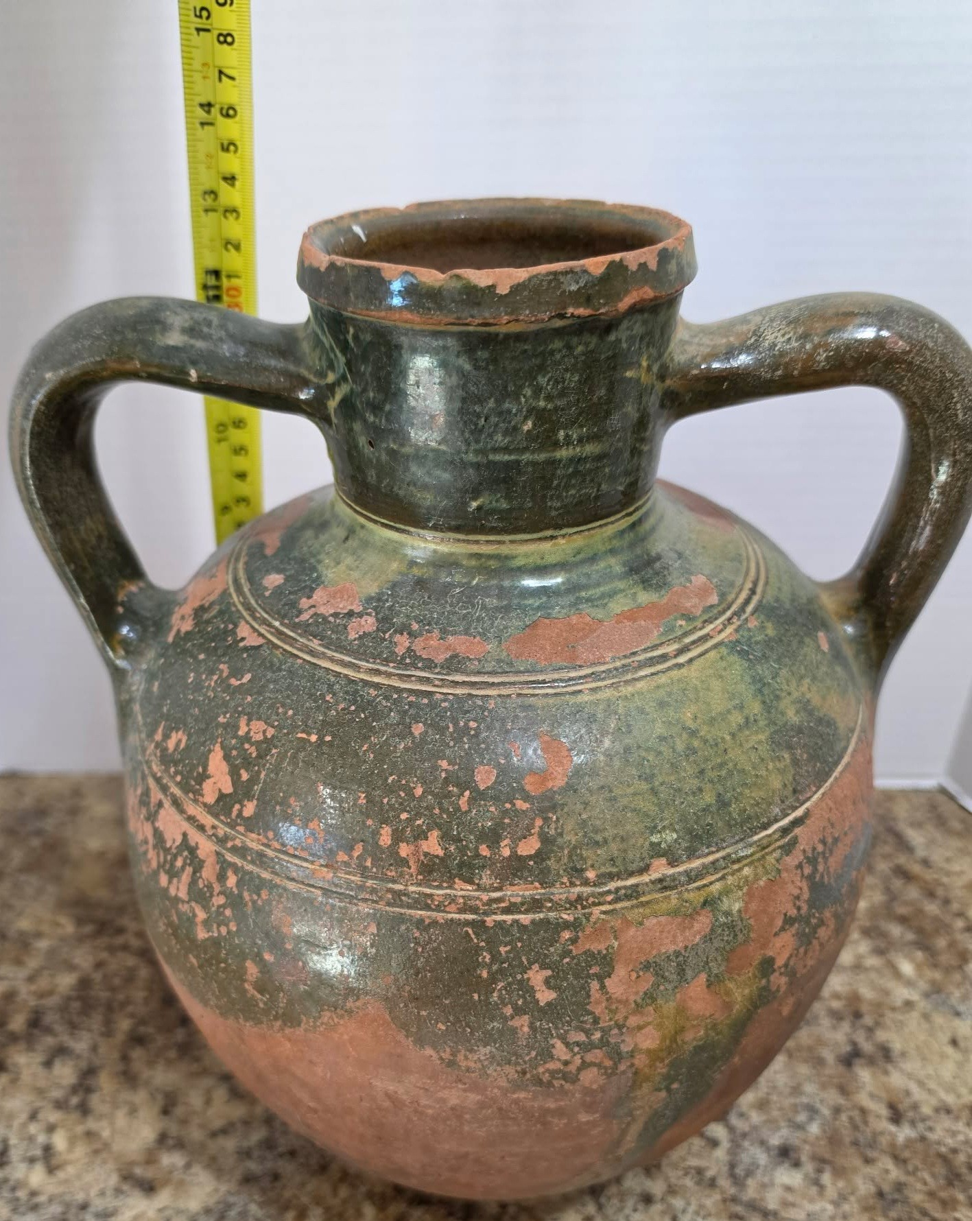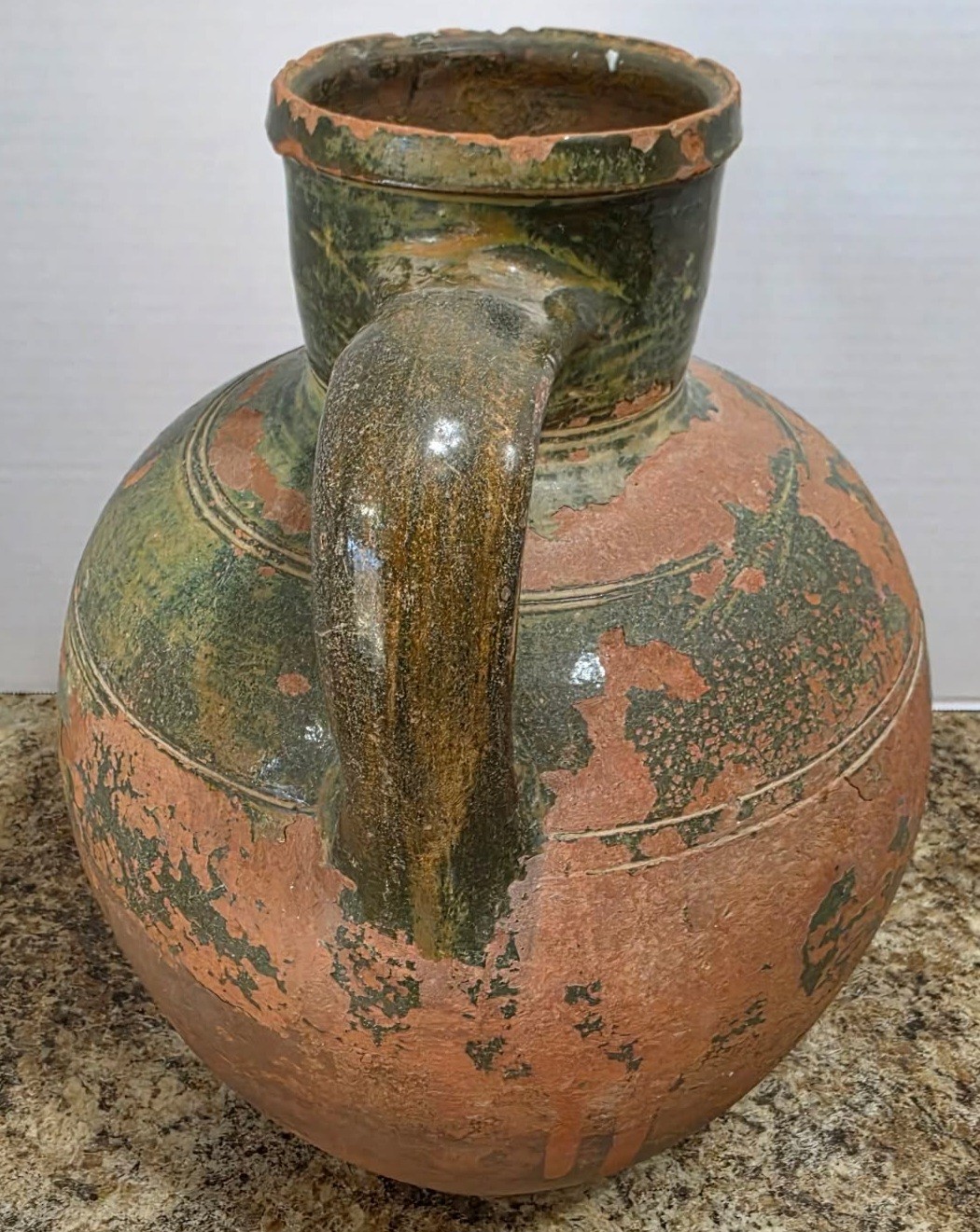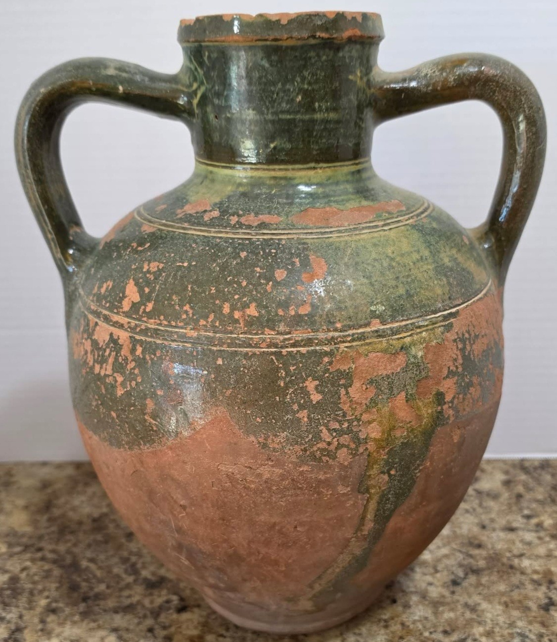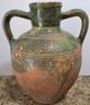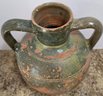 Vintage terracotta jug with green glaze and two handles.