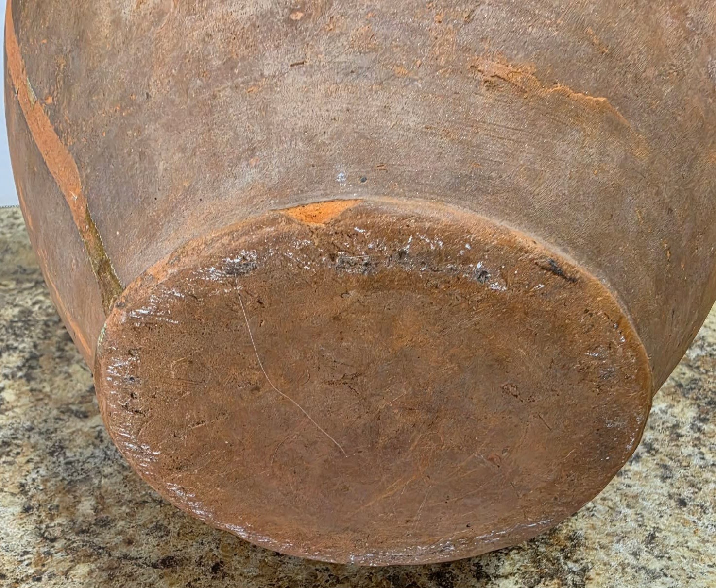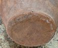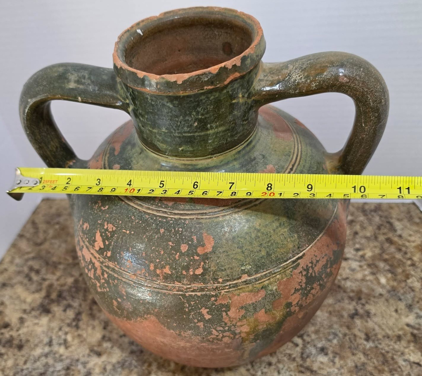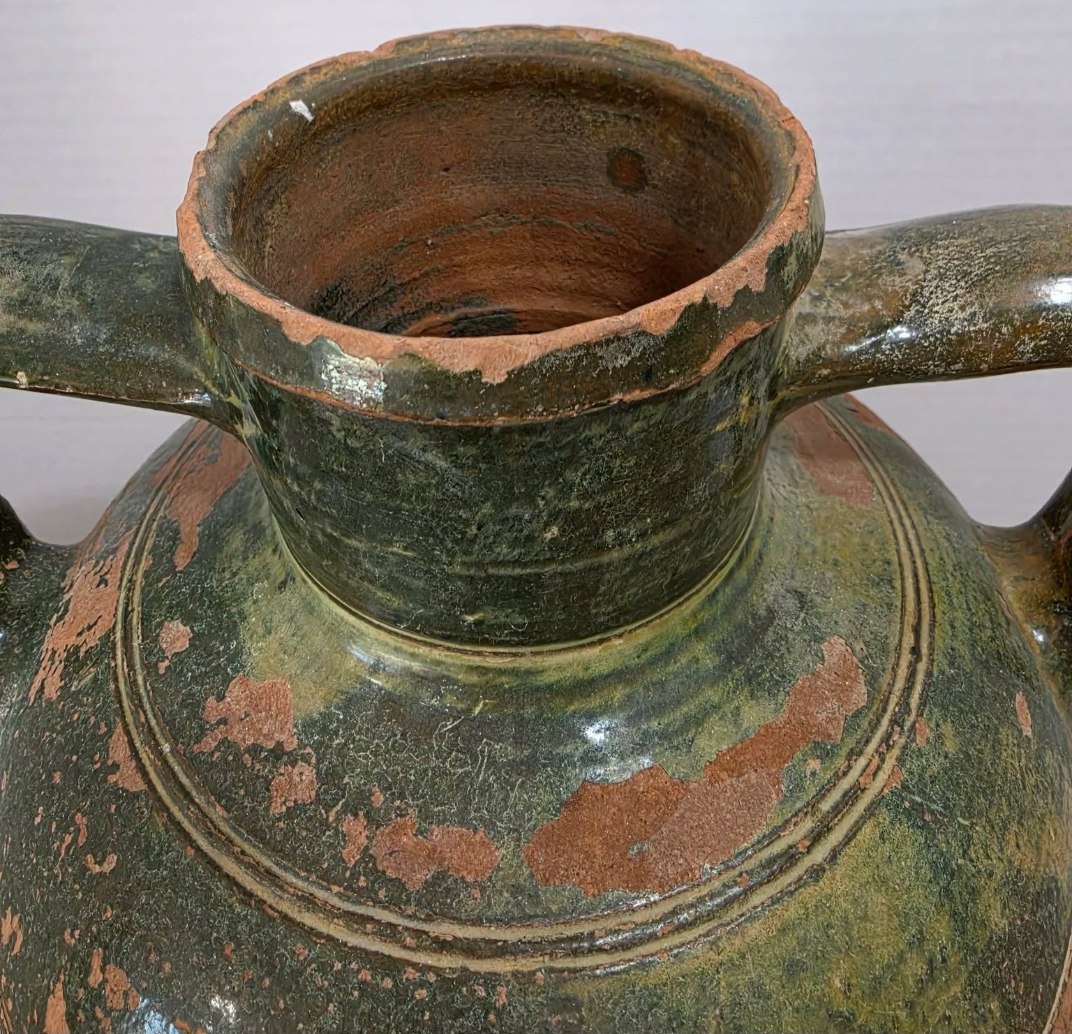 Vintage terracotta jug with green glaze and two handles.