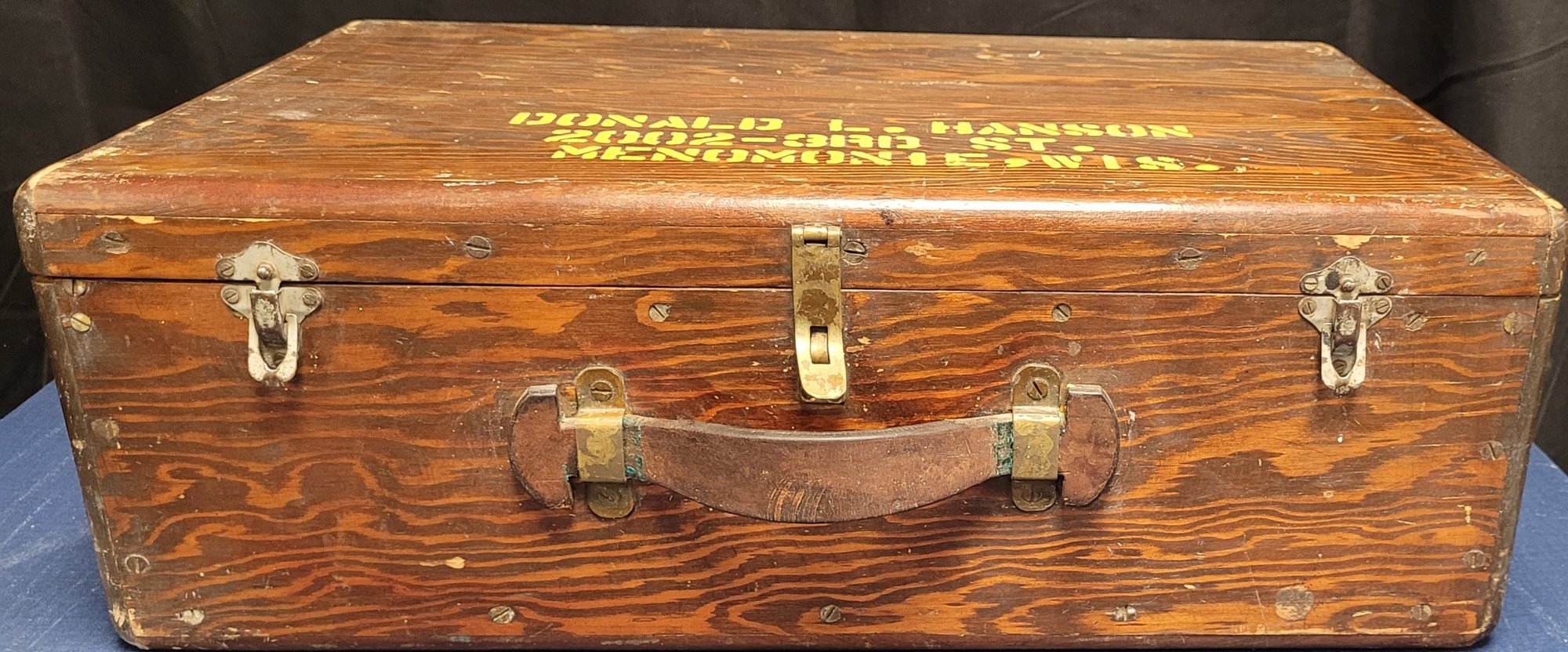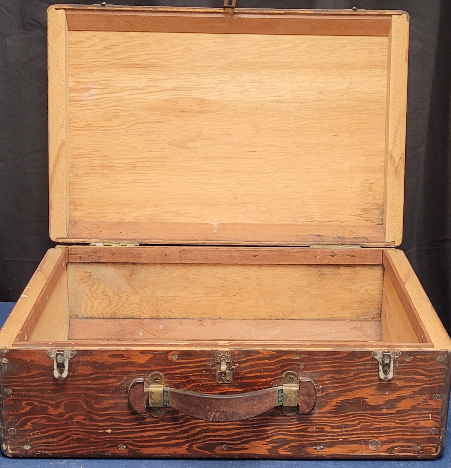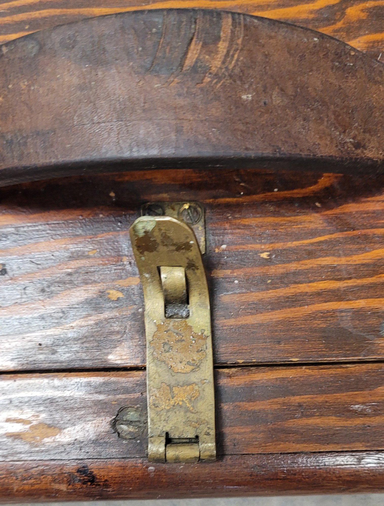This measures 23" long by 15" wide by 8" tall. The latch on this is bent. See pictures for details.