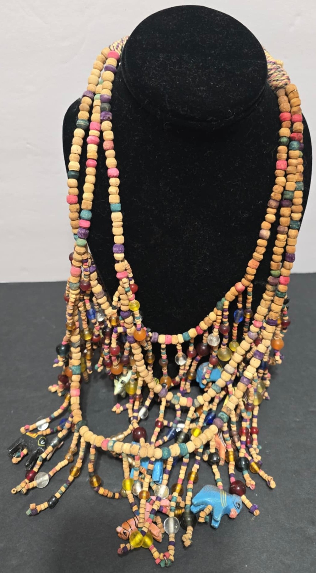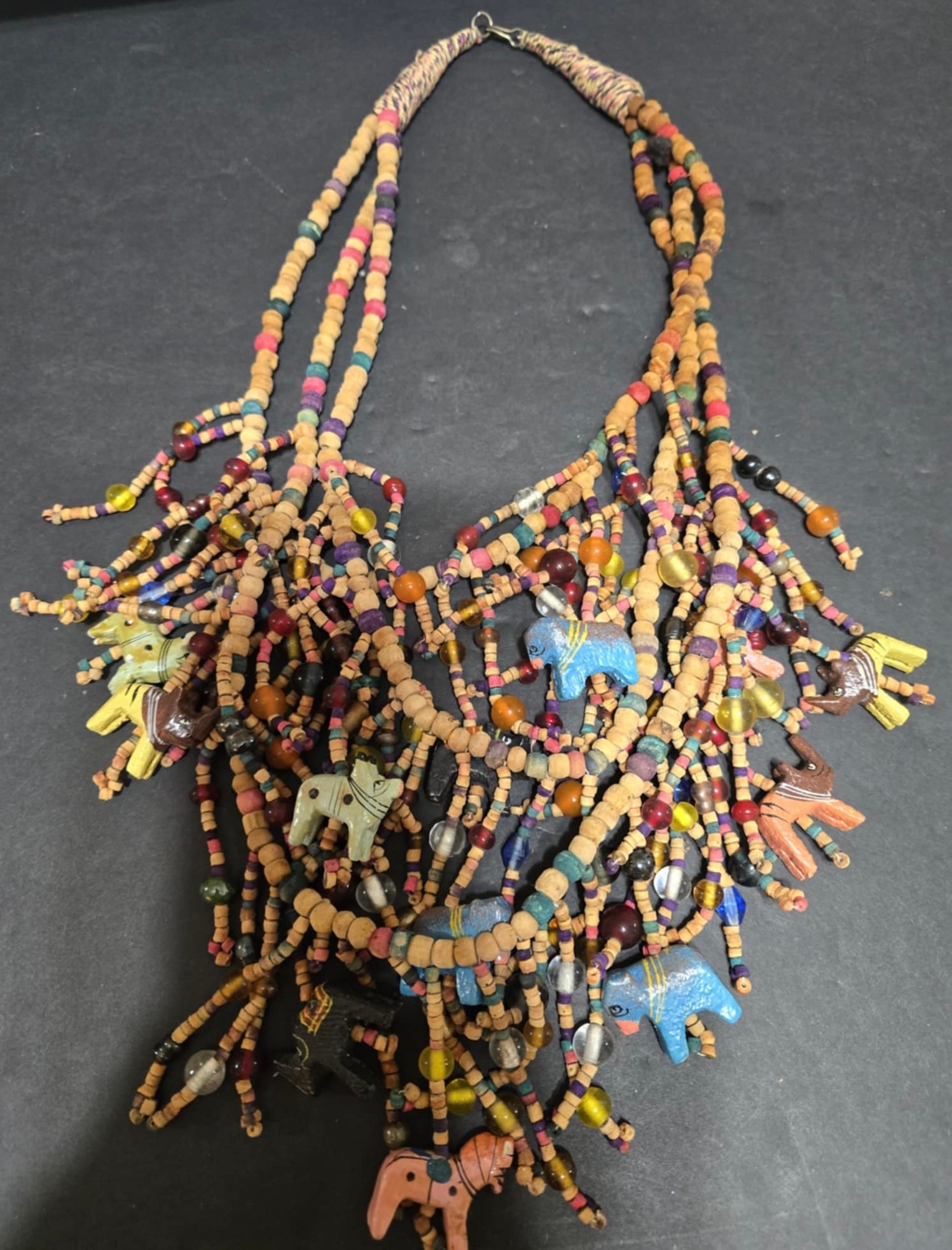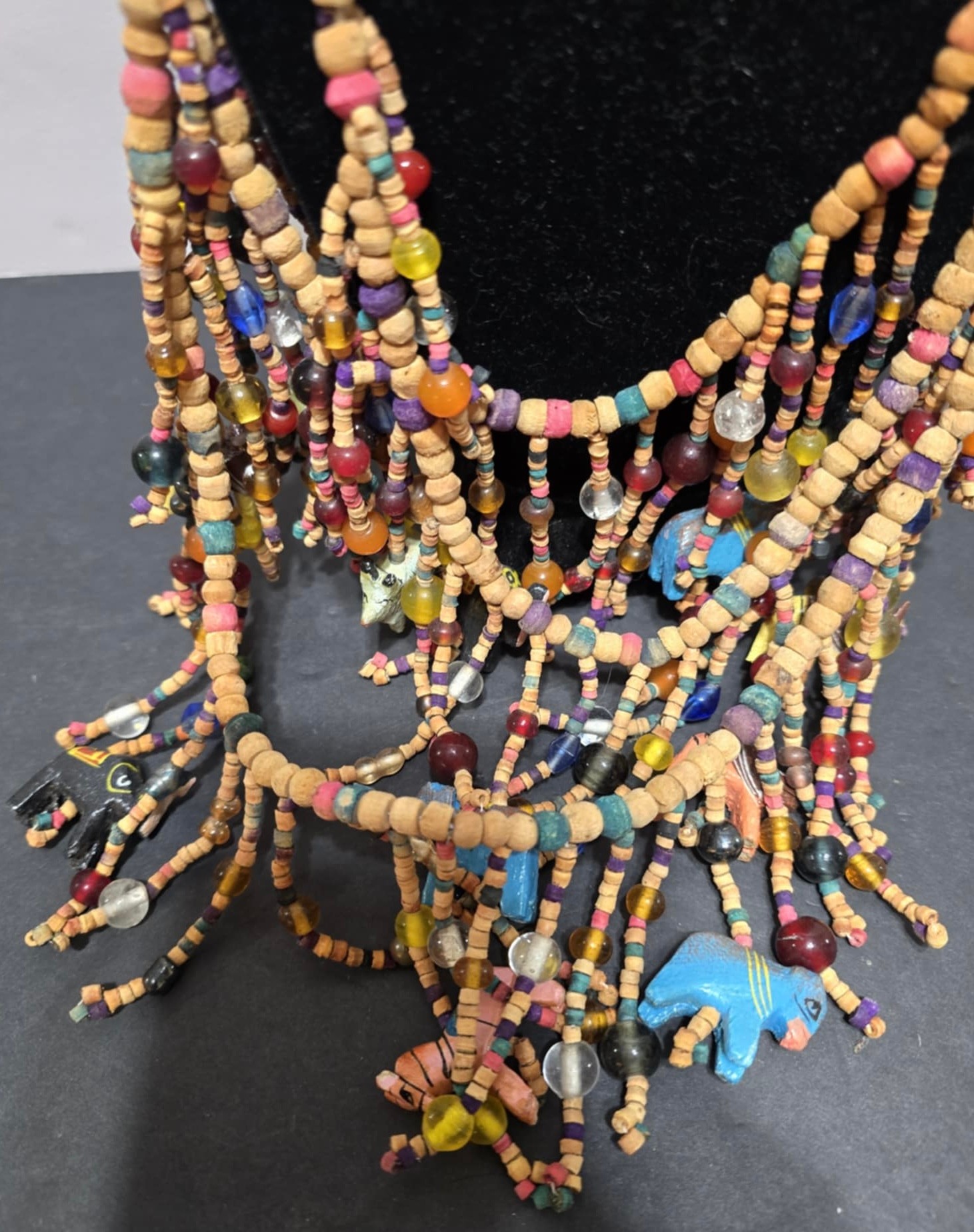 Vtg. African Multi-Strand Wooden Carved Animals & Beads Necklace.