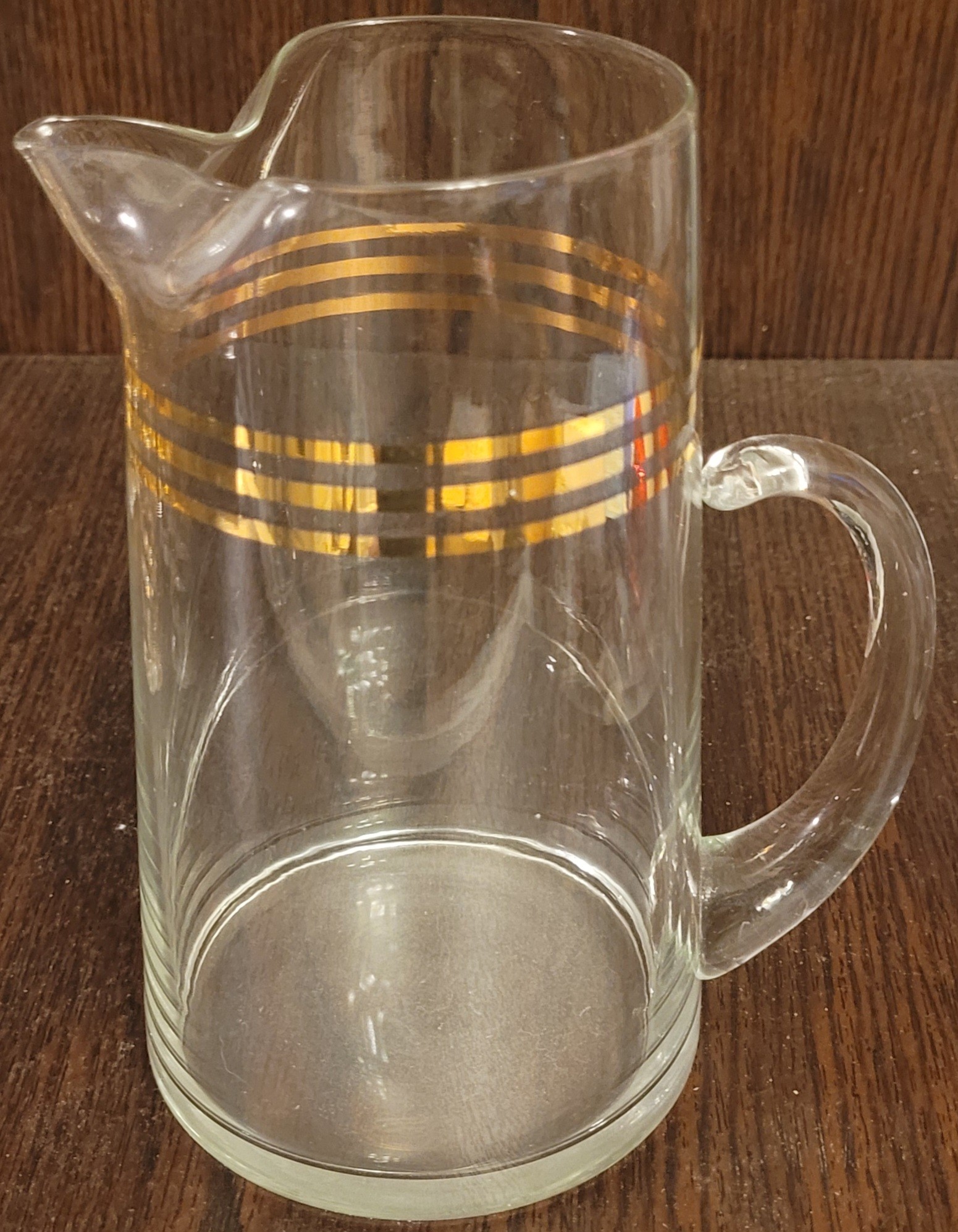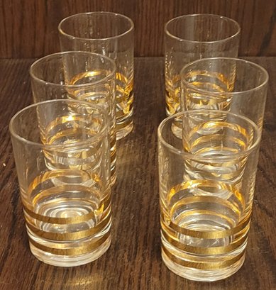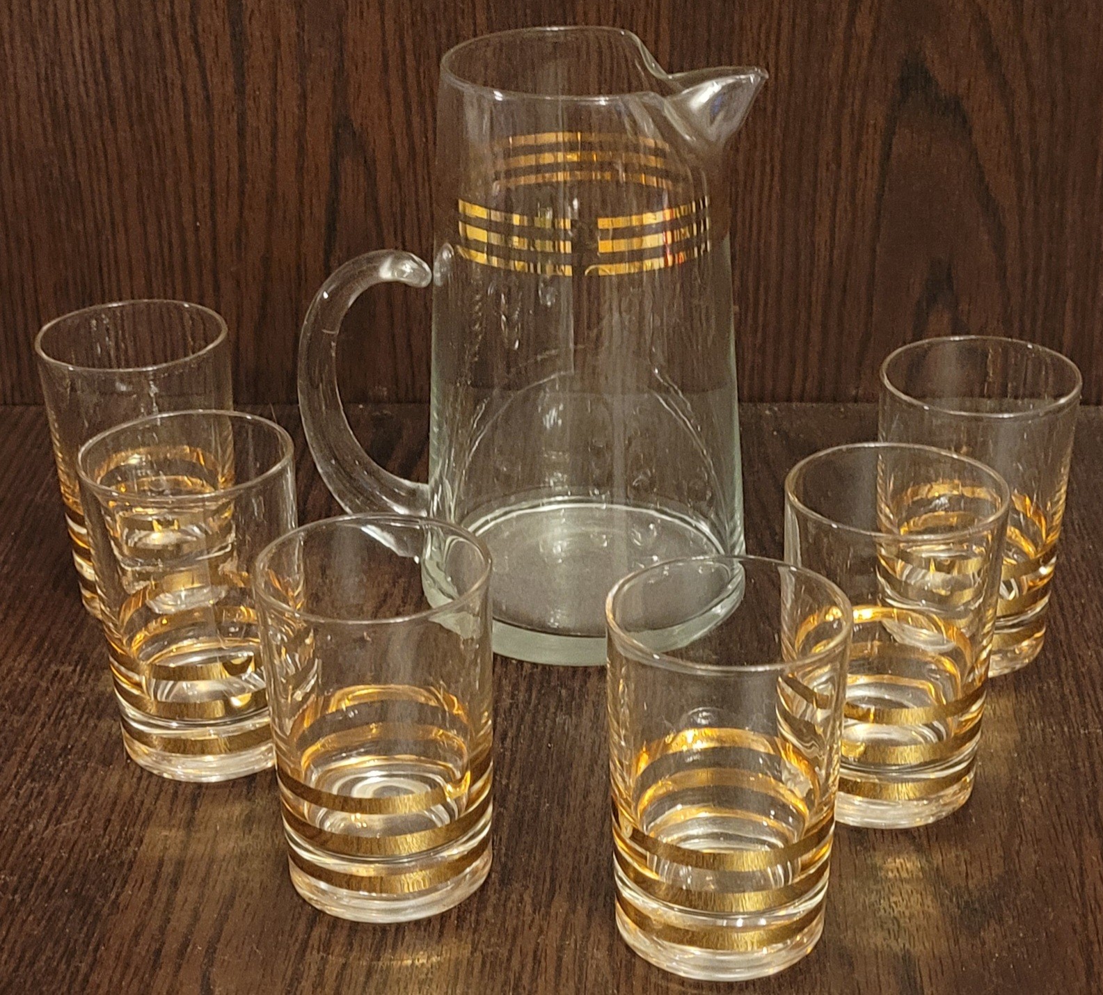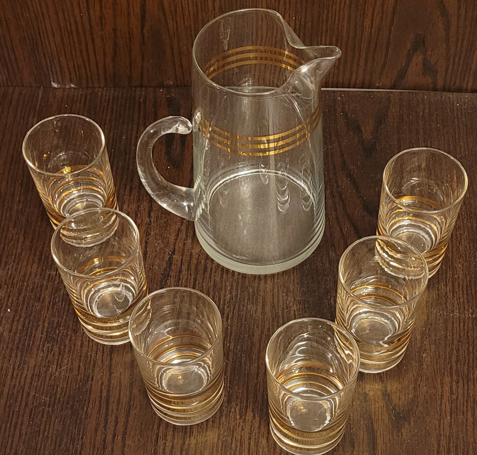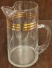 This vintage Mid Century Modern decanter is perfect for serving juice or cocktails. The gold color and horizontal lines on the trim add a touch of elegance to any bar or kitchen. This decanter comes with 6 glasses and is made of high-quality glass material. The brand is unmarked, and it is a vintage original from the 1940s, 1950s, and 1960s. It is a great addition to any collection of drinkware and barware.