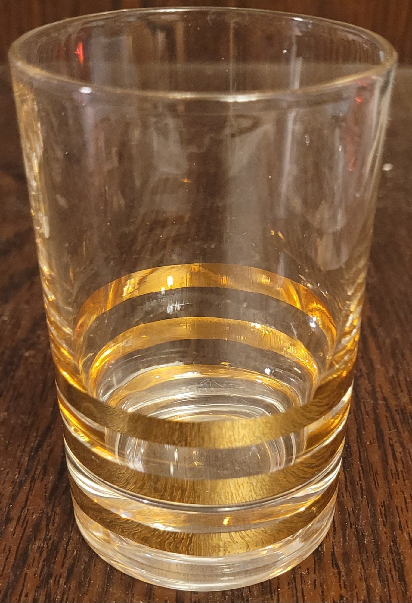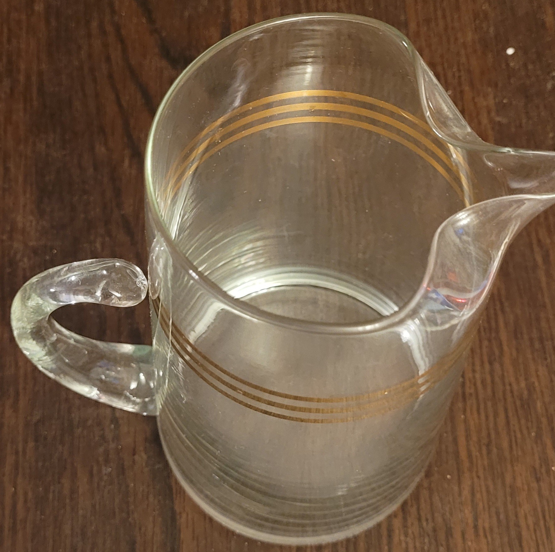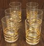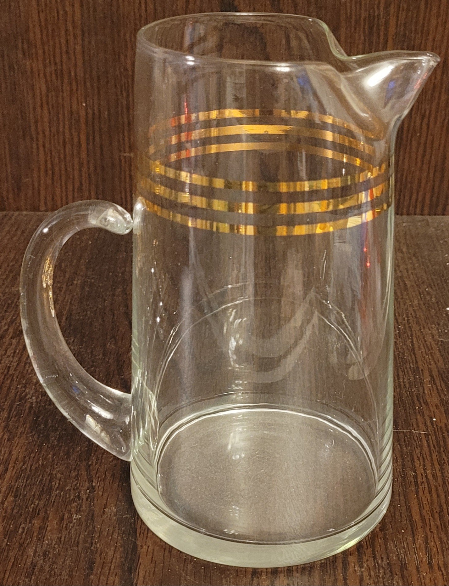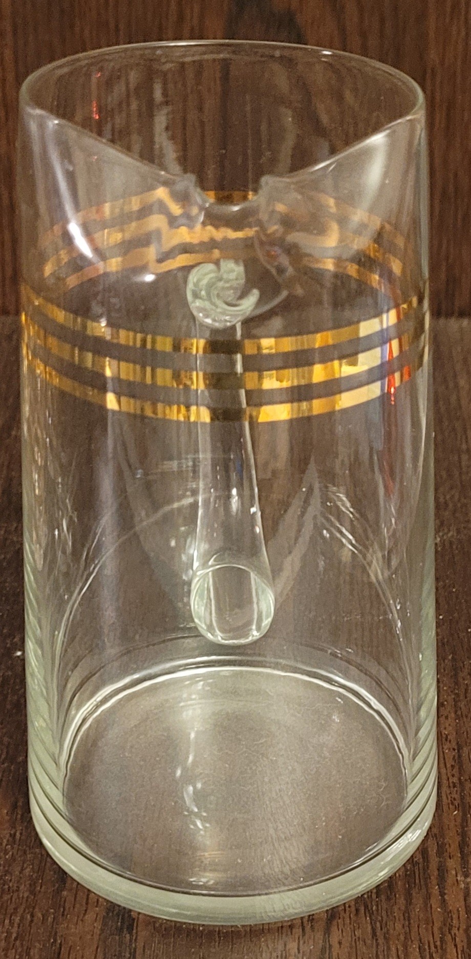 This vintage Mid Century Modern decanter is perfect for serving juice or cocktails. The gold color and horizontal lines on the trim add a touch of elegance to any bar or kitchen. This decanter comes with 6 glasses and is made of high-quality glass material. The brand is unmarked, and it is a vintage original from the 1940s, 1950s, and 1960s. It is a great addition to any collection of drinkware and barware.