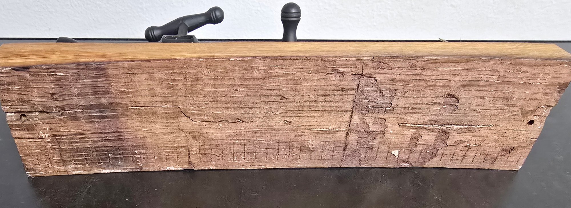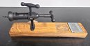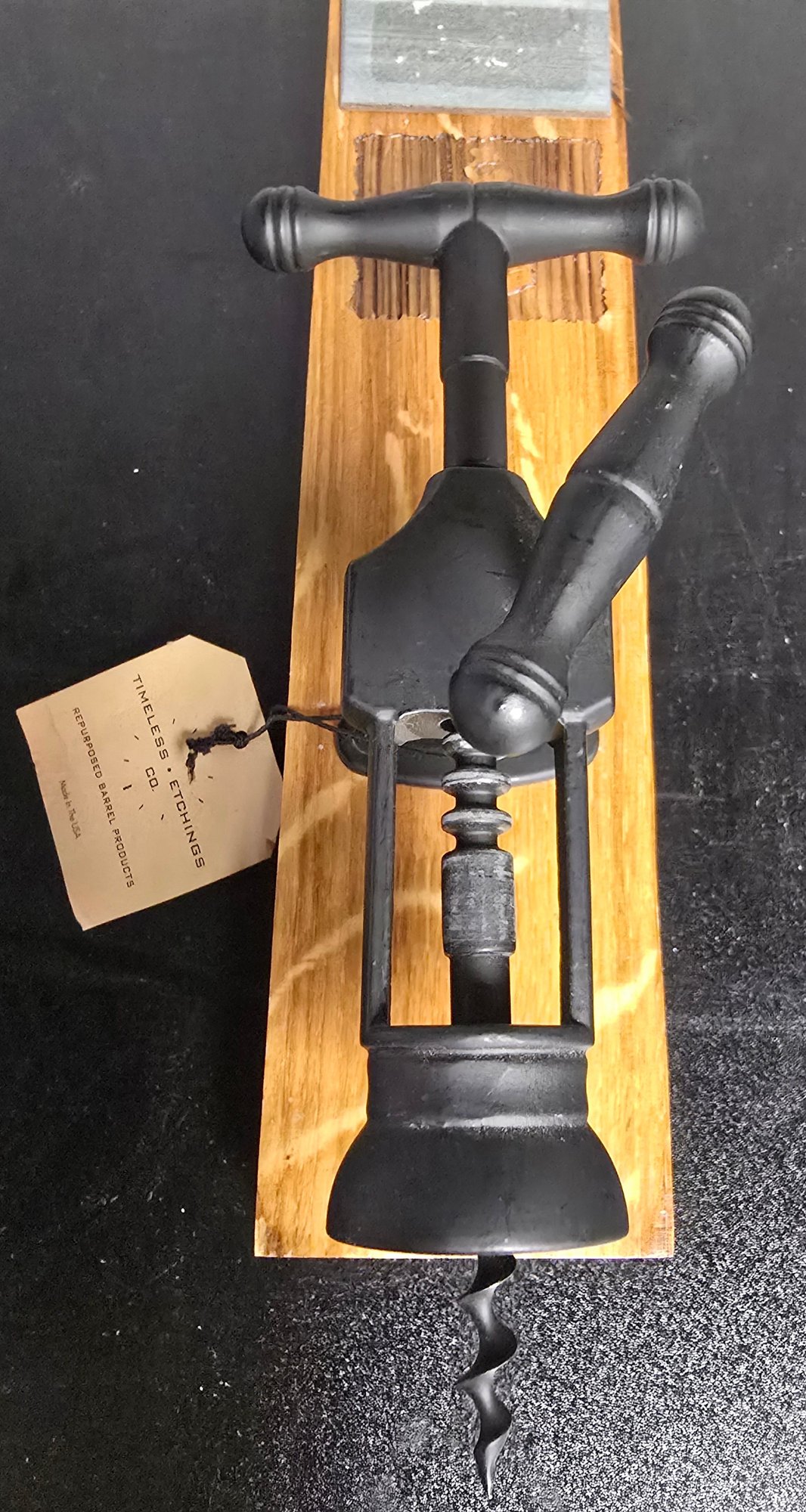 Wall-mounted wine bottle opener crafted by Timeless Etchings Co. from a repurposed wine barrel. Measures 12 x 3 x 5. Please see all pics for details.