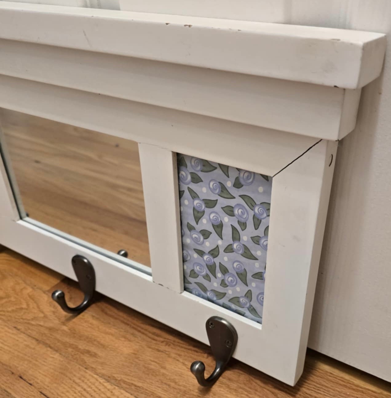 White wooden wall-mounted mirror with three coat hooks. You can add your own photos on each side of mirror. Measures 22.5 x 12. Photo area is 3.5 x 5.5. Could be painted.