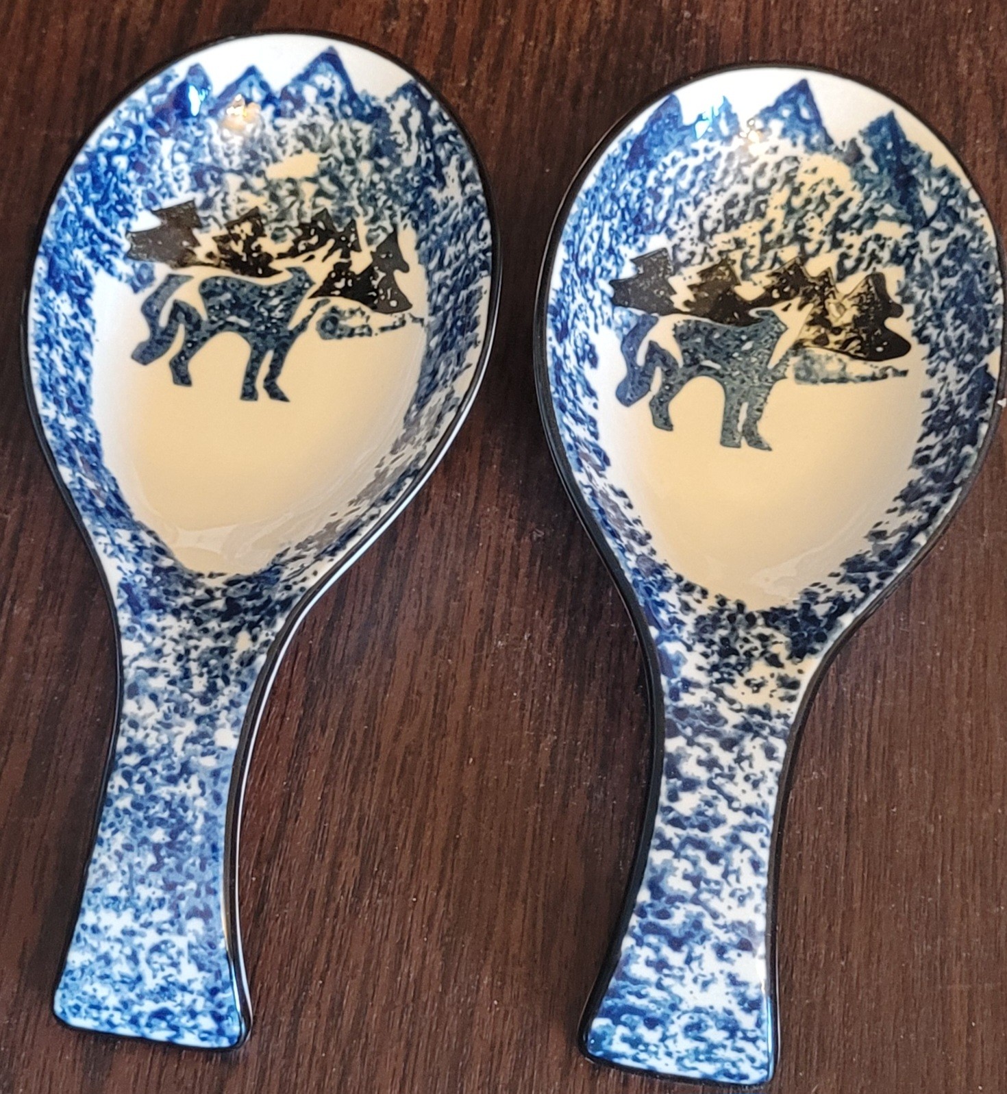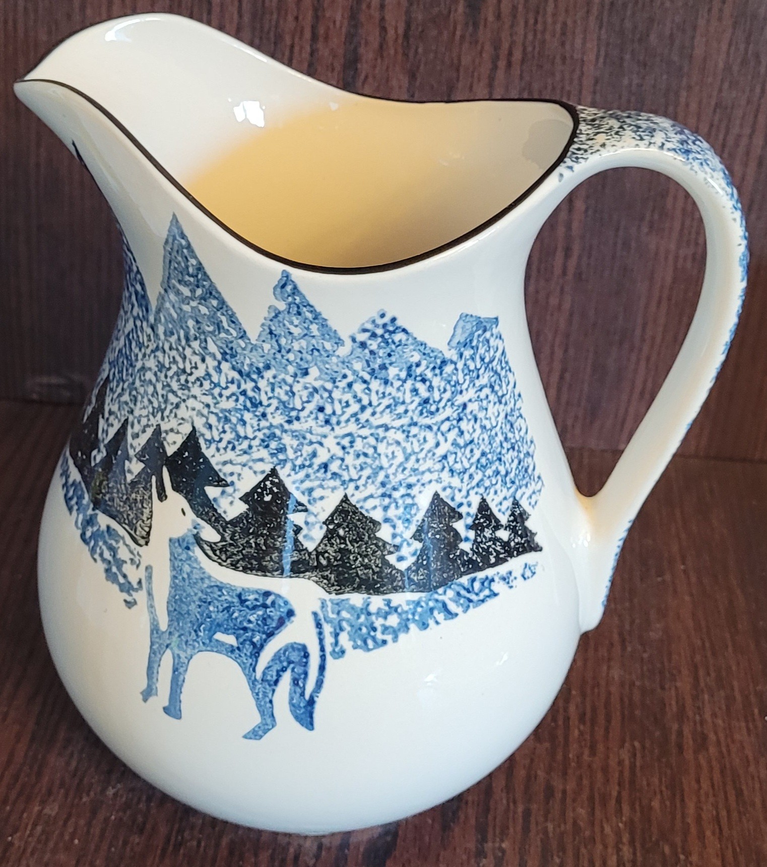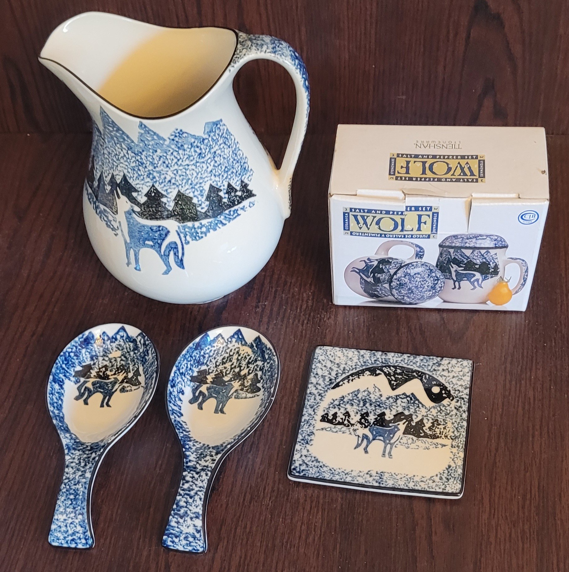This lot comes with a pitcher that measures 8.75" tall, 2 spoon rests that measures 8" long, 2 trivets each measures 5" long by 5" wide, and last is Salt and pepper shakers. All in excellent condition. See pictures for details.