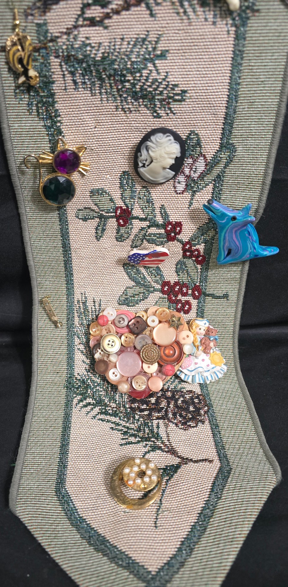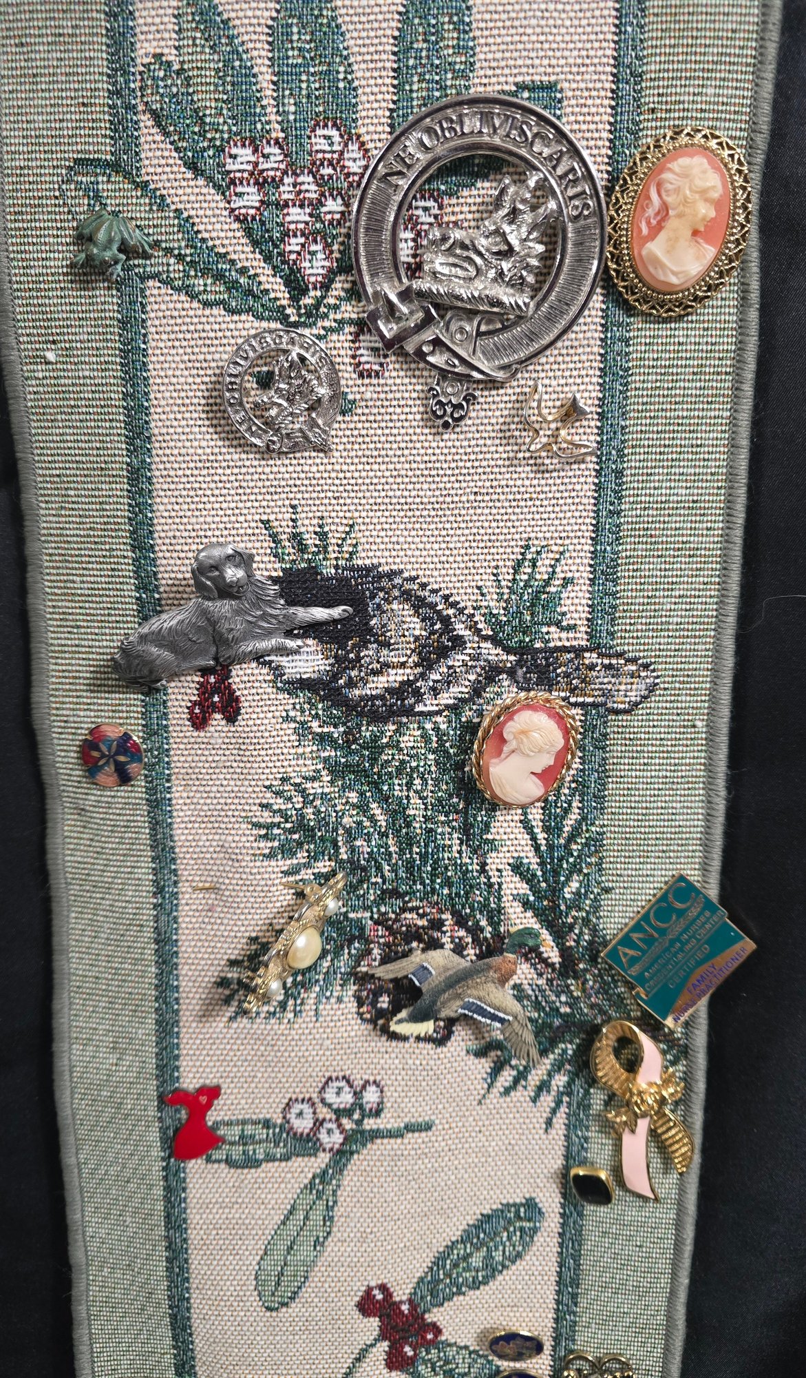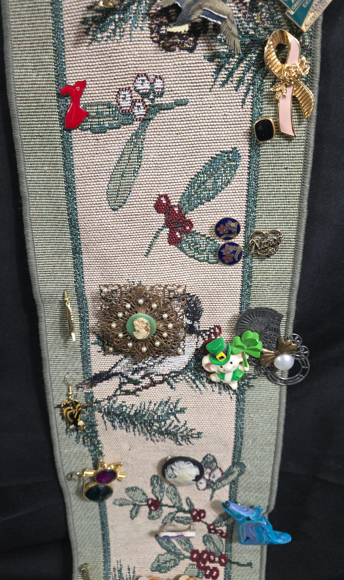 A vintage needlepoint or tapestry bell pull used as a wall hanging for displaying assorted brooches and pins.