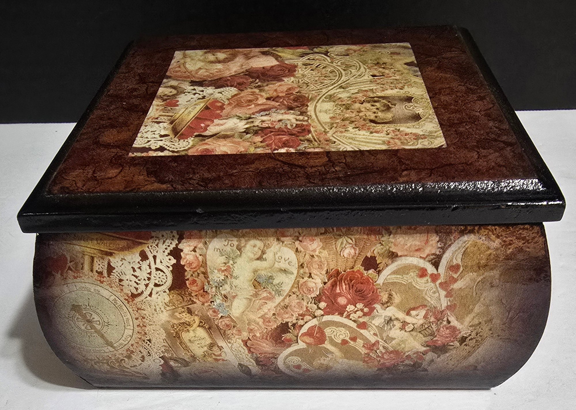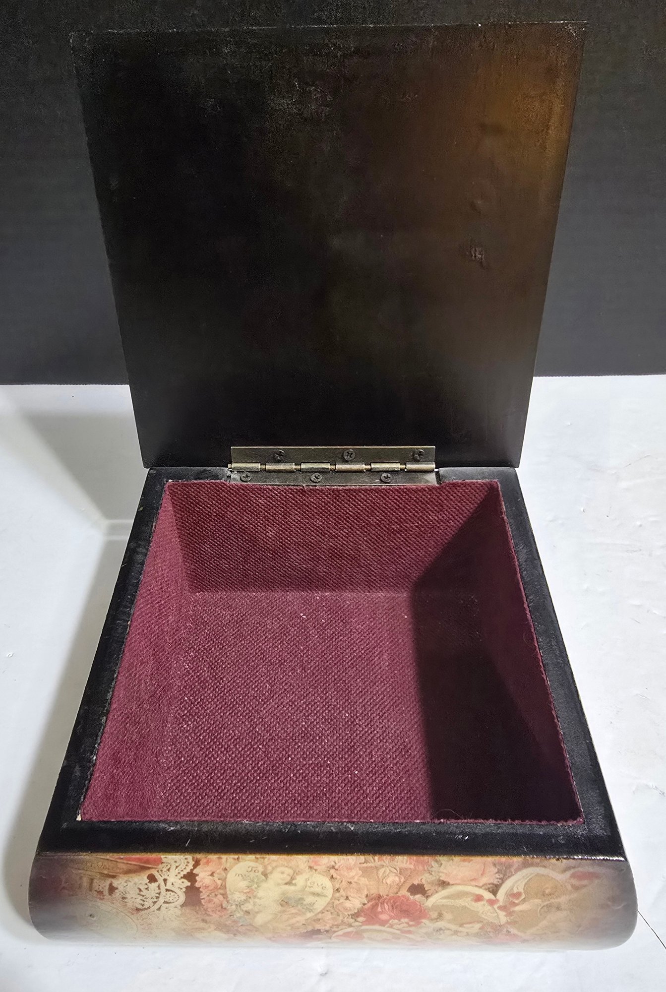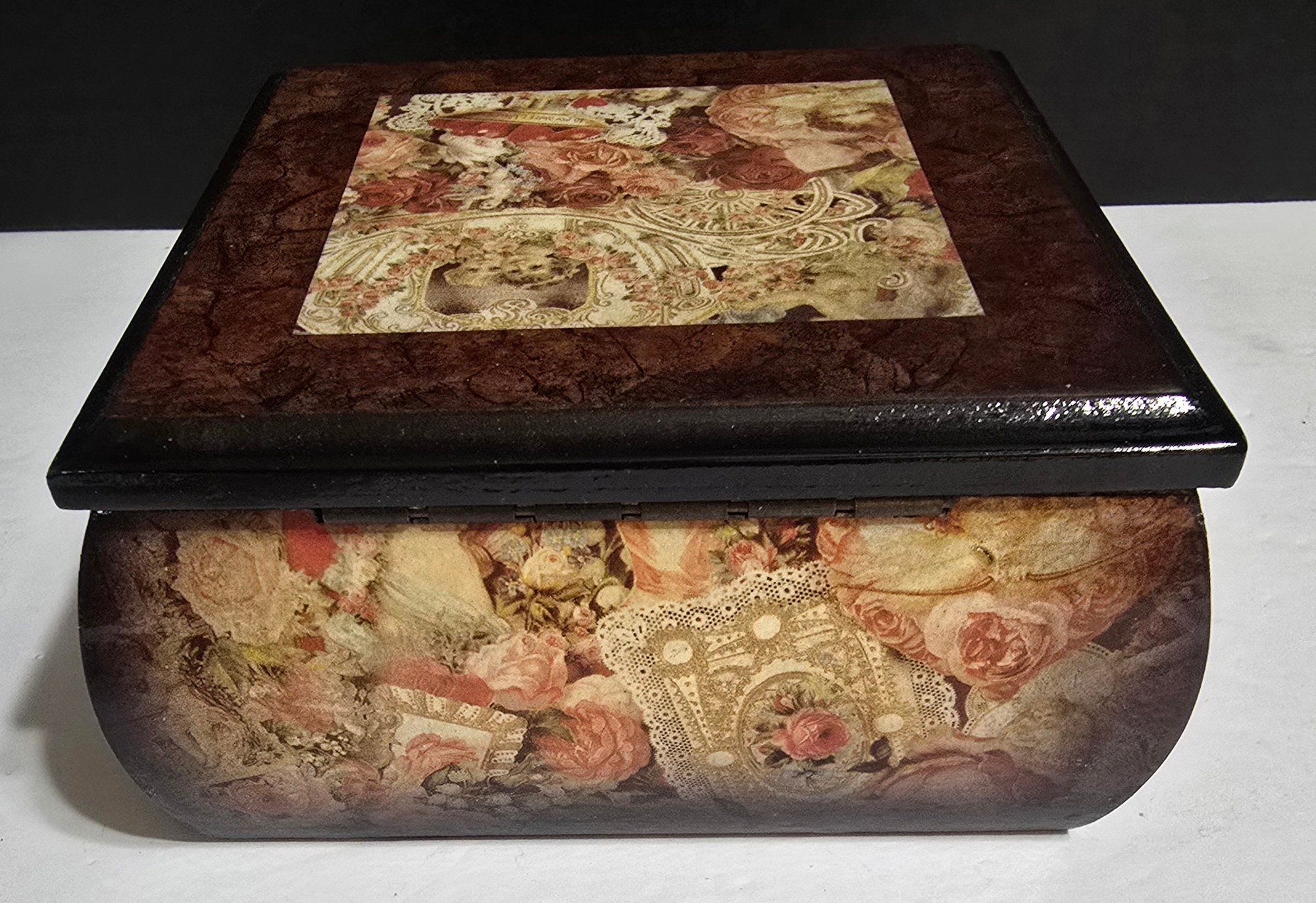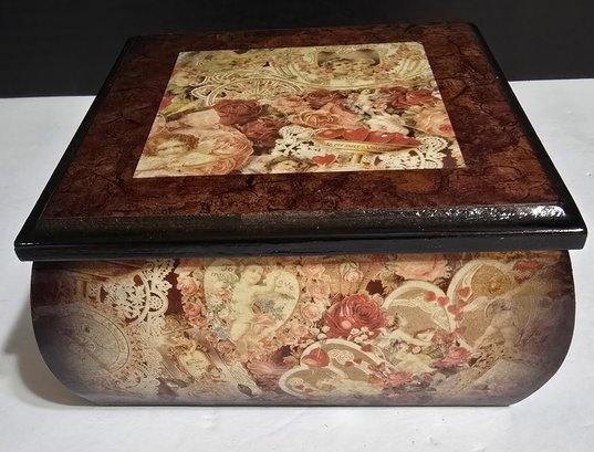 Wooden Hand Crafted Floral Decoupage Jewelry Box. Measures 6 x 6 x 2.75. Please see all pics for details.