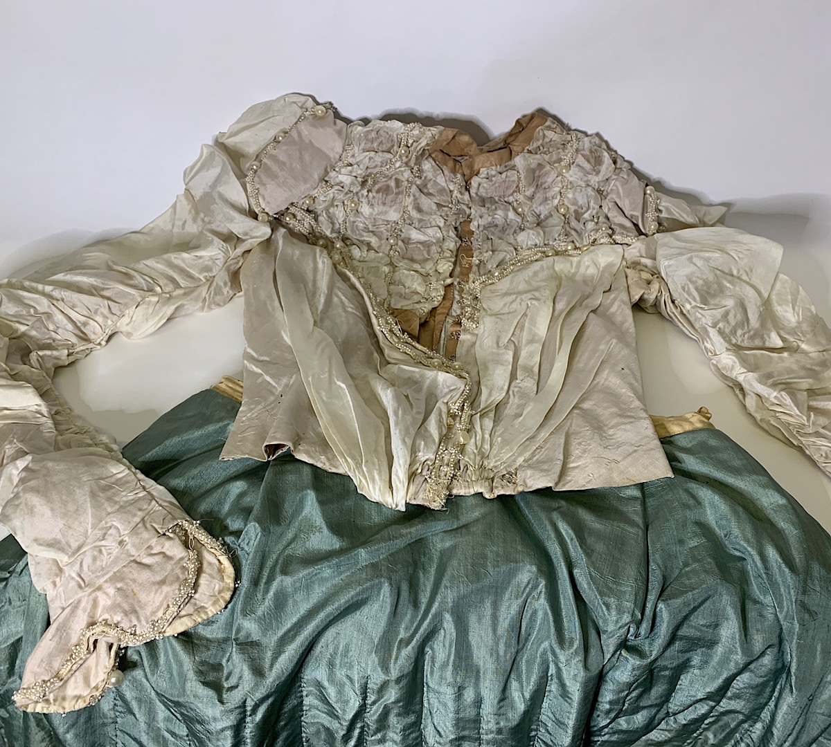 Silk petticoat with home spun lining and quilting, very good condition for age with some soiling at hem, hand sewn blouse heavily corseted, hand sewn apron and early pillow case (dated 1833). Please refer to photos for better look at condition.