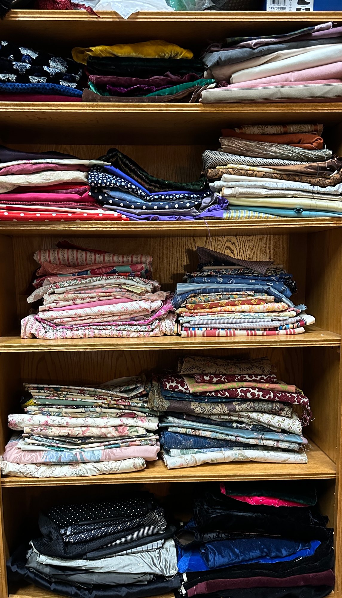 Includes a large variety of vintage and antique fabrics, yardage, scraps and samples. cotton, silk, velvets (some silk), florals, upholstery, dress silks etc