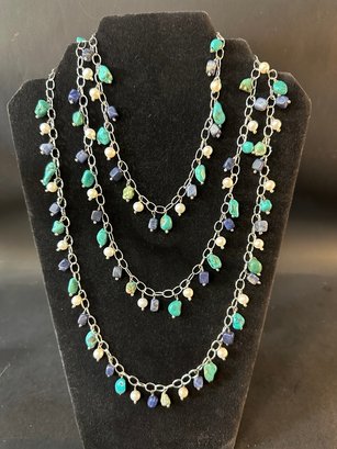Opera Length Sterling, Turq, Lapis, Pearl Necklace
