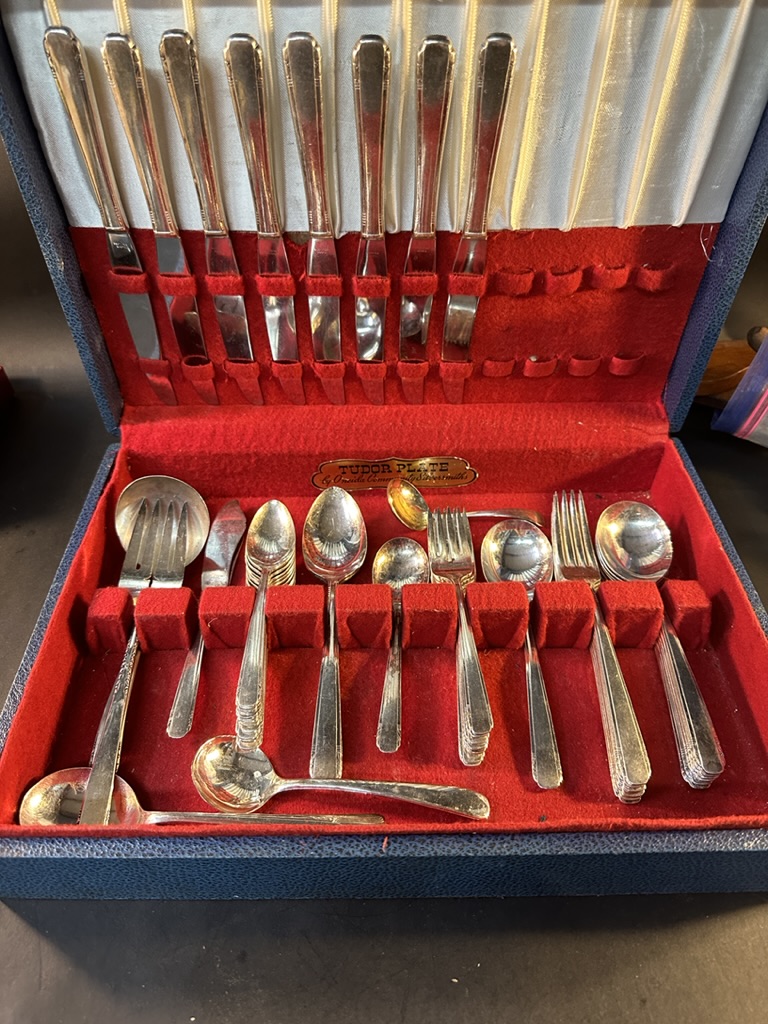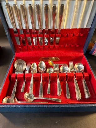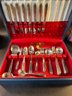 7 dinner forks, 8 salad forks, 8 soup spoons, 8 knives 10 teaspoons, 2 tablespoons, 1 large serving spoon, 1 butter knife, (5 misc serving pieces, different pattern)