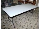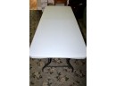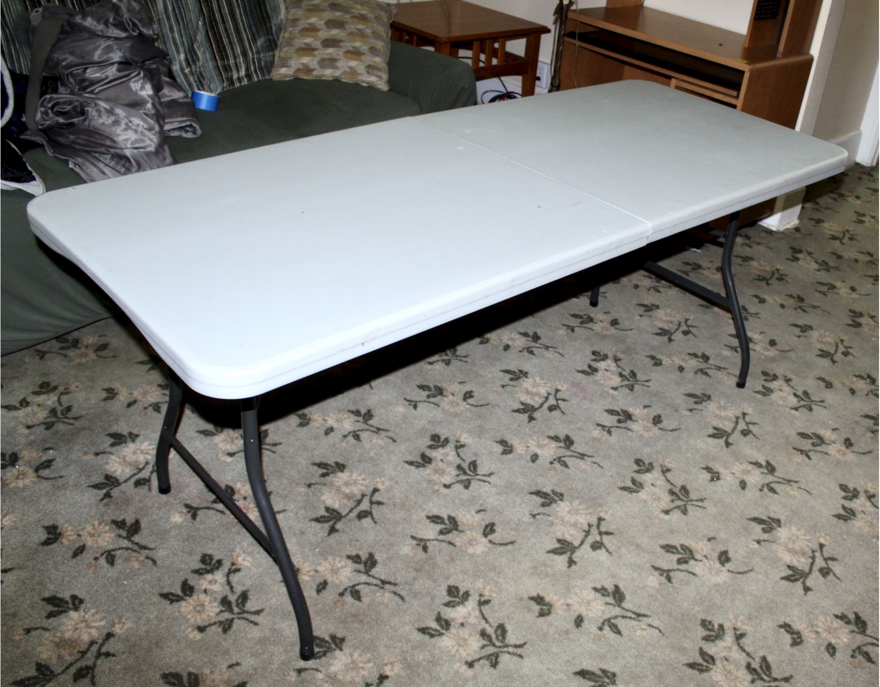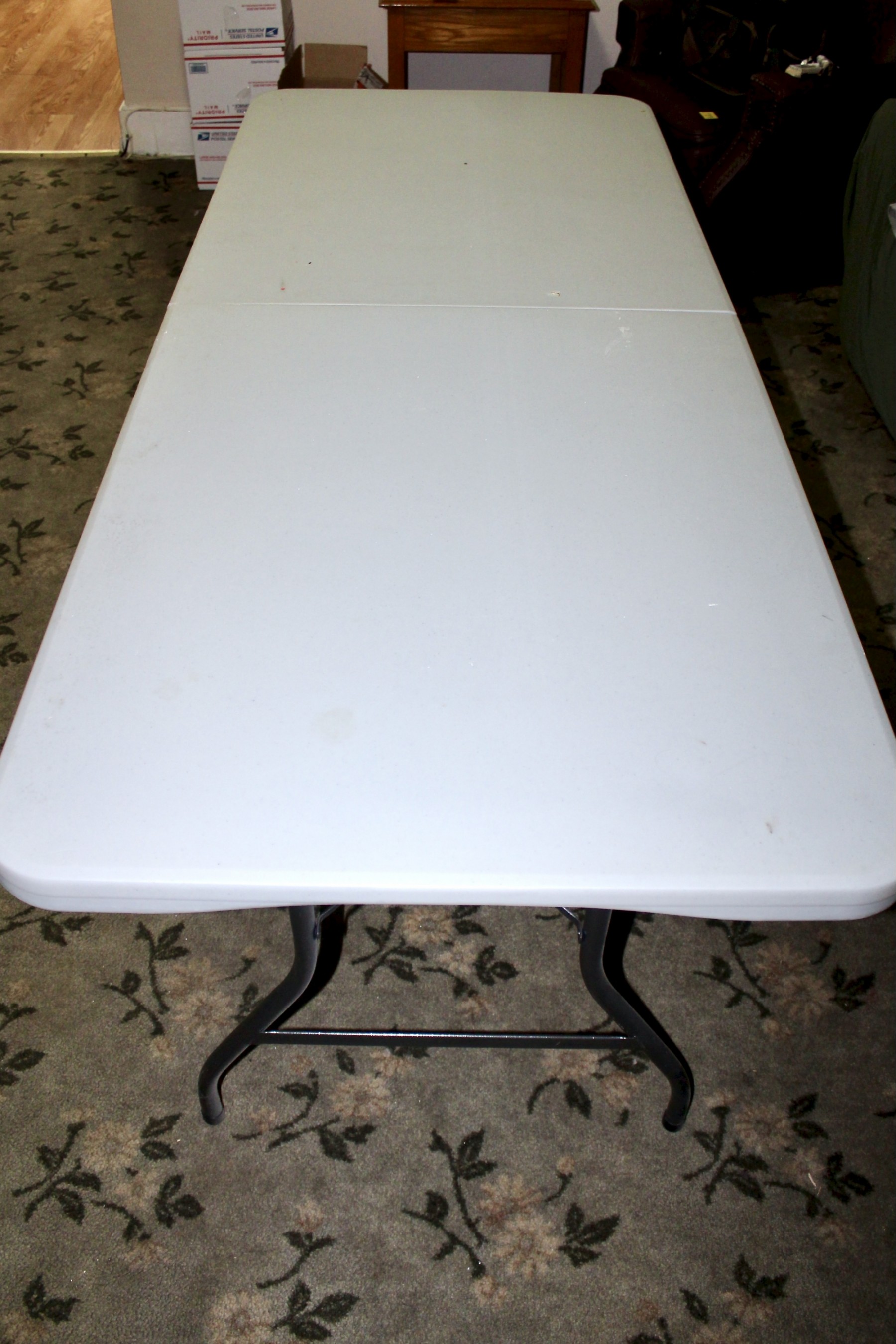 6FT PLASTIC TOP RECTANGLE FOLDING TABLE CARRY HANDLES FOR EASY TRANSPORT - GOOD CONDITION! There are natural scratches on table due to years of use.