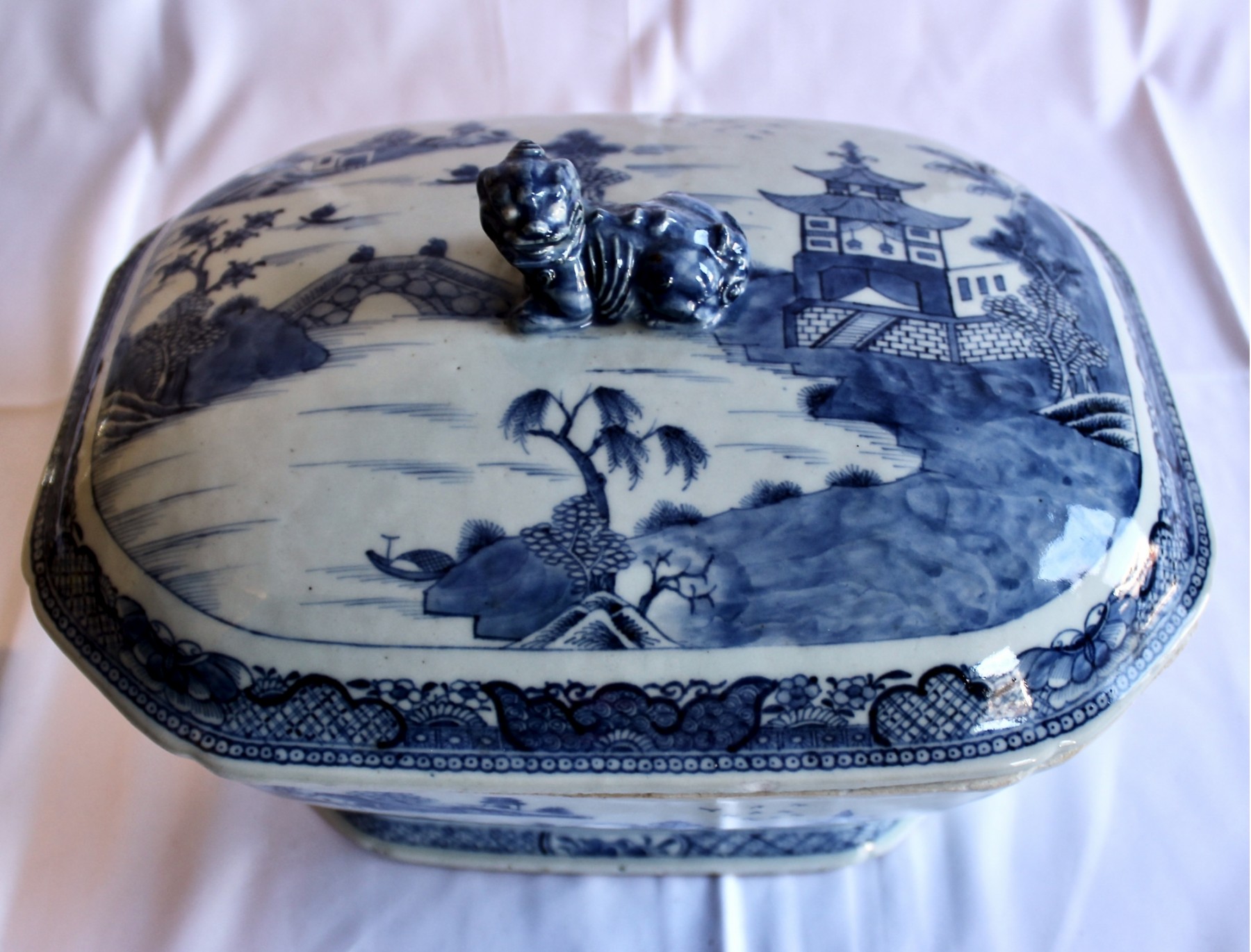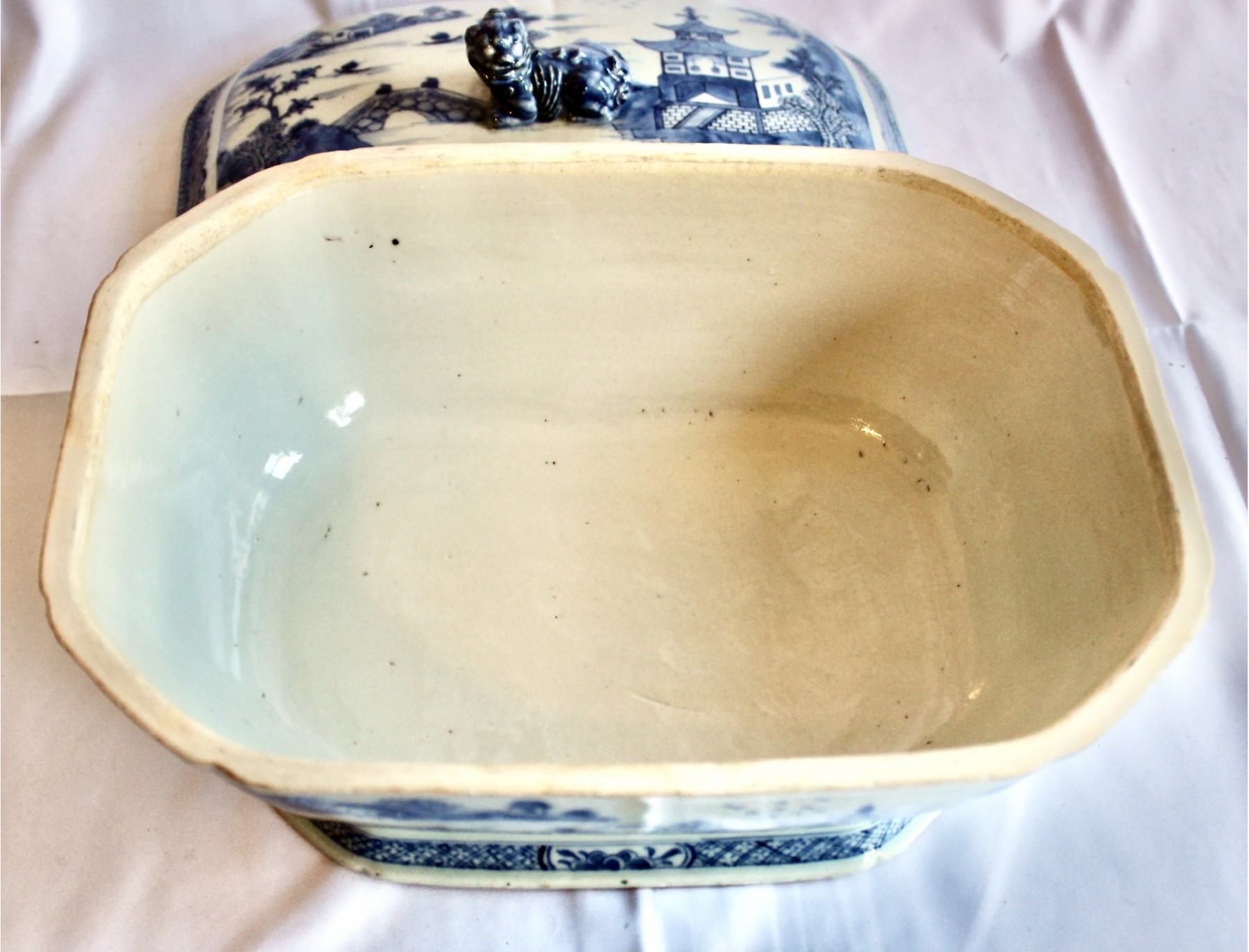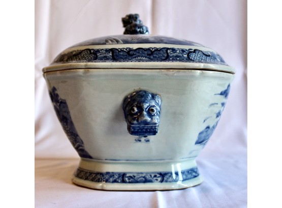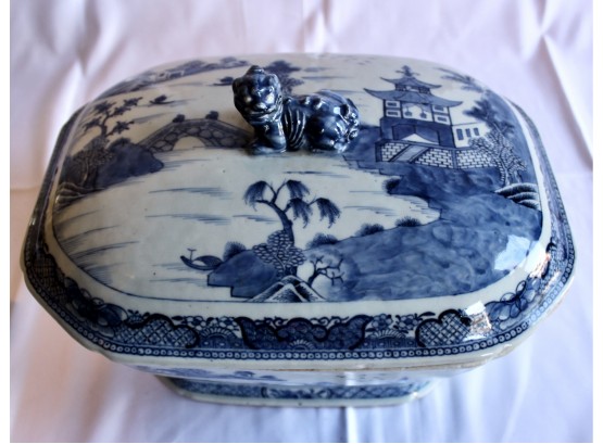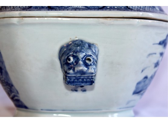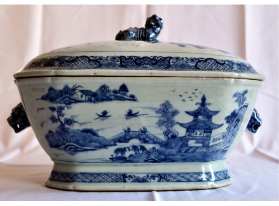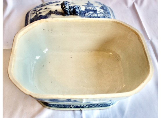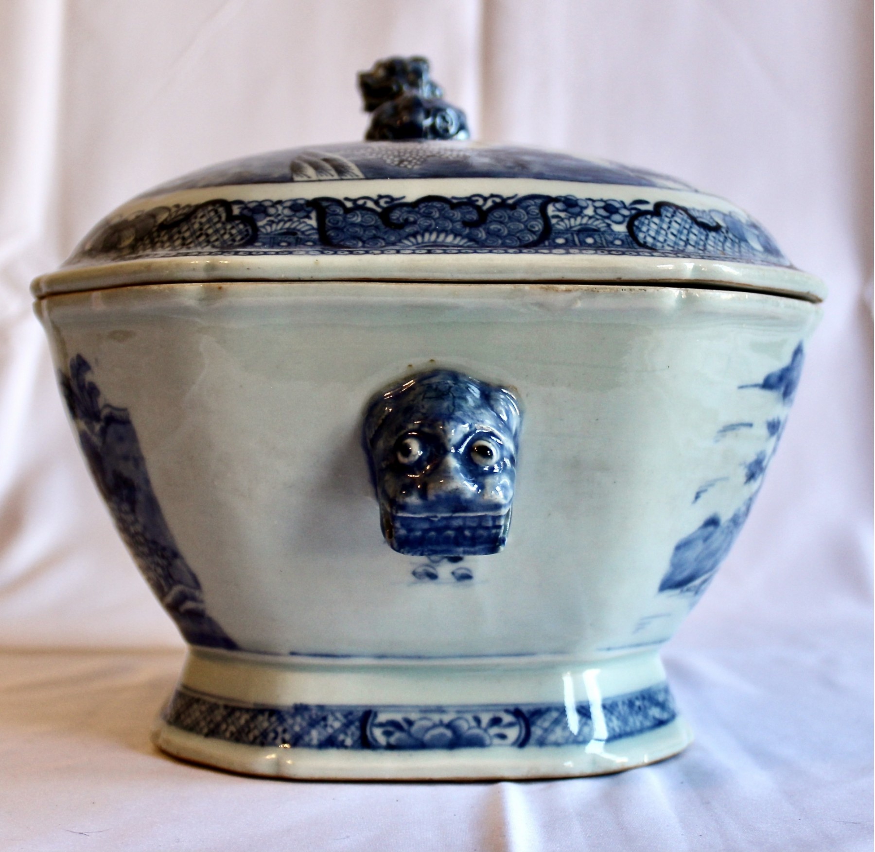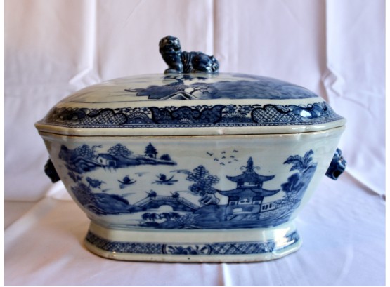 ANTIQUE 19TH CENTURY Chinese Blue & White Canton Octagonal Covered Porcelain Tureen - AMAZING! Decorated in underglazed blue with landscapes, pagodas, bridges and people, birds in flight. Floral scroll and lattice bands, domed cover with foo dog finial and animal masks handles. Please note there is a small chip on the inside of the cover. Please see pictures.