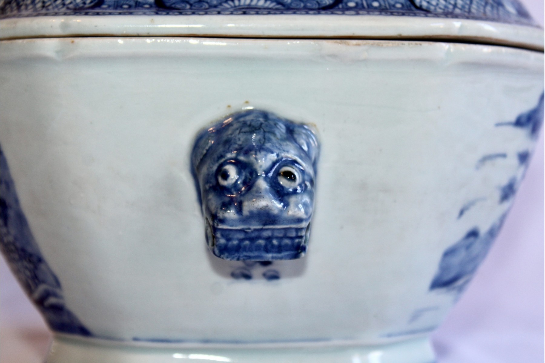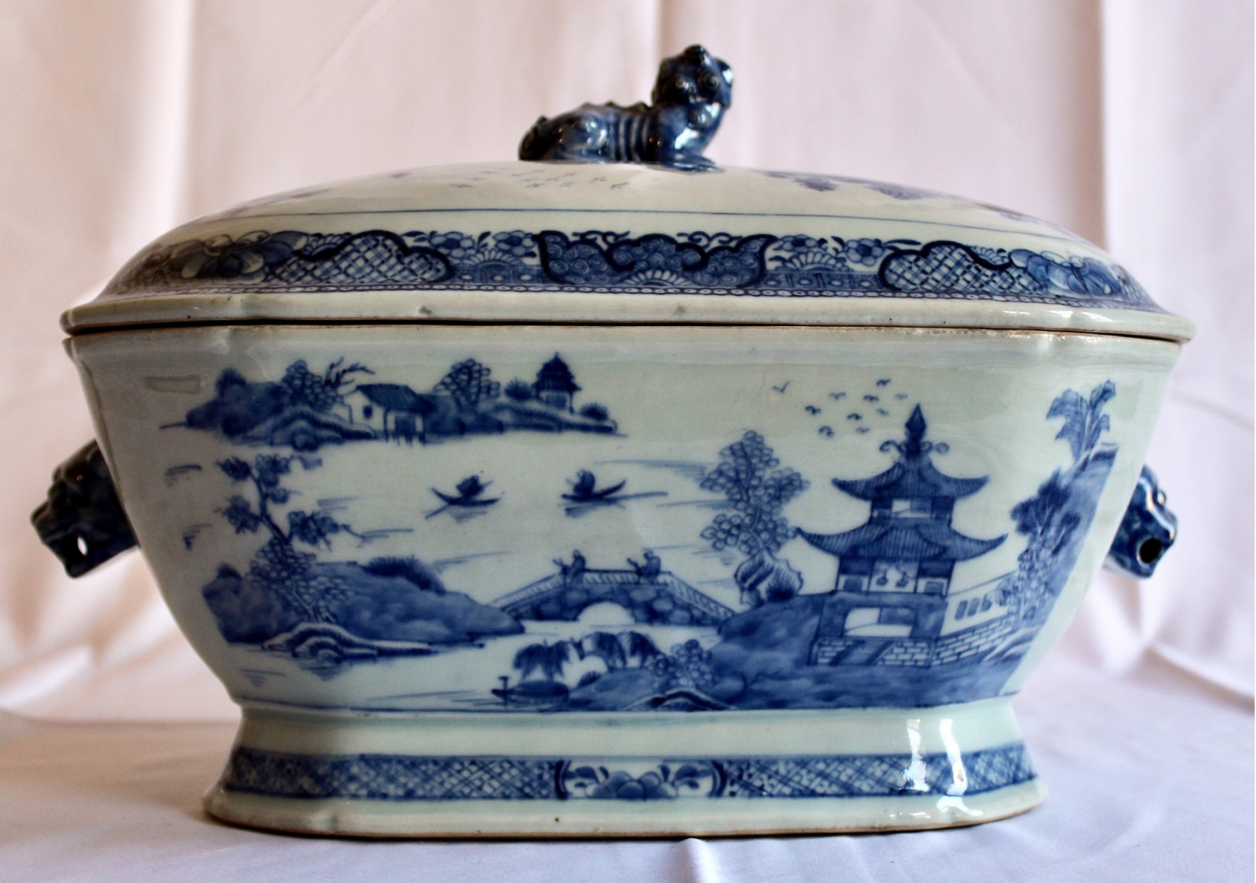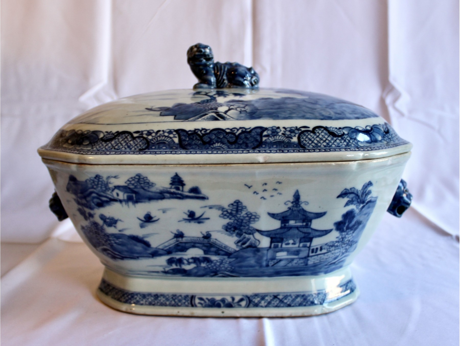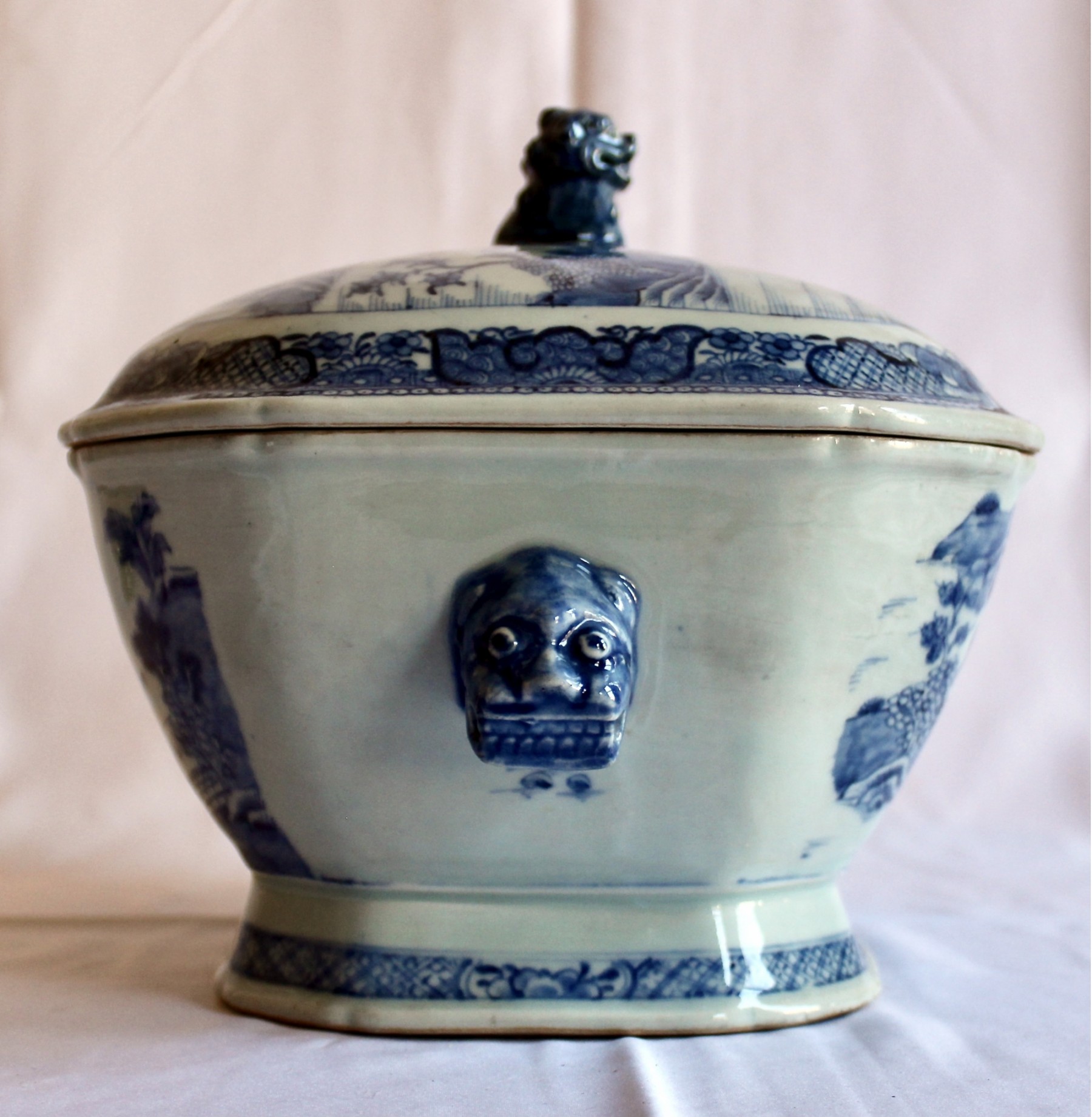 ANTIQUE 19TH CENTURY Chinese Blue & White Canton Octagonal Covered Porcelain Tureen - AMAZING! Decorated in underglazed blue with landscapes, pagodas, bridges and people, birds in flight. Floral scroll and lattice bands, domed cover with foo dog finial and animal masks handles. Please note there is a small chip on the inside of the cover. Please see pictures.