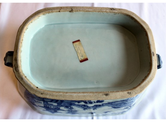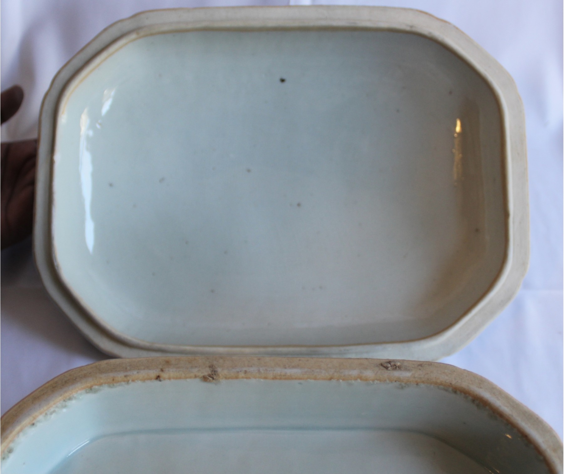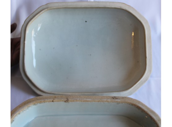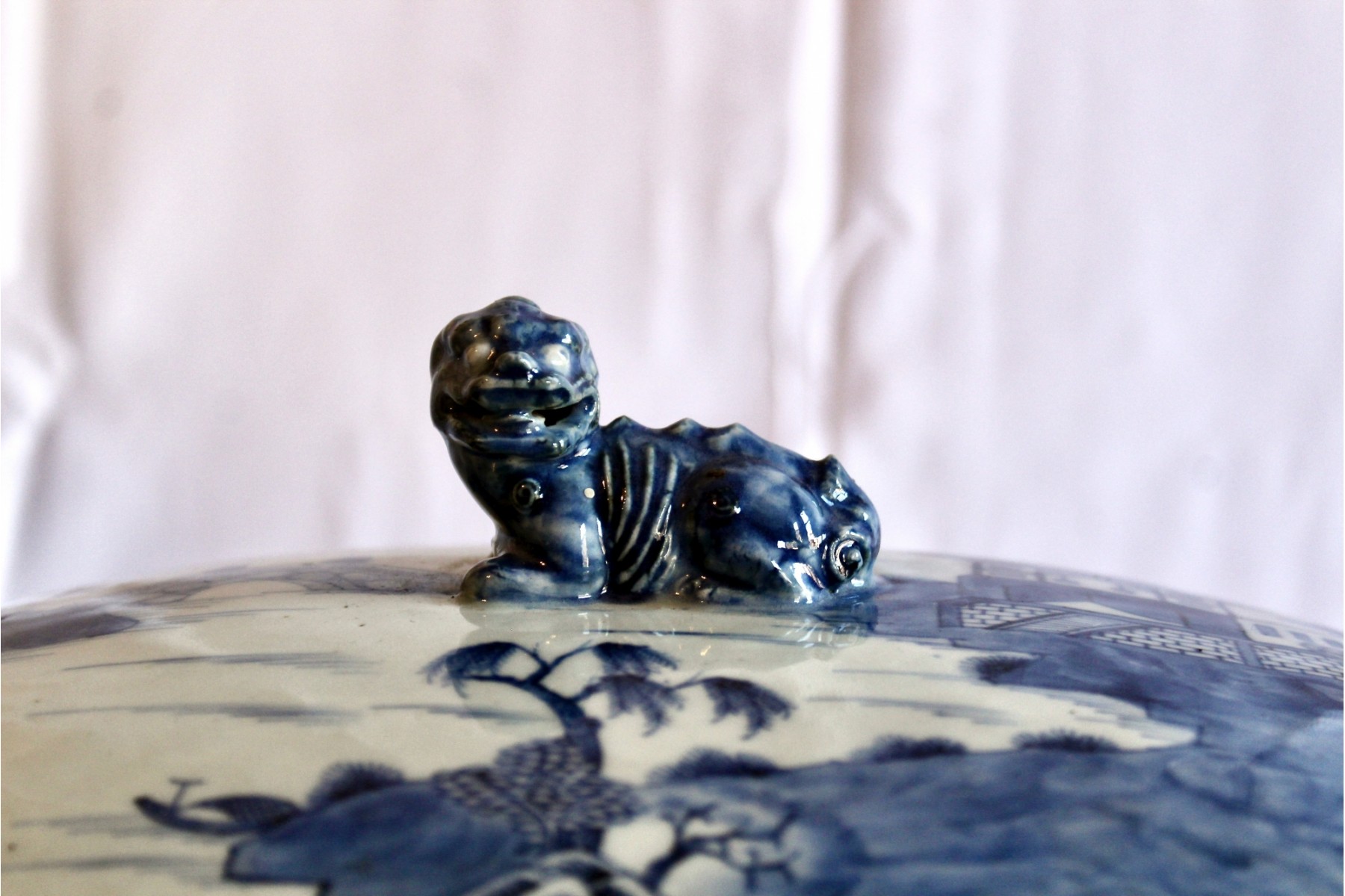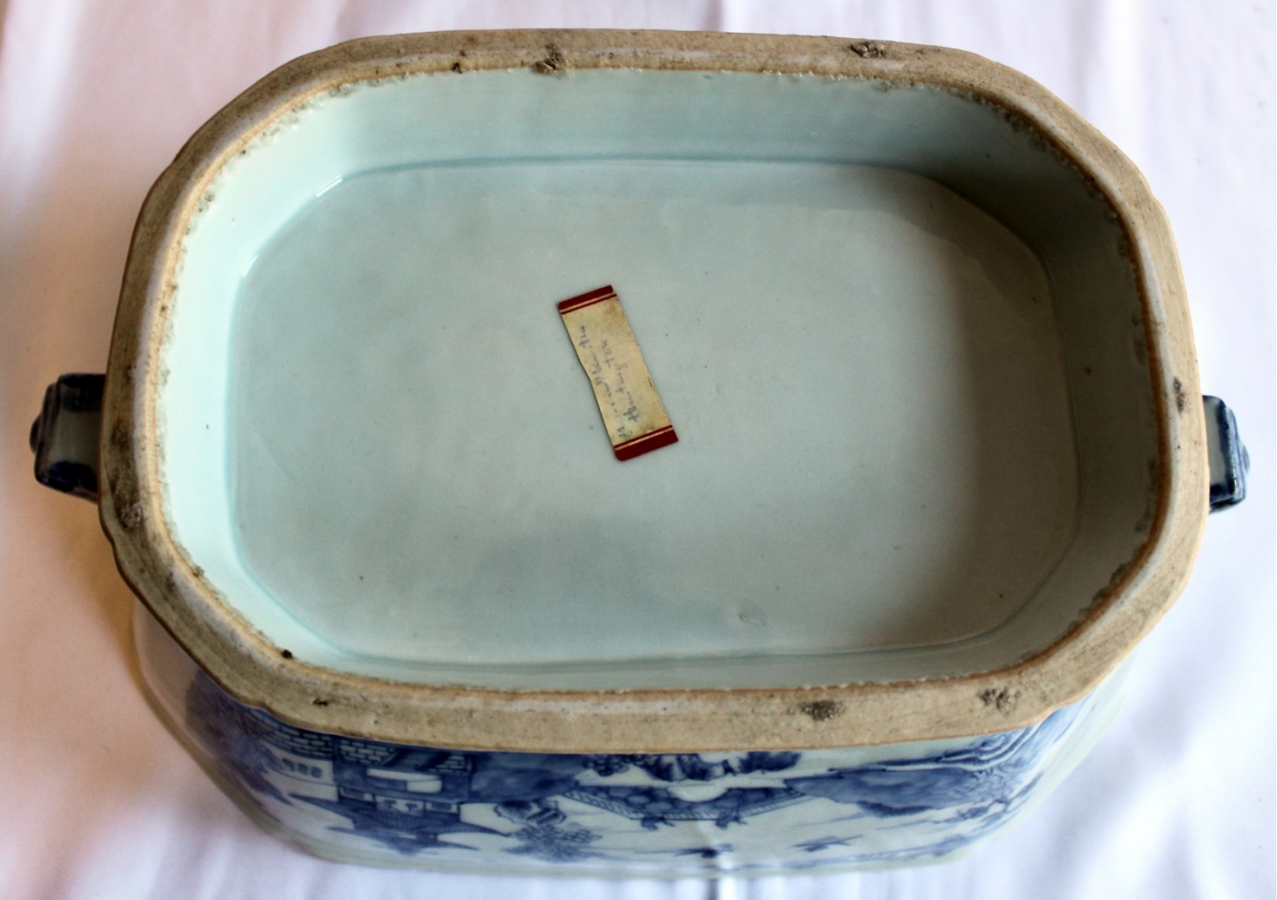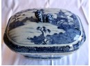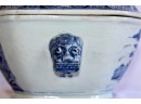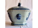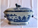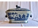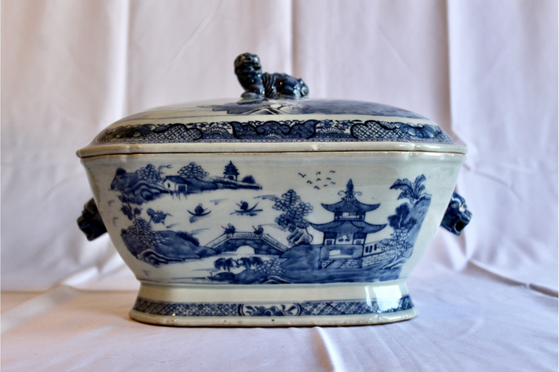ANTIQUE 19TH CENTURY Chinese Blue & White Canton Octagonal Covered Porcelain Tureen - AMAZING! Decorated in underglazed blue with landscapes, pagodas, bridges and people, birds in flight. Floral scroll and lattice bands, domed cover with foo dog finial and animal masks handles. Please note there is a small chip on the inside of the cover. Please see pictures.
