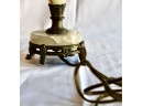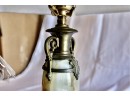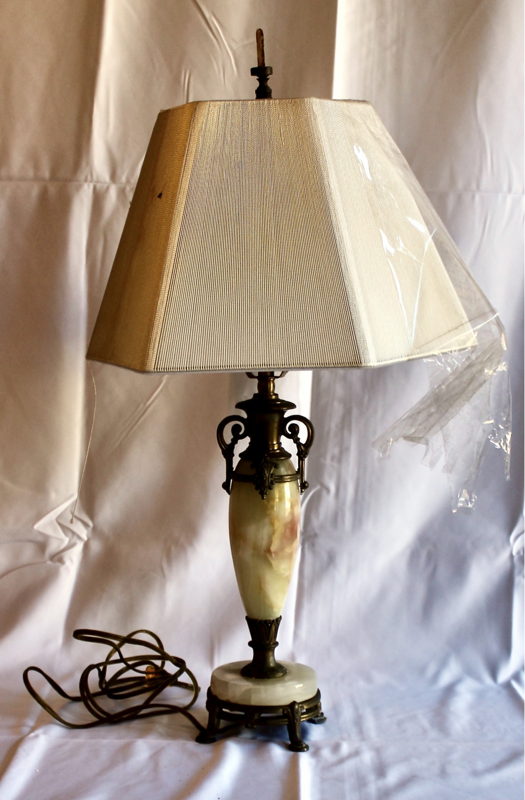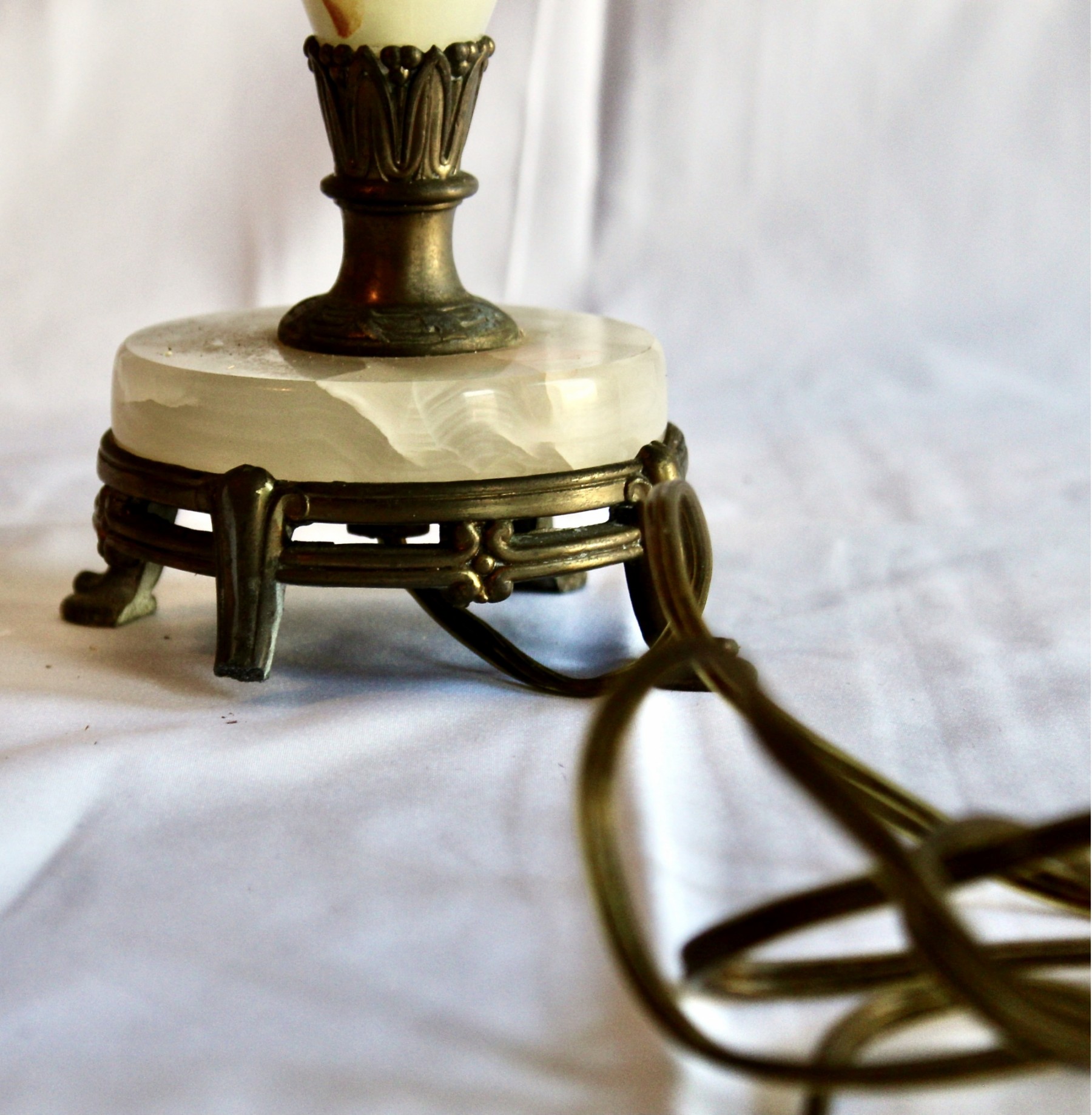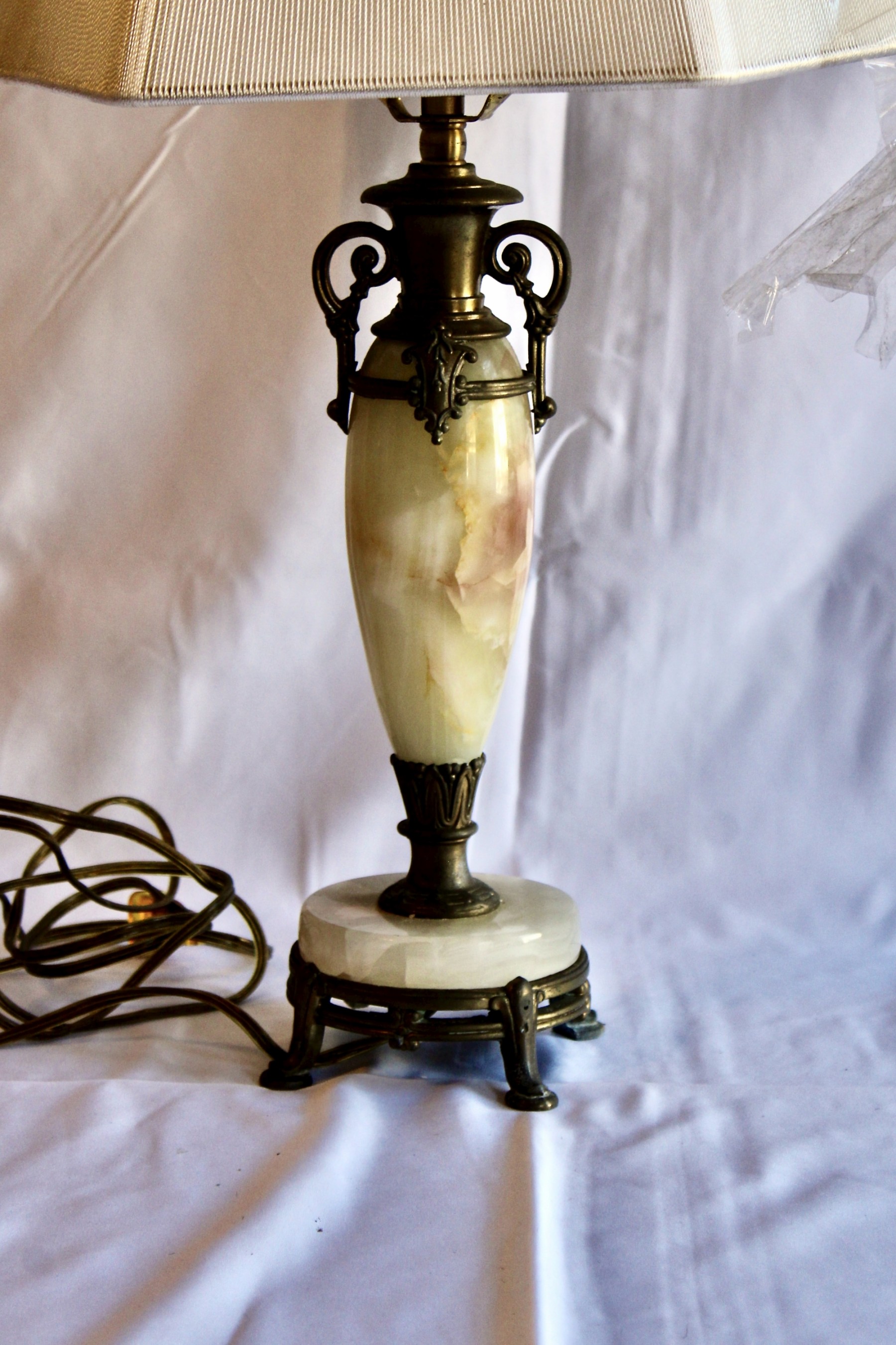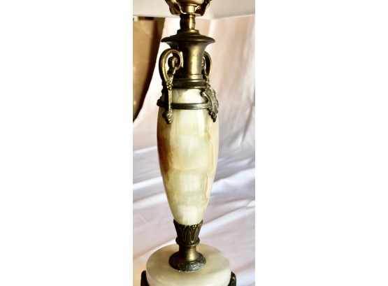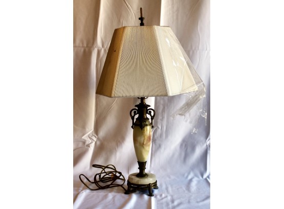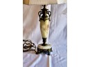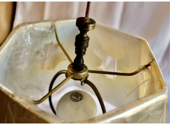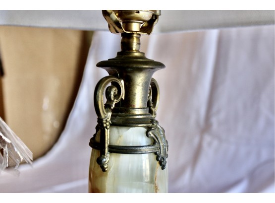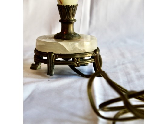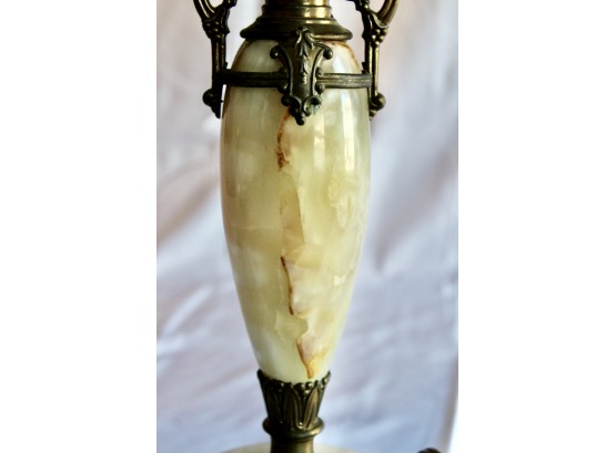 ANTIQUE MARBLE TABLE LAMP - RARE - EXQUISITE DESIGN - UNIQUE FINIAL - WORKS! Please note this lamp is missing one of the legs. Also, the inside of the shade is coming apart, please see pictures.