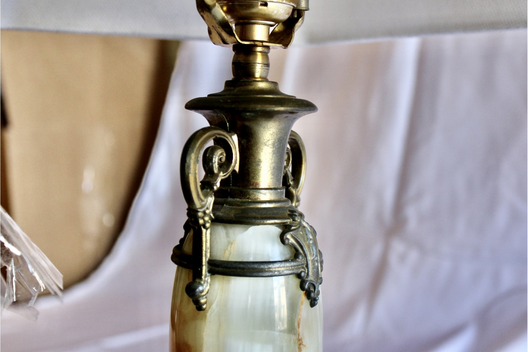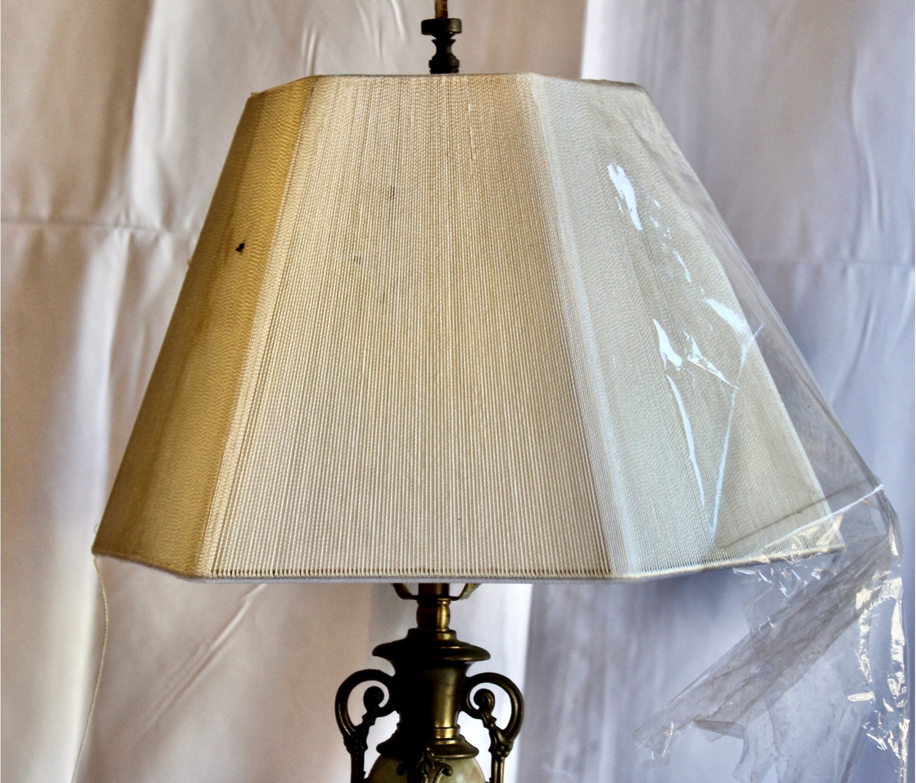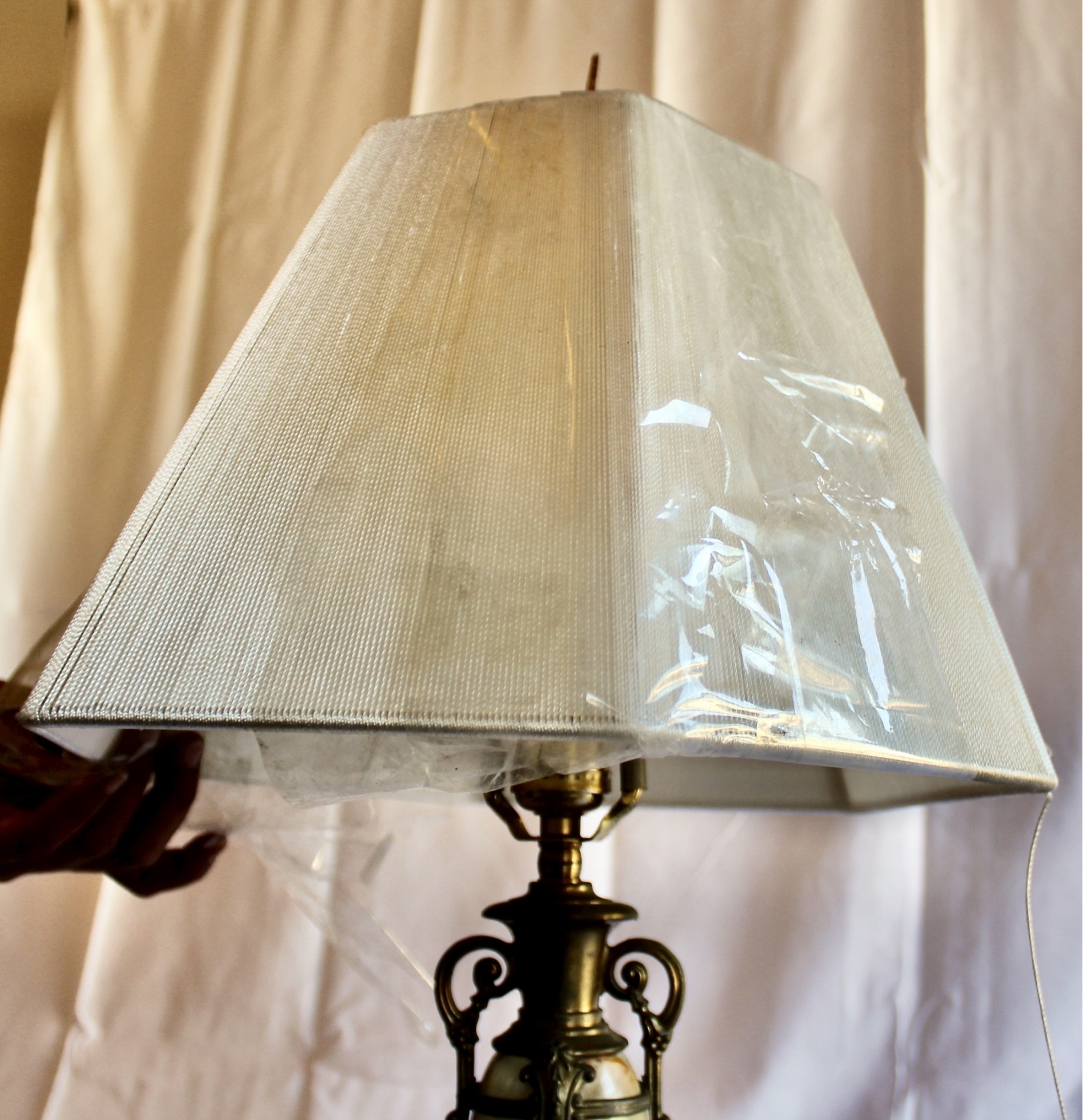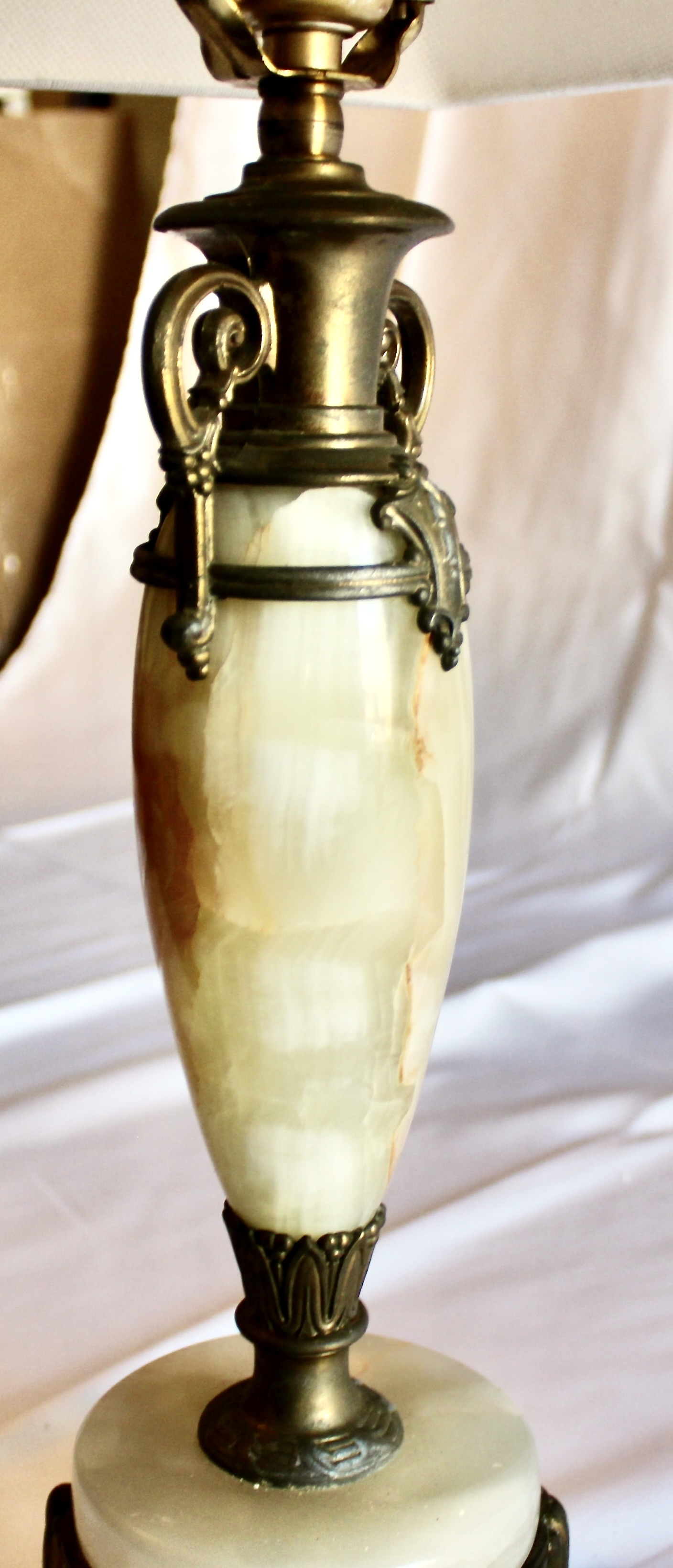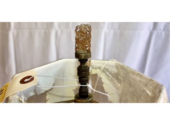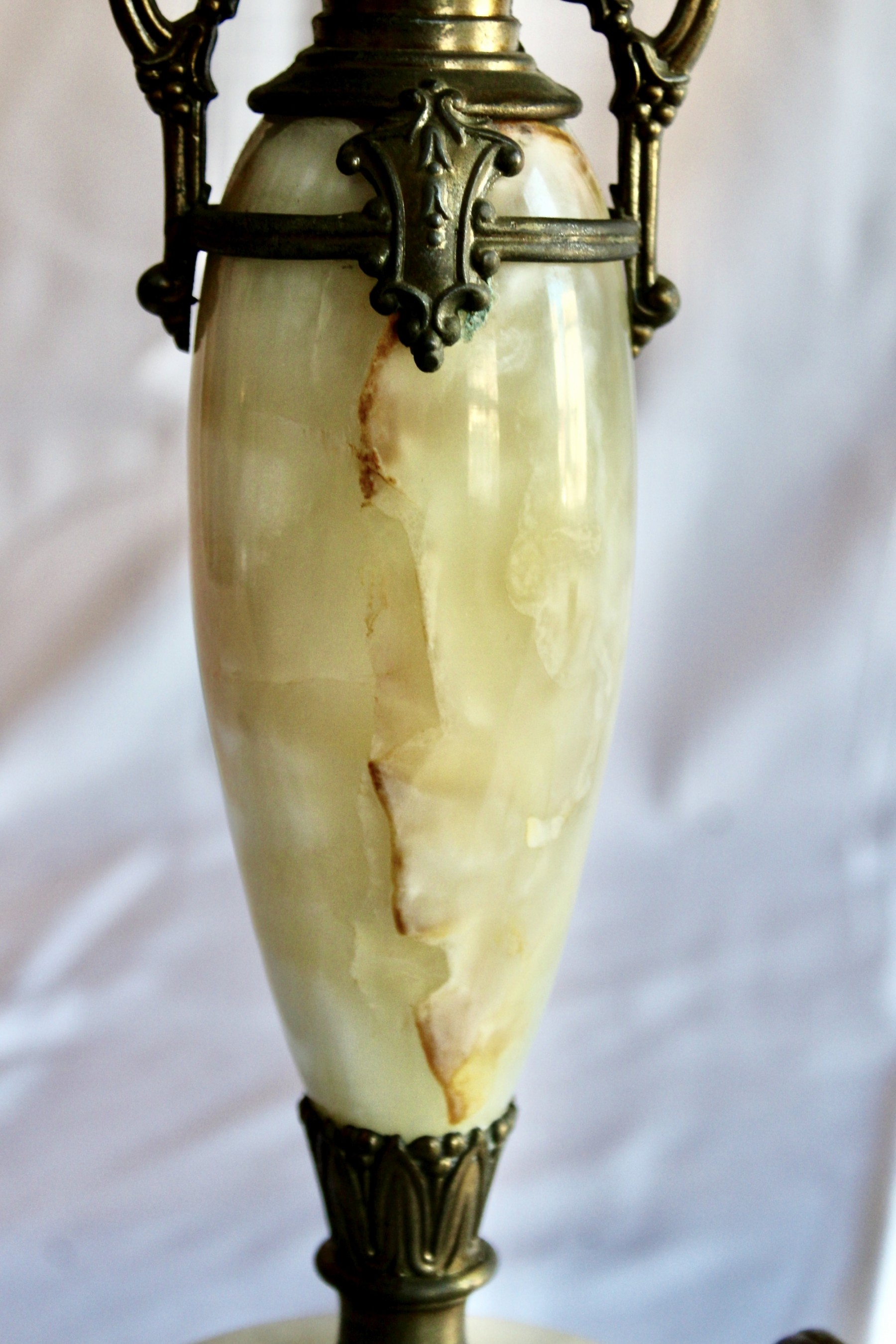ANTIQUE MARBLE TABLE LAMP - RARE - EXQUISITE DESIGN - UNIQUE FINIAL - WORKS! Please note this lamp is missing one of the legs. Also, the inside of the shade is coming apart, please see pictures.