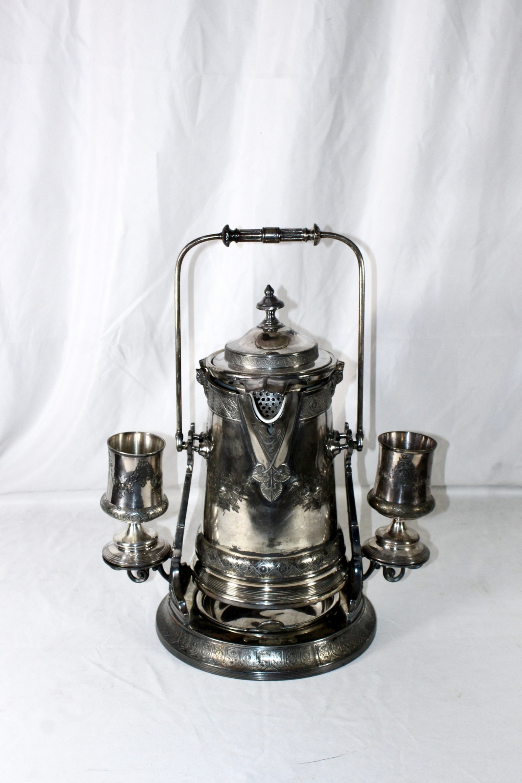 Exquisite silver plated pitcher with matching cups and a ceramic inside container. It was produced here at the Taunton factory at sometime between the mid 19th century and the very early ( Pre WW1 ) 20th Century. Rare to find. The base is marked with the number 140 and the cups are marked with the number 01865.